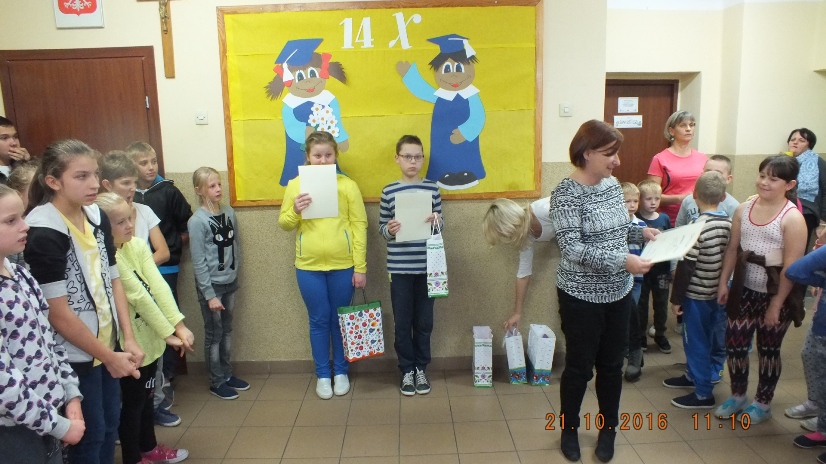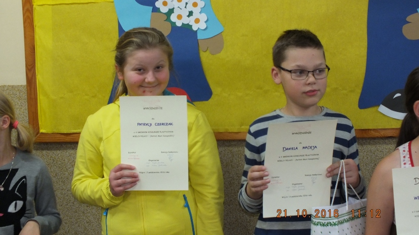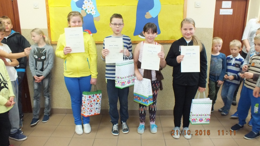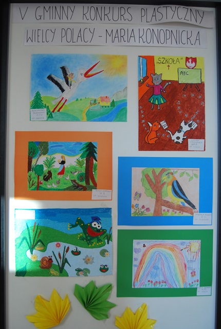13 października 2016 roku w piątą rocznicę nadania imienia Szkole Podstawowej w Wójcinie odbyło się uroczyste podsumowanie V Gminnego Konkursu Plastycznego z cyklu WIELCY POLACY. Bohaterką tegorocznej edycji była MARIA KONOPNICKA. W konkursie brali udział również uczniowie z klas O – VI z naszej szkoły. Cieszymy się, że nasi uczniowie wykazali się olbrzymimi zdolnościami plastycznymi i zajęli miejsca: