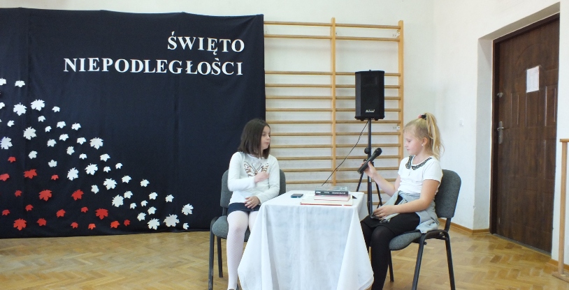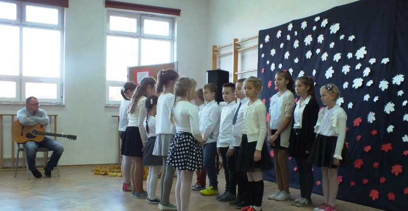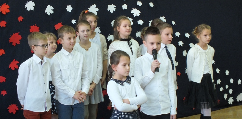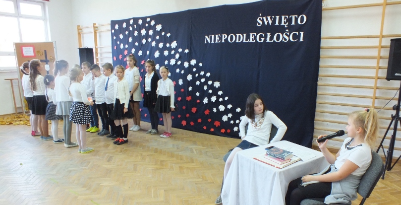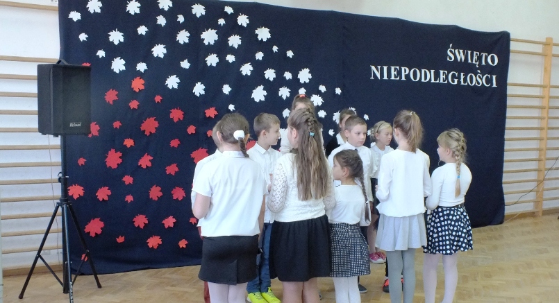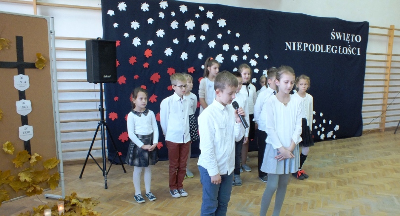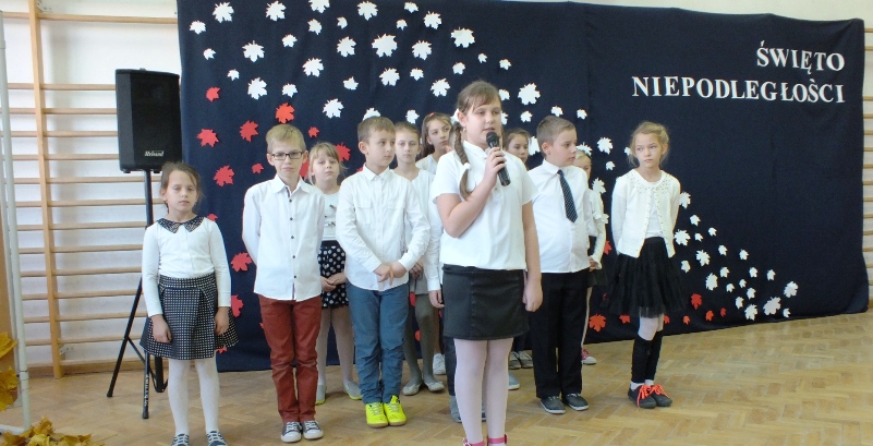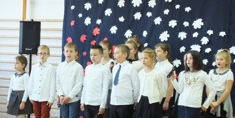 Program artystyczny przygotowany został przez uczniów klasy IV. Uroczystość rozpoczęła się wspólnym odśpiewaniem hymnu państwowego. Scenariusz montażu słowno - muzycznego obejmował treści historyczne, pieśni i wiersze. W bardzo ciekawy i obrazowy sposób przedstawiono losy naszej Ojczyzny, począwszy od zaborów, a skończywszy na roku 1918. Uwagę przyciągała piękna dekoracja. Dzieci z zainteresowaniem i w skupieniu obejrzały i wysłuchały tej szczególnej lekcji historii.