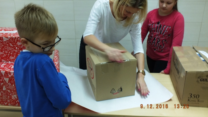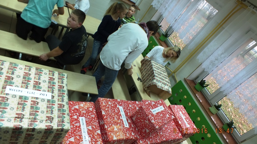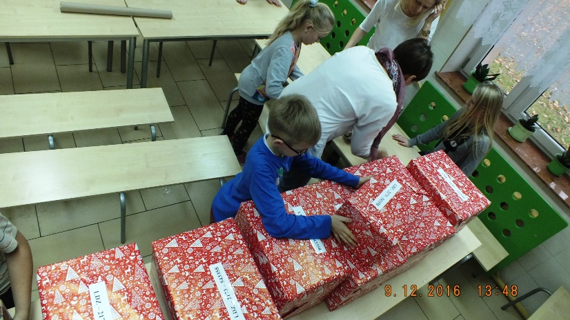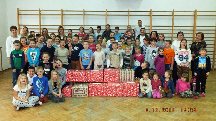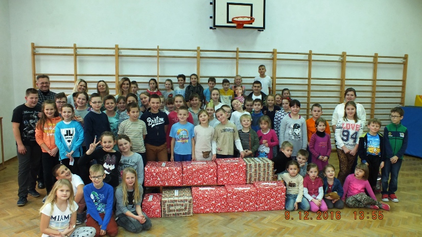 W przekazaniu paczki uczestniczyły dzieci, przedstawiciele rodziców i nauczycieli oraz pani dyrektor Sylwia Sarna-Jurek. Odbyło się to w sobotę 10 grudnia 2016 roku w czasie tzw. weekendu cudów. Nasza paczka trafiła do wolontariuszy pracujących w Zespole Szkół Samorządowych w Opocznie, którzy dostarczą ją do potrzebującej rodziny.