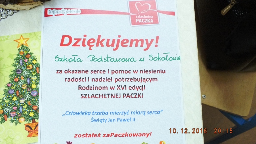 W tym roku Szkoła Podstawowa w Sokołowie po raz pierwszy przystąpiła do „Szlachetnej paczki”. Aktywnie zaangażowała się cała społeczność szkolna. Dzięki zrozumieniu rodziców, uczniowie przynieśli artykuły spożywcze i środki czystości. Nauczyciele sfinansowali zakup obuwia, książek i gry oraz dostarczyli produkty żywnościowe i czystościowe. Przygotowana przez nas paczka to coś więcej niż pomoc materialna. To znak, że potrzebujący są dla nas ważni. Uwierzyliśmy w ludzi po to, aby oni mogli uwierzyć w siebie. Akcja miała również walor wychowawczy, była doskonałą okazją do promowania postaw prospołecznych wśród uczniów.
