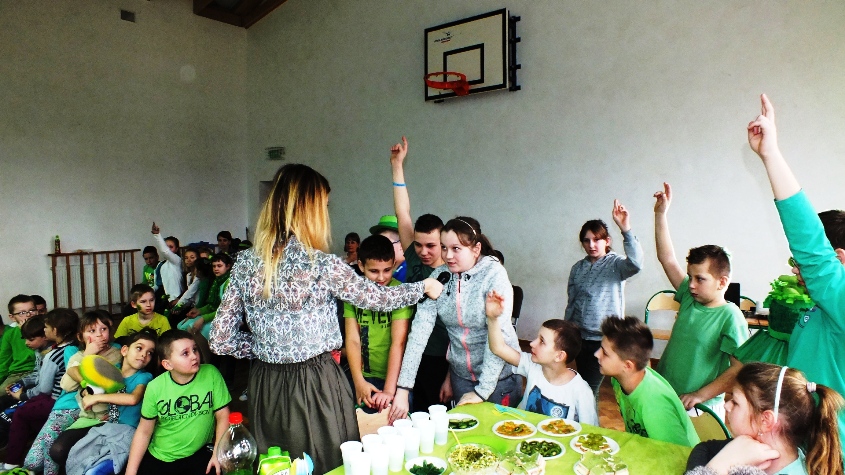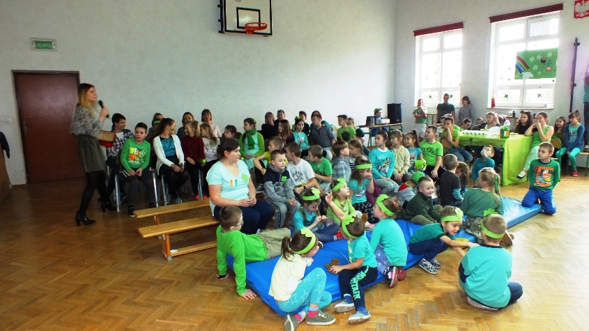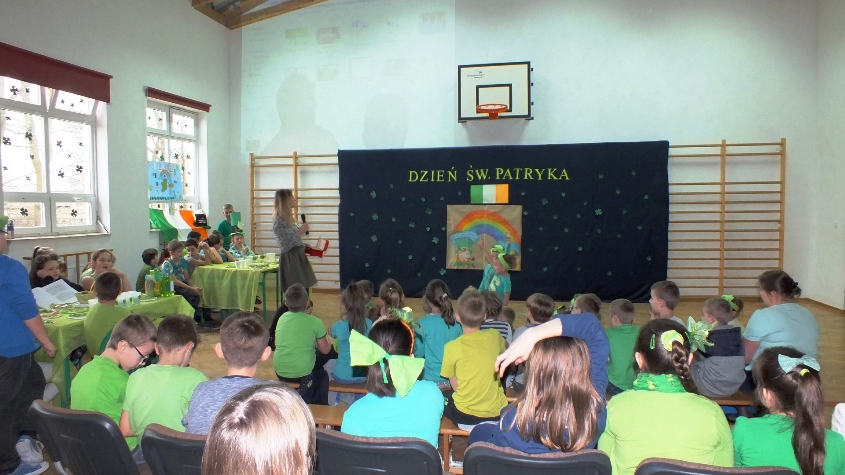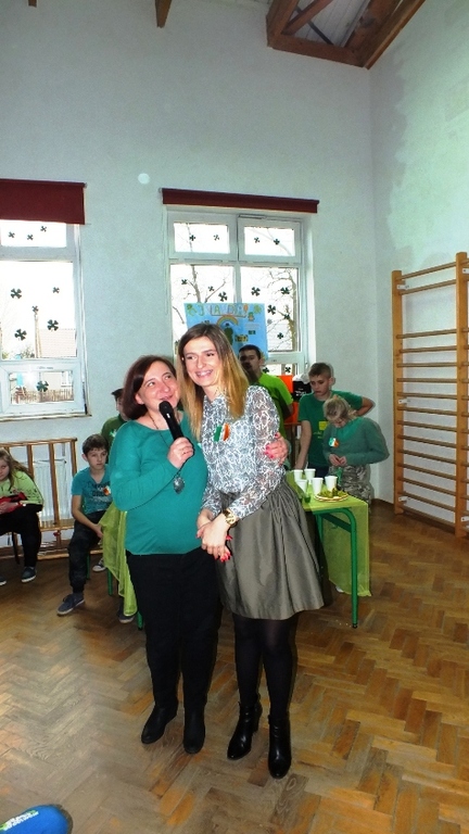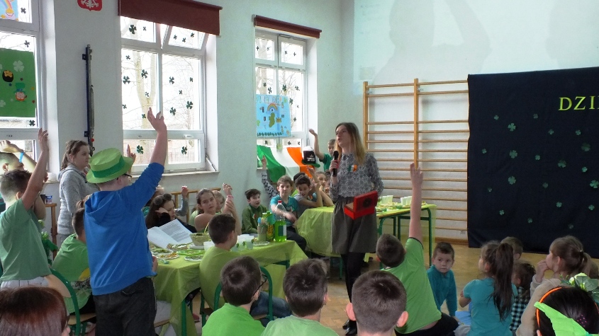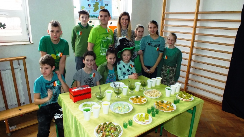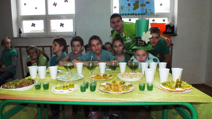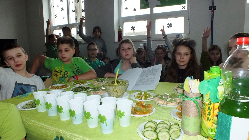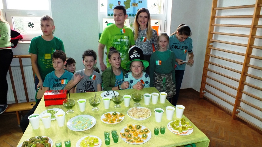 Dlatego też uczniowie chętnie przyłączyli się do wspólnej organizacji. Klasy V i VI przygotowały „Irlandzkie stoiska” prezentujące symbole tego kraju oraz „zielone smakołyki”. Odbył się również konkurs na najciekawsze zielone przebranie. Pierwsze miejsce zdobyła uczennica klasy czwartej Kornelia Krawczyk, drugie Zuzanna Kędziora , trzecie ex aequo Weronika Grudnik oraz Izabela Sykurska.