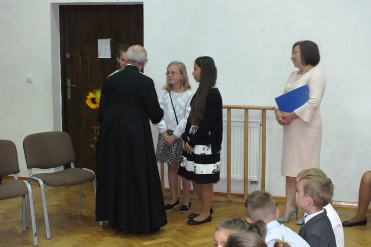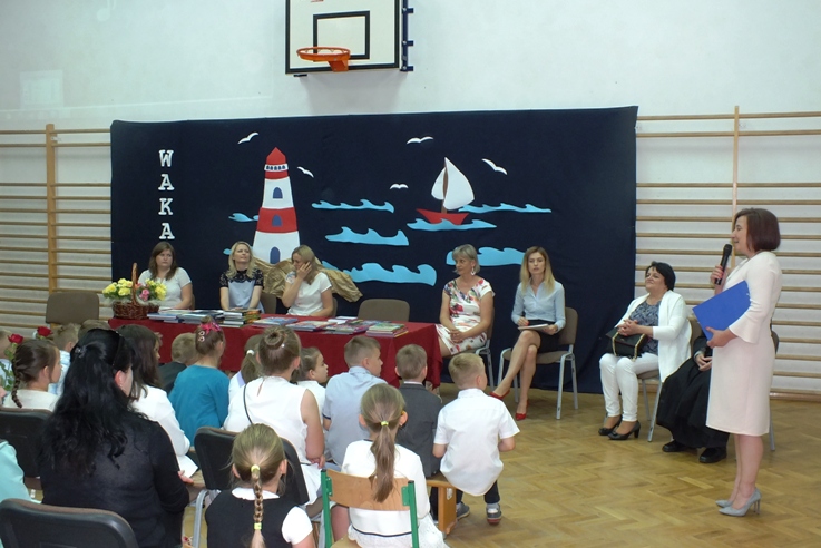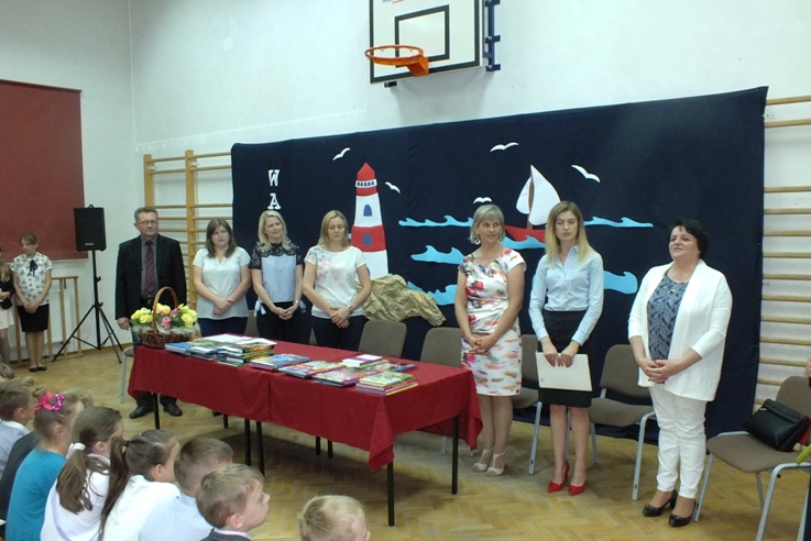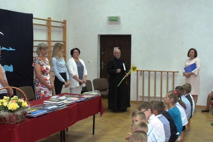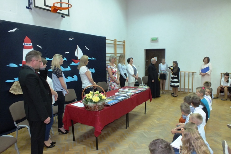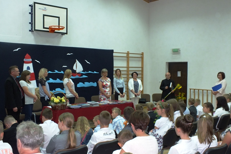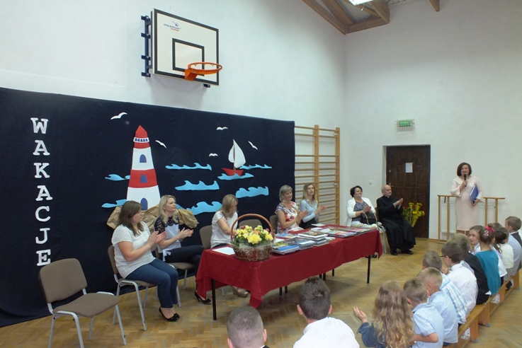 Uroczystość rozpoczęła się prezentacją przedstawiającą najwazniejsze wydarzenia w szkole. Nastepnie ksiądz Jan Medaj otrzymał pamiątkową książkę z okazji rocznicy przyjęcia święceń kapłańskich. Najlepsi uczniowie przyjęli nagrody z rąk p. dyrektor i wychowawców klas. Uczniom klasy czwartej wręczono upragnione karty rowerowe. Pani dyrektor Sylwia Sarna-Jurek podziękowała członkom Rady Rodziców, nauczycielom i uczniom za dobrą współpracę w ciągu całego roku.