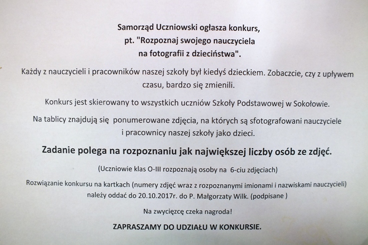 14 nauczycieli i 4 pracowników szkoły przyniosło swoje zdjęcia z dzieciństwa, które zostały zaprezentowane na wystawie. Uczniowie mieli tydzień na rozpoznanie, kto się na nich kryje. W konkursie wzięło udział 12 uczniów, którzy różnie typowali. Najlepiej poradziła sobie z tym zadaniem uczennica klasy VII- Małgosia Kałużyńska, która potrafiła poprawnie wskazać 12 osób. Przeciętnie uczestnicy konkursu odgadywali poprawnie od 9-10 osób.
