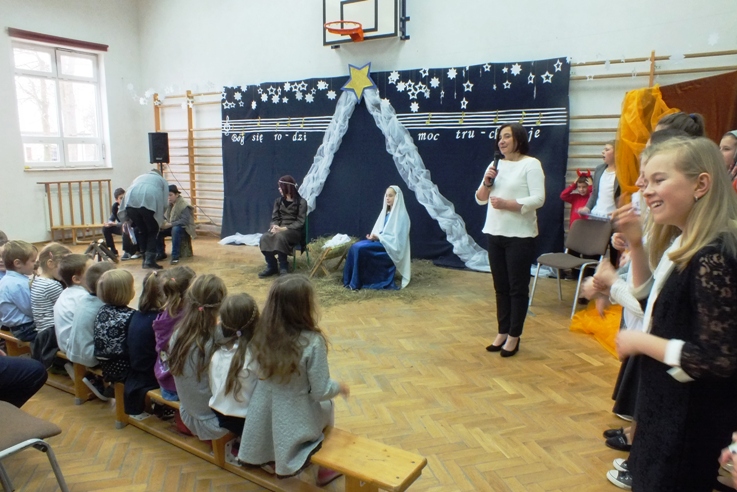 O wyznaczonej godzinie uczniowie, nauczyciele i zaproszeni goście: Wójt Gminy Paradyż Wojciech Rudalski, Ks. Proboszcz Adam Myszkowski, radny Karol Sowa, sołtys Sokołowa i Grzymałowa Józef Słowicki, P. Anna Nowak, P. Halina Biniek, P. Jolanta Gajzler oraz P. Marta Karpiej udali się na salę, gdzie odbyły się jasełka przygotowane przez uczniów klasy V, VI, VII i II pod kierunkiem P. A. Gliszczyńskiej. Młodzi aktorzy wspaniale wcielili się w postacie: