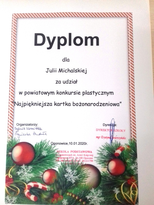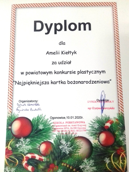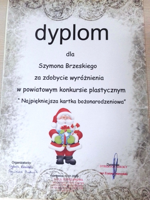 W dniu 10 stycznia 2020 roku w Szkole Podstawowej w Ogonowicach odbyło się podsumowanie konkursu plastycznego “Najpiękniejsza kartka bożonarodzeniowa”. Konkurs miał zasięg powiatowy i był skierowany do dzieci w wieku 5,6 lat. Udział w konkursie wzięło 11 placówek, zarówno szkoły, jak i przedszkola. Każda placówka mogła nadesłać trzy prace konkursowe. Z naszej szkoły były to prace: Amelii Kiełtyk, Julii Michalskiej i Szymona Brzeskiego. Naszym wyróżnionym i nagrodzonym laureatem został Szymon Brzeski.