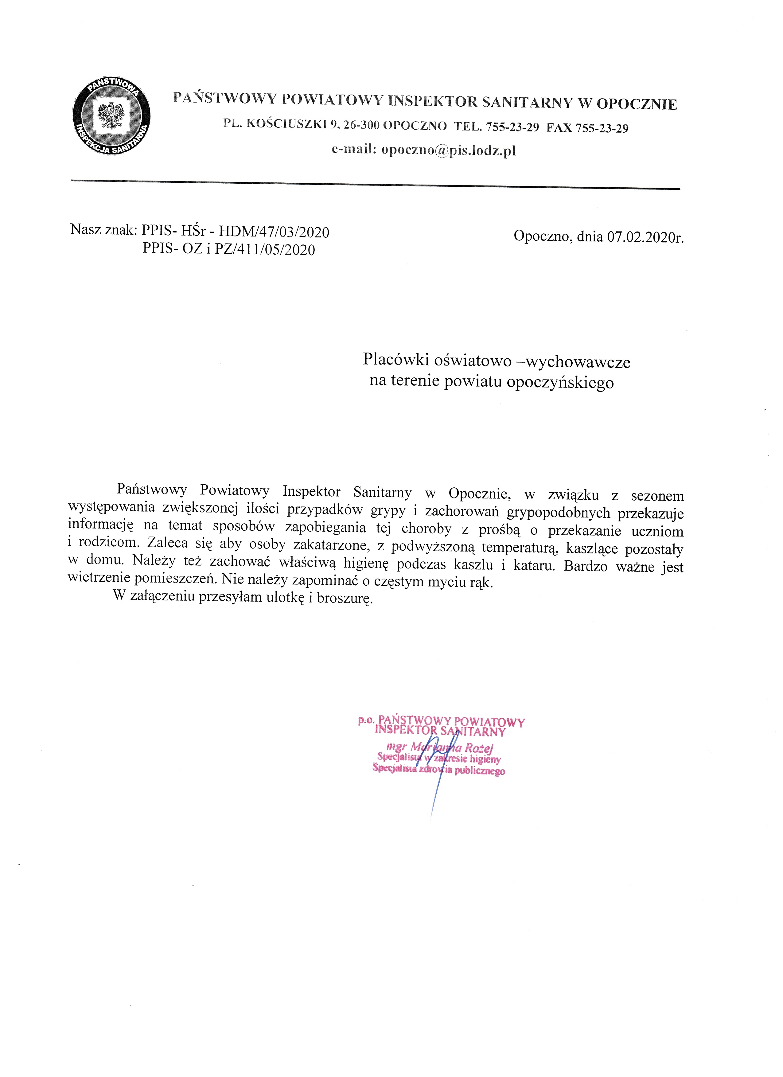 Nie lekceważ grypy – chroń siebie i innych - przy wystąpieniu objawów takich jak gorączka, bóle głowy, bóle mięśniowo-stawowe, kaszel, ból gardła niezwłocznie skontaktuj się z lekarzem. W przypadku podejrzenia lub rozpoznania grypy nie idź do pracy, pozostań w domu aż do ustąpienia objawów. Chore dziecko otocz szczególną opieką , nie wysyłaj go do szkoły.