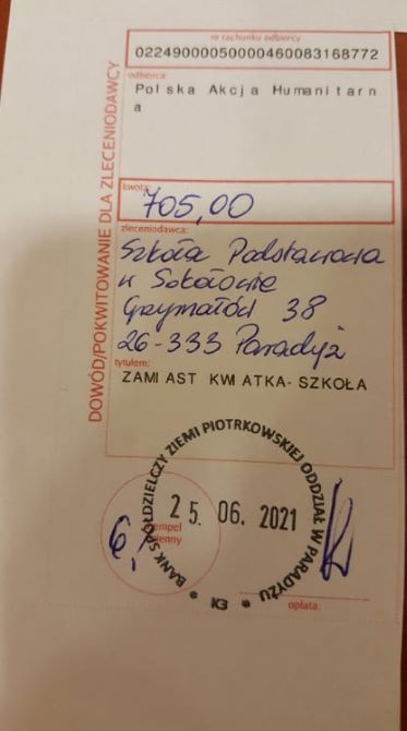W dniu 25 czerwca 2021 r. wolontariusze Szkolnego Koła Wolontariatu za zgodą Pani Dyrektor i w porozumieniu z Gronem Pedagogicznym zorganizowali akcję charytatywną „Zamiast Kwiatka Niosę Pomoc!”, która polegała na zbiórce funduszy dla Polskiej Akcji Humanitarnej z przeznaczeniem dla Somalii. Uczniowie zamiast wręczania kwiatów swoim nauczycielom na zakończenie roku mogli przekazać pieniążki do puszki. Przedsięwzięcie poprzedzała realizacja programów „Wiem i Działam” oraz „Godziny Wychowawcze ze Światem” na zajęciach z wychowawcą w klasach V i VI. Cykl zajęć o mądrym pomaganiu, kryzysach i pomocy humanitarnej z pewnością przyczynił się do zwiększenia świadomości globalnych problemów z jakimi borykają się mieszkańcy wielu państw, w tym także Somalii. Trudne warunki bytowe, katastrofy klimatyczne, długotrwałe susze, gwałtowne powodzie i konflikty zbrojne prowadzą do przemieszczania się ludzi i powodują problemy z zaspokajaniem podstawowych potrzeb życiowych takich jak: woda, jedzenie, schronienie.