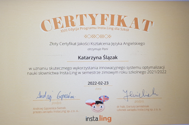 Wraz z końcem roku szkolnego 2021/22 zakończyła się XVII (zimowa) oraz XVIII (letnia) Edycja Programu Insta.Ling dla Szkół, z możliwości których chętnie korzystali uczniowie klas IV-VIII Szkoły Podstawowej w Sokołowie. W uznaniu skutecznego wykorzystania innowacyjnego systemu optymalizacji nauki słownictwa uczniowie wraz z koordynatorką, nauczycielką języka angielskiego, p. Katarzyną Ślązak otrzymali Złoty Certyfikat Jakości Kształcenia Języka Angielskiego. Jest to uhonorowanie całorocznej, codziennej pracy z systemem umożliwiającym utrwalanie słownictwa w sposób interesujący i skuteczny. Jest to również zachęta i motywacja do podobnego działania w przyszłym roku szkolnym.