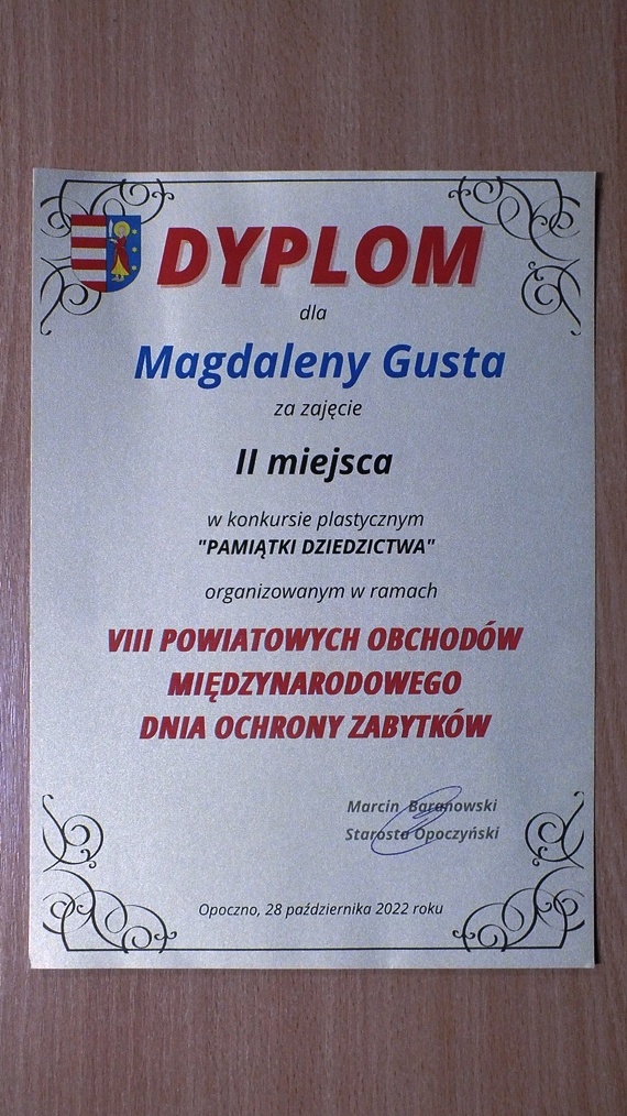 W dniu 28 października 2022r.w siedzibie Starostwa Powiatowego w Opocznie odbyło się uroczyste podsumowanie konkursu plastycznego „Pamiątki dziedzictwa”zorganizowanego w ramach VIII Powiatowych Obchodów Międzynarodowego Dnia Ochrony Zabytków „OPOCZNO 2022”. Konkurs cieszył się bardzo dużym zainteresowaniem. Przed wręczeniem nagród zebrani na sali konferencyjnej zobaczyli prezentację z nagrodzonymi pracami, a następnie p. Marcin Baranowski – Starosta Opoczyński w towarzystwie gości wręczył nagrody w poszczególnych kategoriach tematycznych i wiekowych.