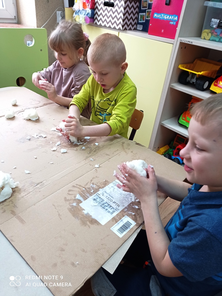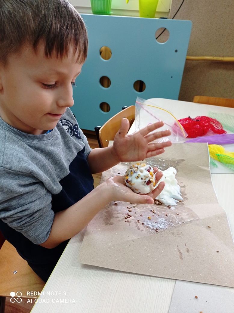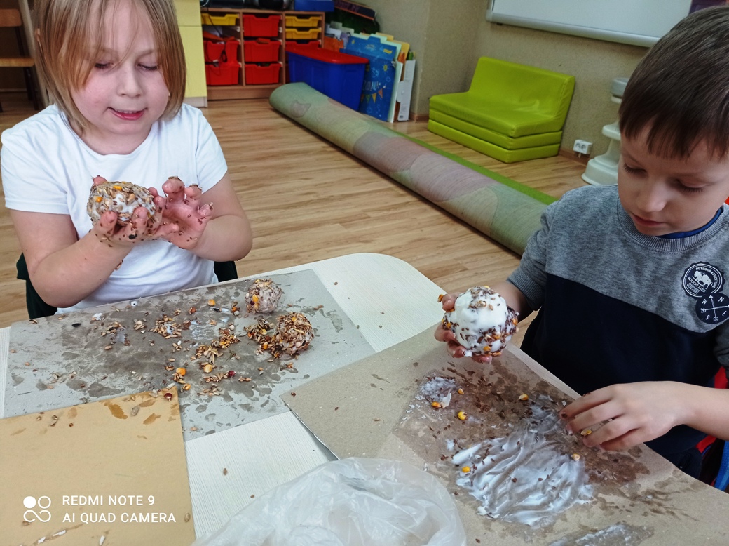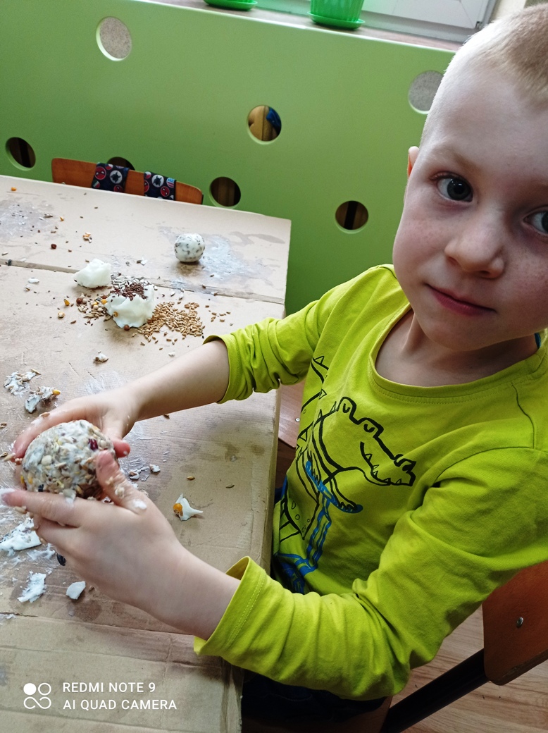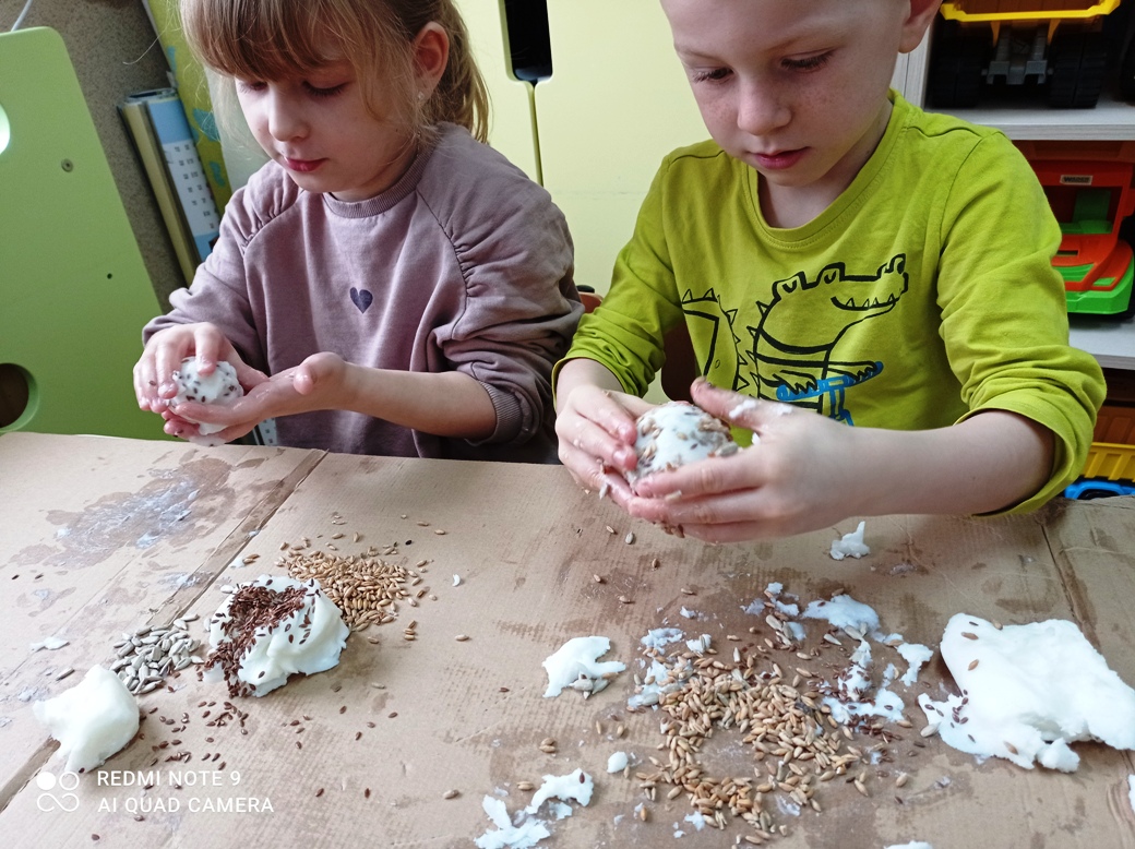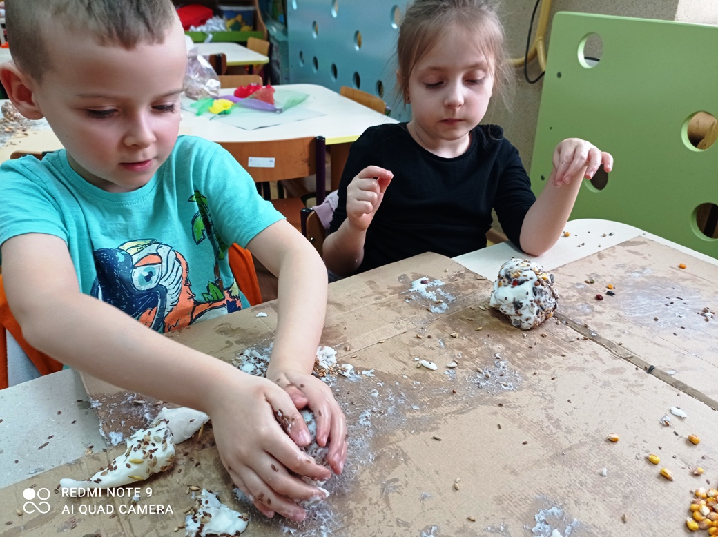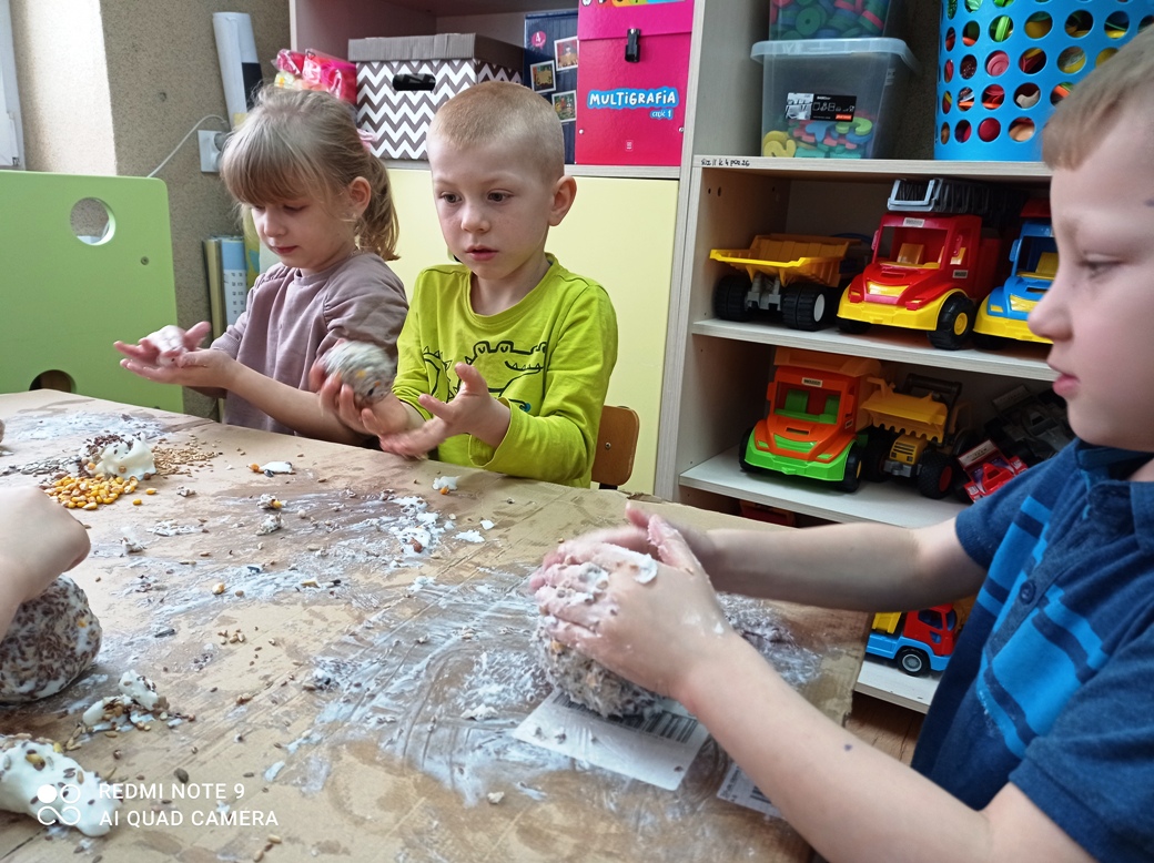 Dzieci z oddziału przedszkolnego wspólnie wykonały kule dla ptaków ze smalcu i wcześniej przyniesionych nasion. Była to też wspaniała okazja do zajęć sensorycznych- prawie wszystkie dzieci pierwszy raz poczuły zapach smalcu (który nie wszystkim się spodobał) oraz musiały własnoręcznie połączyć smalec z ziarnami, co pobudzało sensory znajdujące się w dłoniach. Na koniec wspólnie udaliśmy się do ogrodu, gdzie zawiesiliśmy nasze kule. Okoliczne ptaki chętnie zagościły na tych drzewach, korzystając z zaproponowanych smakołyków. Dzieci z wielkim zainteresowaniem obserwowały przez przedszkolne okna przylatujące ptaki.