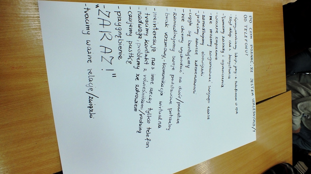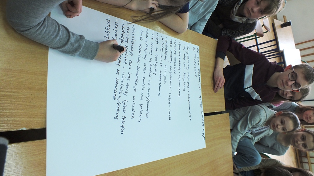 Dnia 29 marca w naszej szkole odbyły się profilaktyczne warsztaty dotyczące fonoholizmu. Wraz z Panią Patrycją Olędzką i Panią Aleksandrą Kopytowską z Poradni Psychologiczno-Pedagogicznej w Opocznie rozmawialiśmy o wadach i zaletach postępującej technologii. Pracowaliśmy w grupach metodą burzy mózgów. Wspólnie poszerzaliśmy swoją wiedzę dotyczącą higieny cyfrowej. Myślę, że dla wszystkich były to wspaniałe warsztaty, które pomogę nam zmienić złe nawyki na lepsze.
