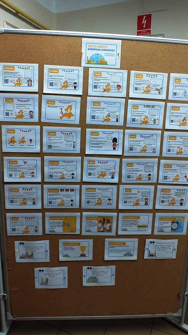 Od kilku lat nasza szkoła bierze udział w obchodach Europejskiego Dnia Języków 26 września. W tym roku włączyliśmy się do Ogólnopolskiego Projektu Edukacyjnego „European Day of Languages Festival”organizowanego przez Didacto Polska. Była to okazja by pogłębić wiedzę na temat języków europejskich. Uczniowie klasy piątej, szóstej i siódmej wzięli udział w quizie sprawdzającym wiedzę o państwach europejskich, oraz zabawach przybliżających kulturę tychże krajów. Ponadto, wiele osób założyło w tym dniu ubrania z napisami w obcych językach, które współnie tłumaczyliśmy na lekcjach języka angielskiego oraz graliśmy wykonywaliśmy zadania w języku angielskim i poznawaliśmy zalety wielojęzyczności. Całość uświetniła gazetka dotyczącą ciekawostek o wybranych językach oraz motywujących cytatów. Obchody tego dnia przygotowała nauczycielka języka angielskiego p. Katarzyna Ślązak.