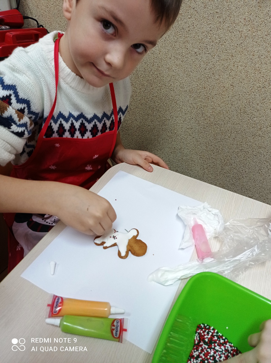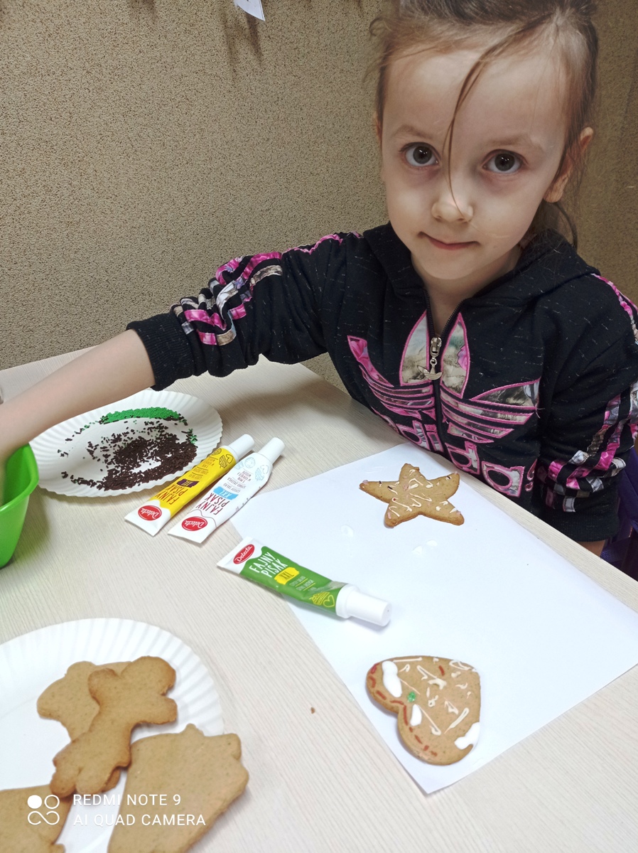 Najbardziej oczekiwanym przez dzieci momentem było dekorowanie pierniczków. Polewanie lukrem, czekoladą, posypywanie kolorowymi groszkami, dekoracjami, malowanie cukrowymi pisakami - to była największa frajda! Każde ciasteczko dekorowane wg fantazji dzieci stawało się małym cudeńkiem. Był to naprawdę mile spędzony czas w przedszkolu podczas którego dzieci pracowały i jednocześnie świetnie się bawiły. Przyjemnie było piec ciasteczka a jeszcze przyjemniejsza będzie ich degustacja.