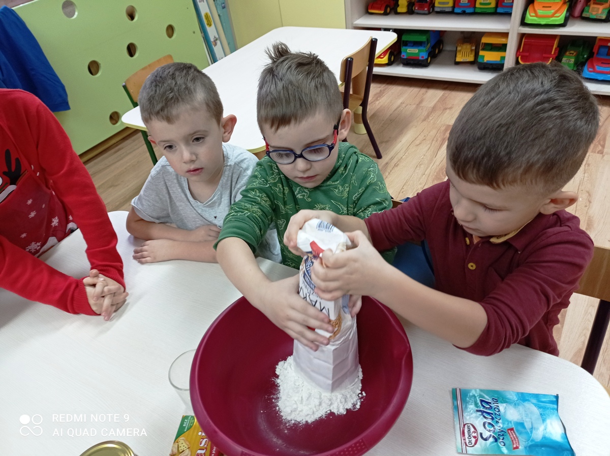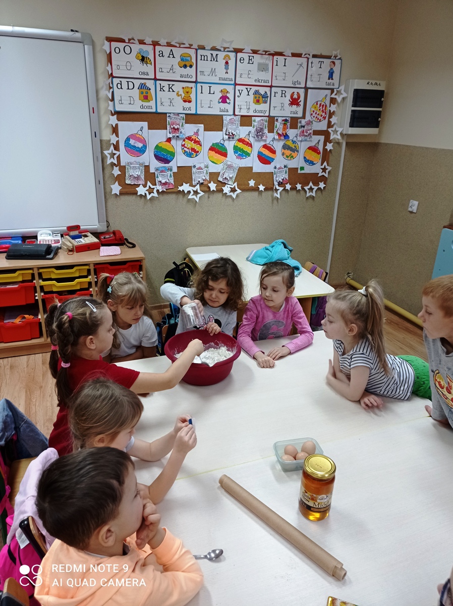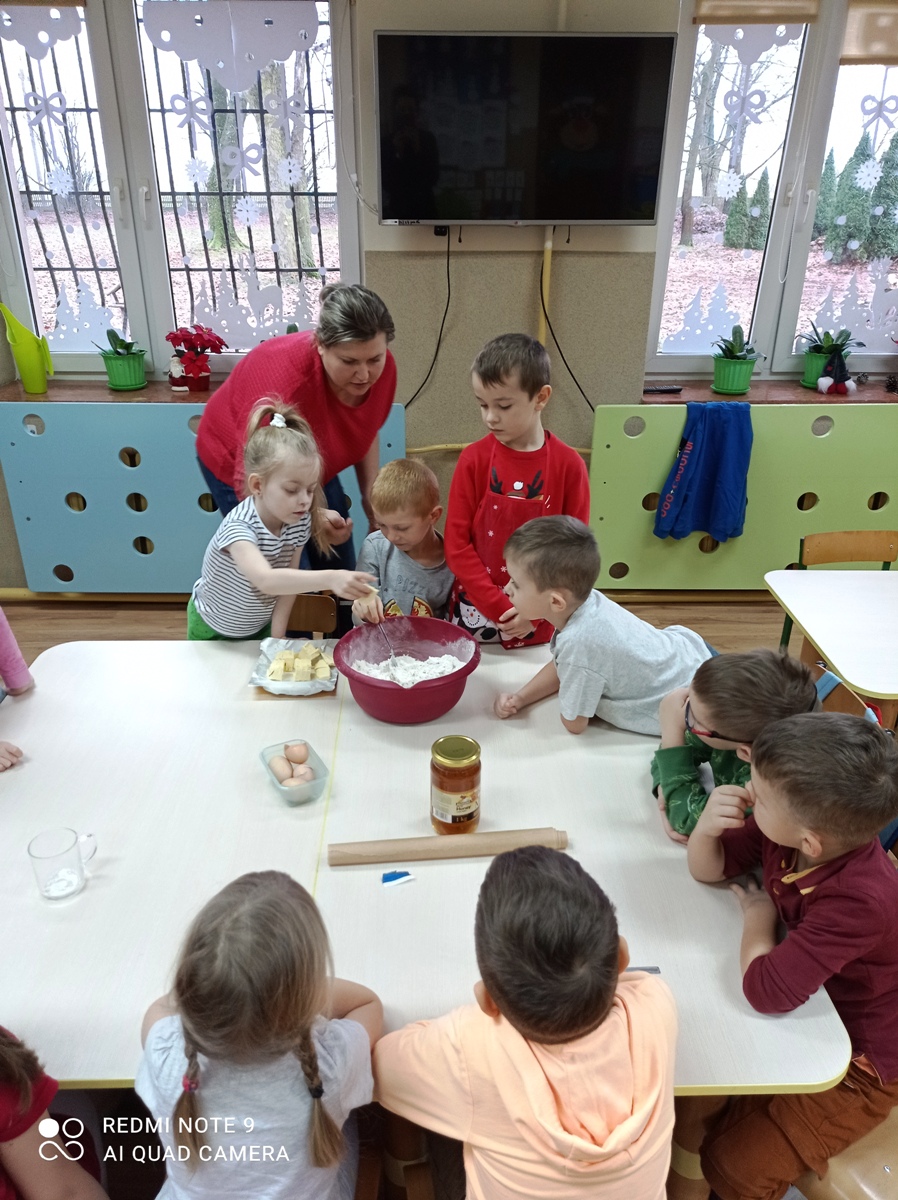 Okres przedświąteczny dla dzieci był bardzo pracowity, bowiem tego dnia piekły pierniczki. Najpierw odpowiednio się przygotowały dbając o czyste rączki. Poznały też składniki i sposób wykonania ciasta, potrzebne przybory kuchenne a także zasady bezpieczeństwa. Gdy wszystko było gotowe przedszkolaki z ogromnym zapałem i zaangażowaniem zabrały się do pracy – dodawały i mieszały składniki, wałkowały ciasto, wykrawały ciasteczka. Efektem naszej pracy były pełne blaszki pierniczków, które zanieśliśmy do kuchni i tam nabierały koloru piekąc się w piekarniku.