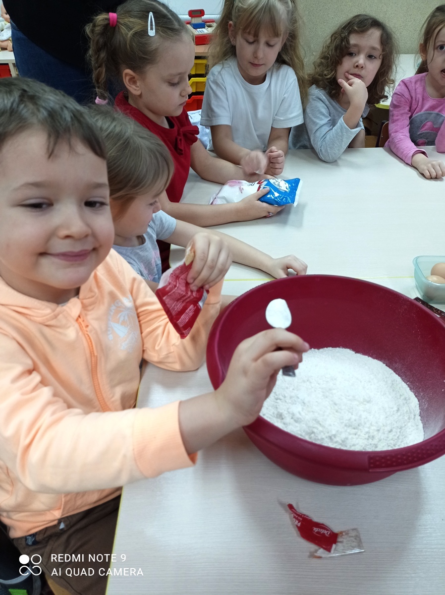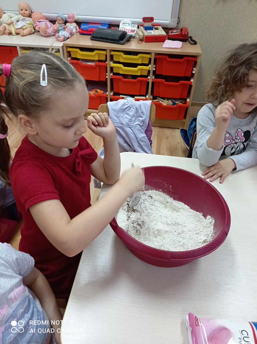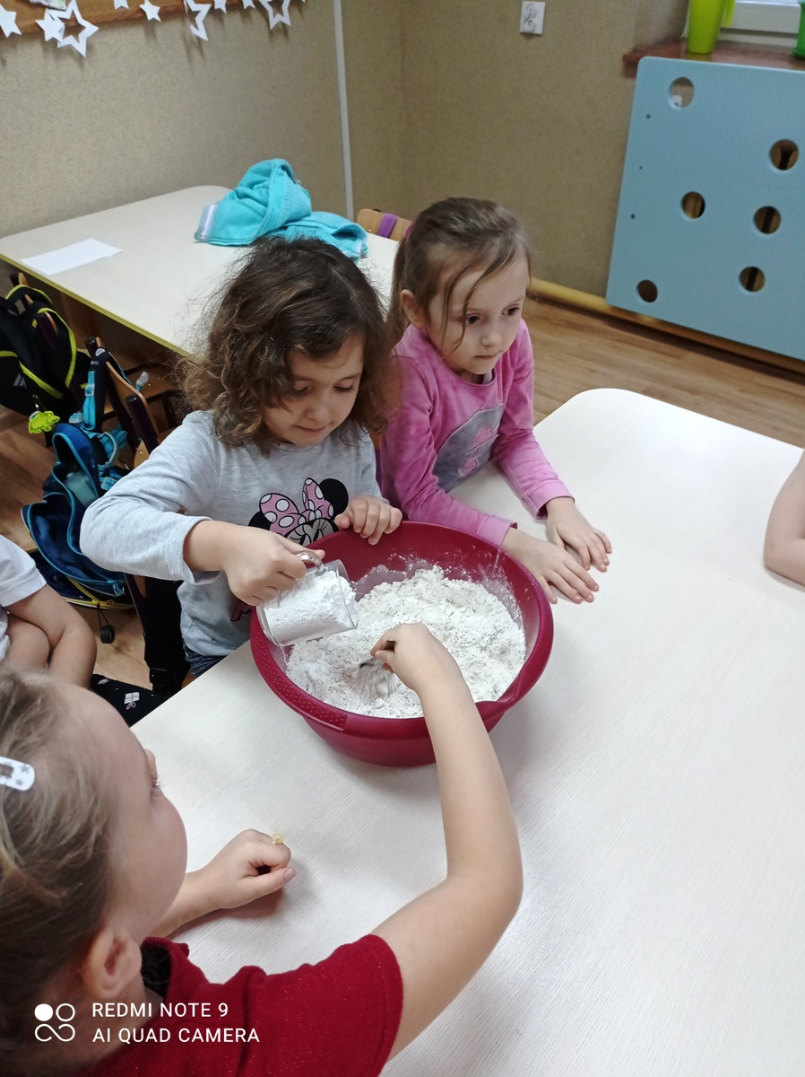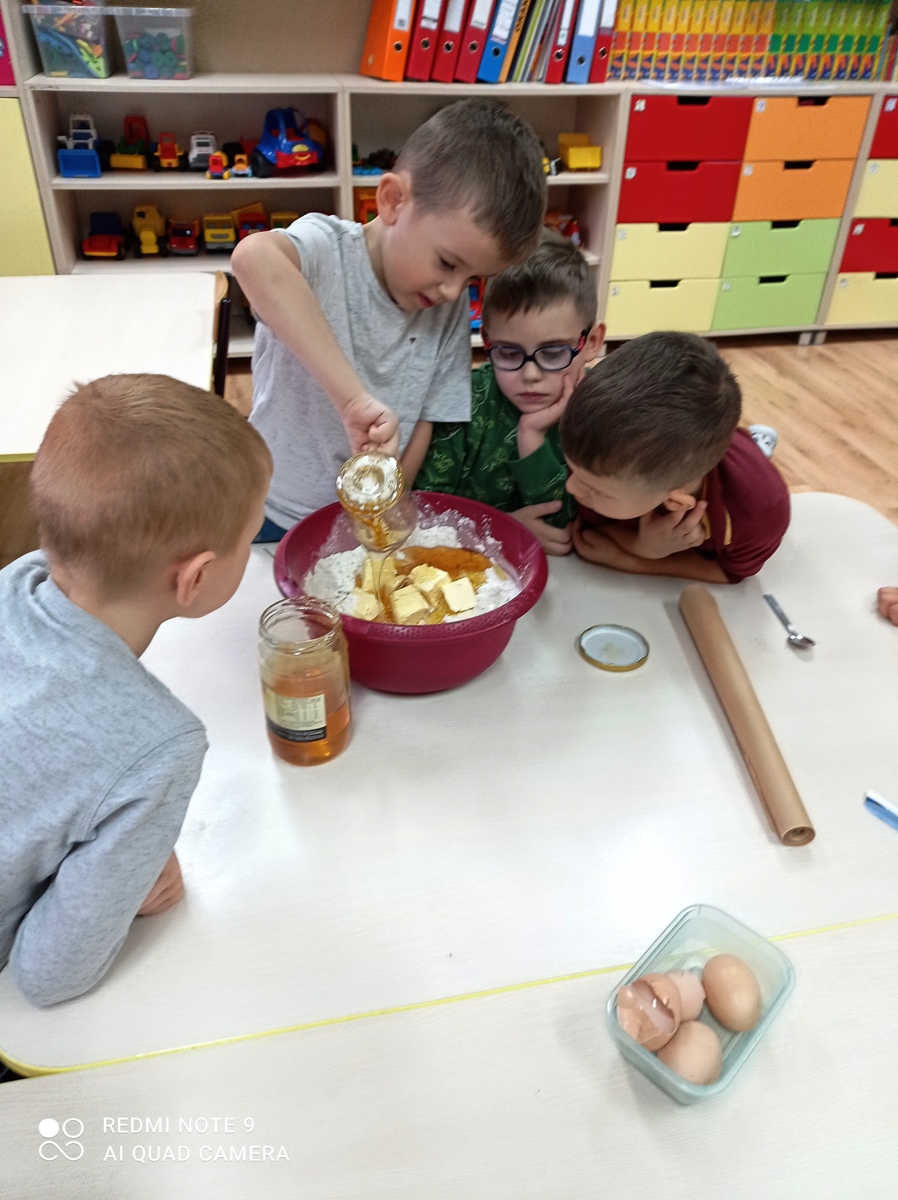Okres przedświąteczny dla dzieci był bardzo pracowity, bowiem tego dnia piekły pierniczki. Najpierw odpowiednio się przygotowały dbając o czyste rączki. Poznały też składniki i sposób wykonania ciasta, potrzebne przybory kuchenne a także zasady bezpieczeństwa. Gdy wszystko było gotowe przedszkolaki z ogromnym zapałem i zaangażowaniem zabrały się do pracy – dodawały i mieszały składniki, wałkowały ciasto, wykrawały ciasteczka. Efektem naszej pracy były pełne blaszki pierniczków, które zanieśliśmy do kuchni i tam nabierały koloru piekąc się w piekarniku.
