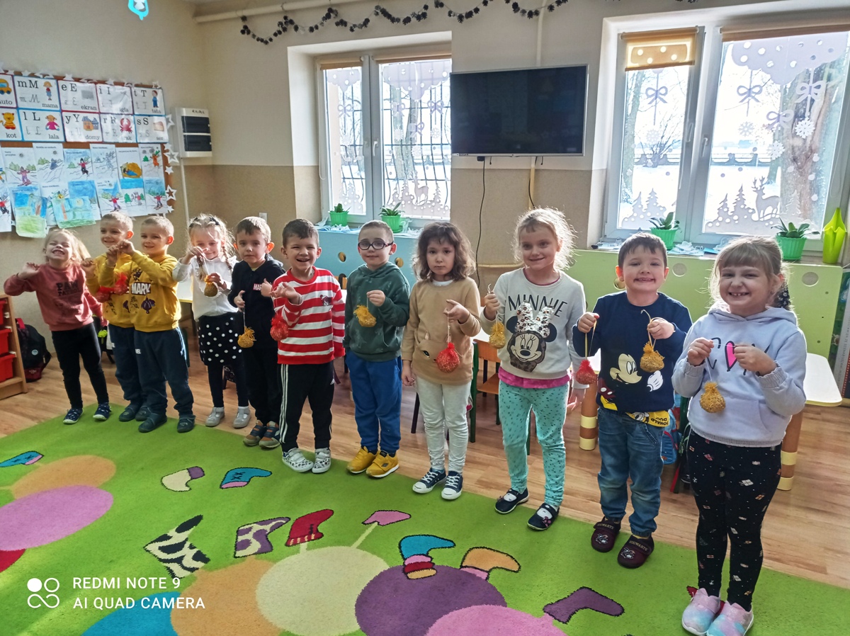 Dzieci z oddziału przedszkolnego wiedzą, że zima to trudny czas dla ptaków, dlatego dbają o brzuszki naszych małych przyjaciół. Przygotowaliśmy dla nich ich ulubione przysmaki zrobione ze smalcu i ziaren. :)