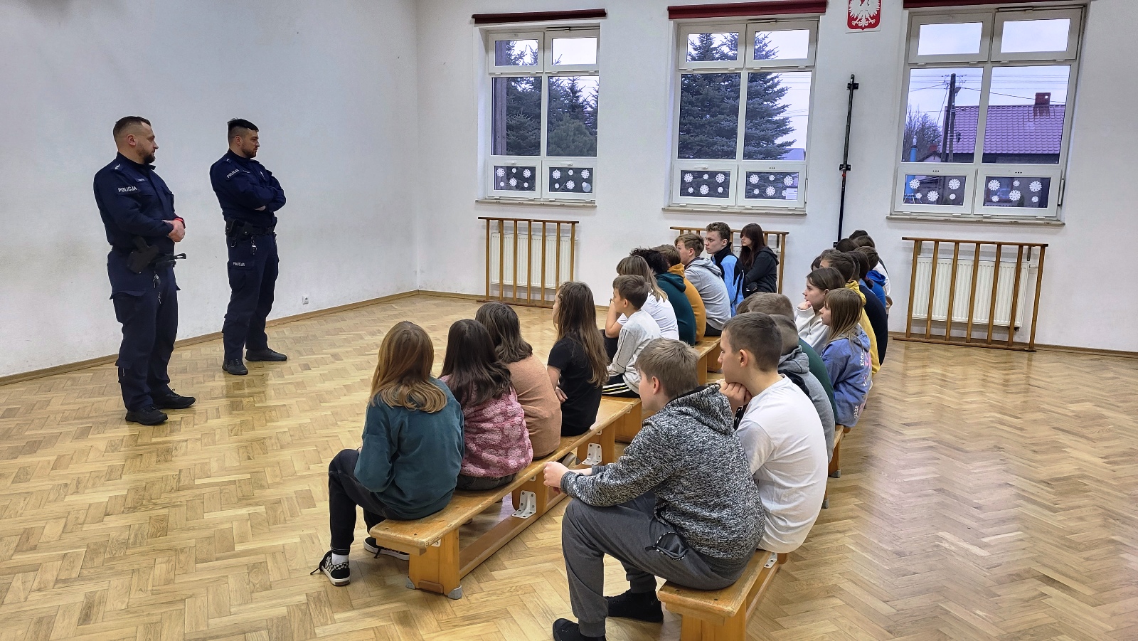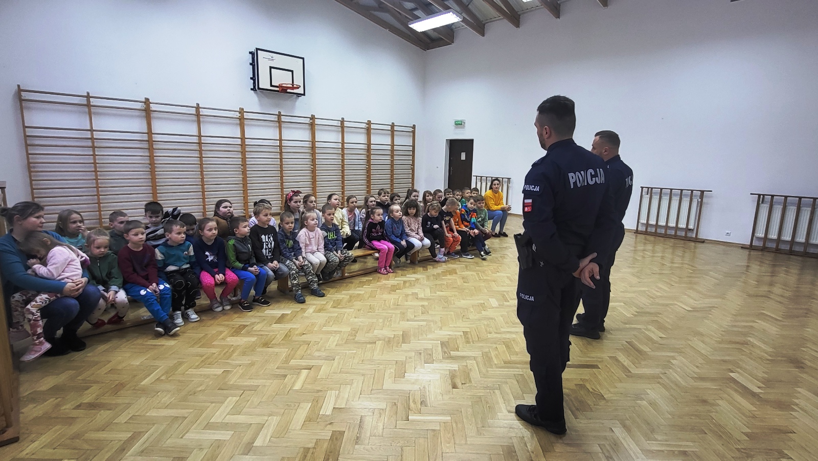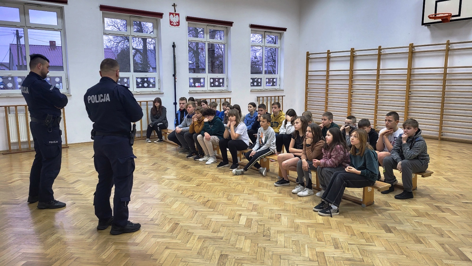 W ramach edukacji związanej z bezpieczeństwem, w dniu 24 lutego uczniowie szkoły uczestniczyli w spotkaniu z przedstawicielami policji. Dzieci miały okazję porozmawiać o zachowaniu bezpieczeństwa w drodze do szkoły i poza szkołą. Zostały omówione zasady poruszania się po ulicy, chodniku drodze. Przypomniano numery alarmowe i sposoby wzywania pomocy. Zwrócono także uwagę na bezpieczne zachowanie podczas ferii zimowych. Dzieci czynnie uczestniczyły w spotkaniu, dzieliły się swoimi spostrzeżeniami i doświadczeniami oraz zadawały pytania.