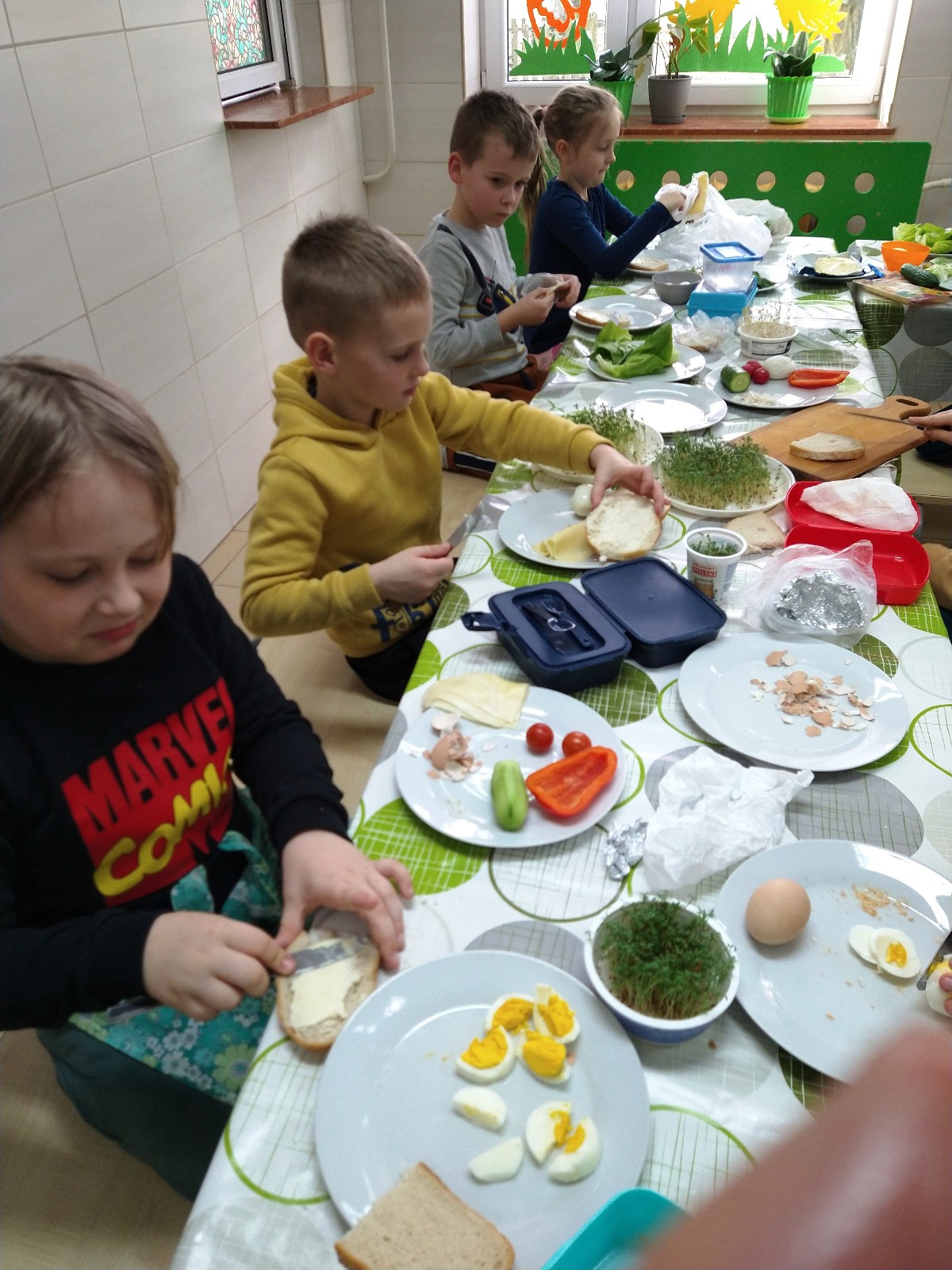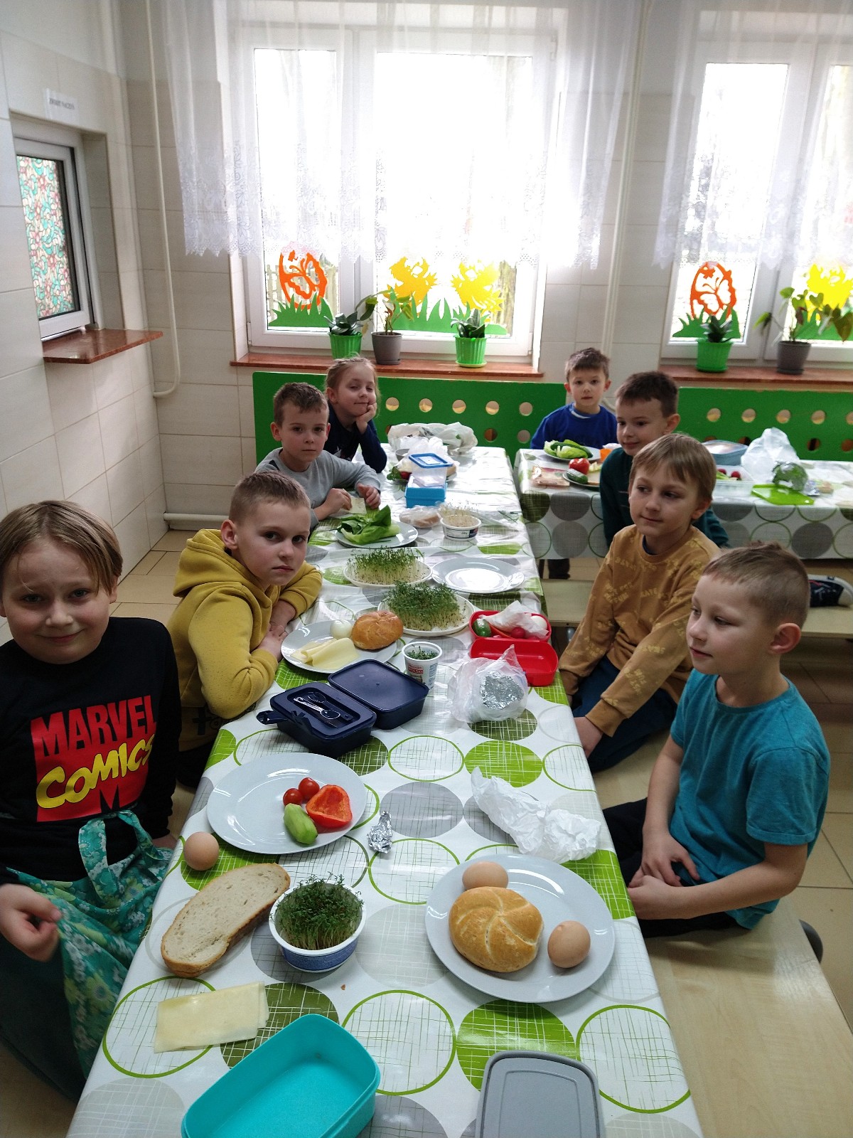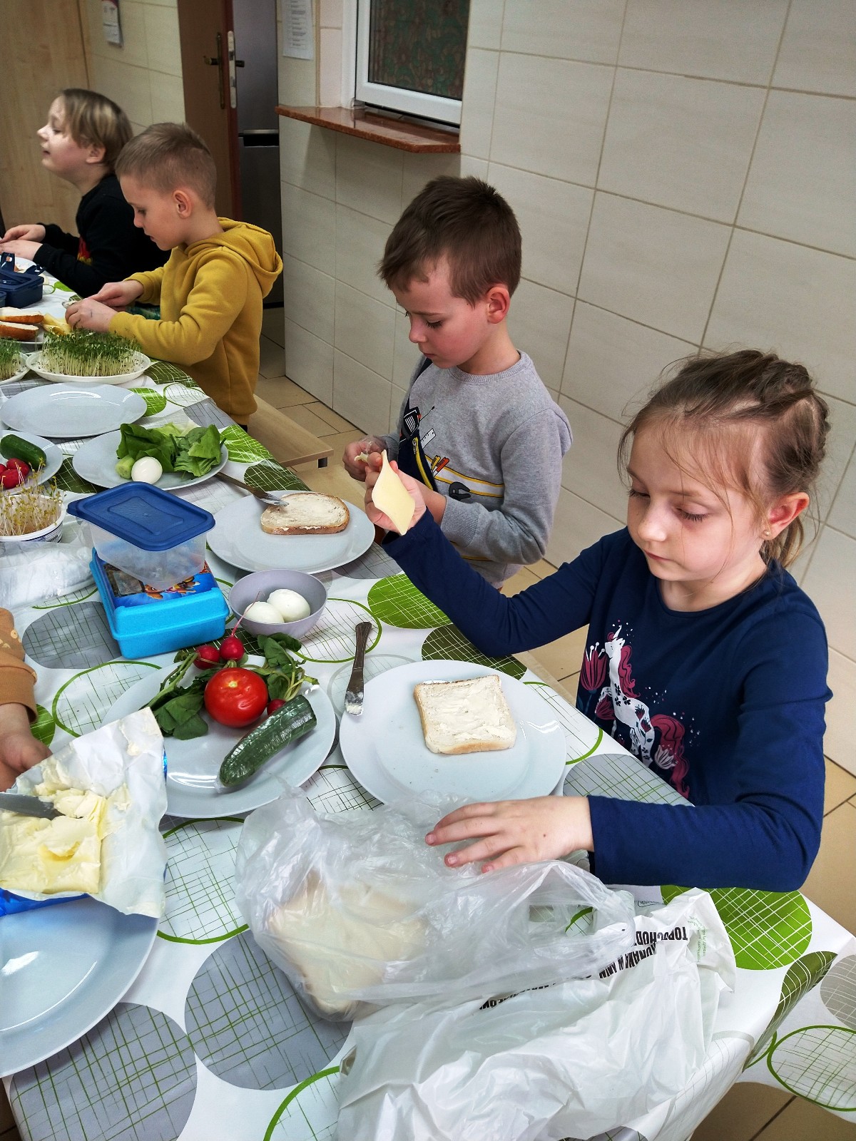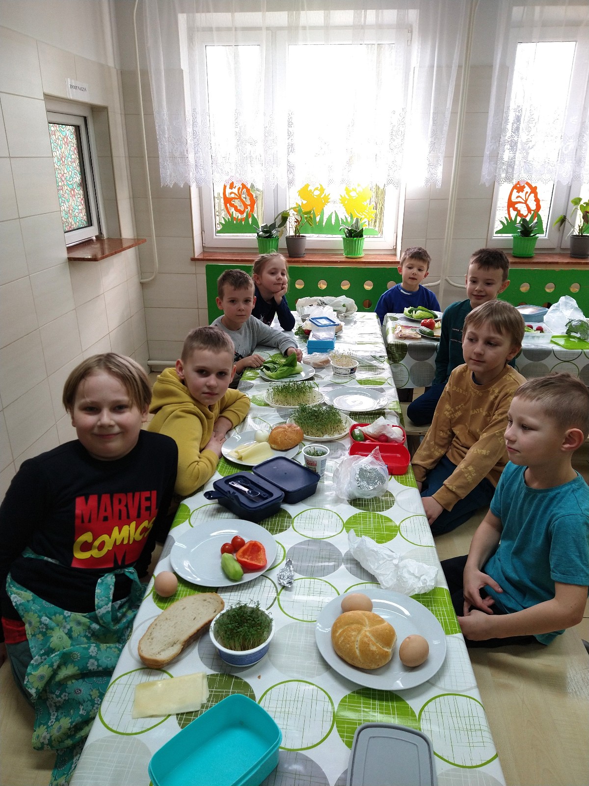 15 marca uczniowie klasy I przygotowywali kanapki. Na stole nie zabrakło sera, jajek, pomidorów, rzodkiewki, ogórków, sałaty, papryki oraz wyhodowanej w klasie rzeżuchy i szczypiorku. Dzieci smarowały pieczywo masłem, kroiły warzywa oraz układały dowolnie przez siebie wybrane witaminy. Wszystkie dzieci z wielkim apetytem zajadały przygotowane przez siebie kanapki. Dzięki takim zajęciom dzieci kształcą w sobie odpowiednie nawyki żywieniowe, rozwijają kreatywność, wyobraźnię i dbałość o higienę podczas spożywania posiłku. Kanapki wykonane samodzielnie przez dzieci wyglądały pięknie i kolorowo, a smakowały pysznie i były pełne witamin!