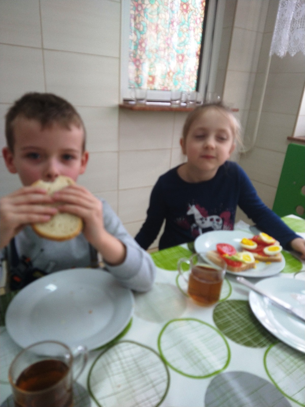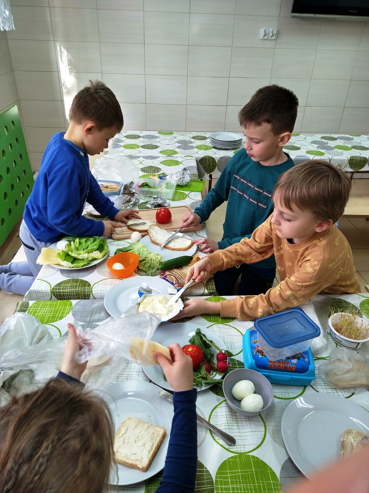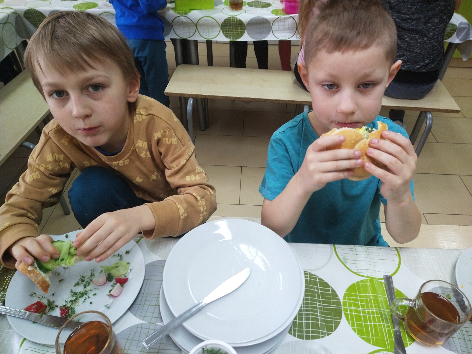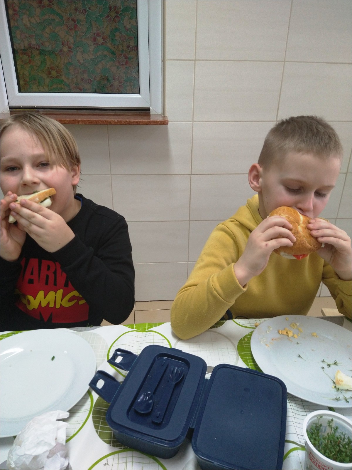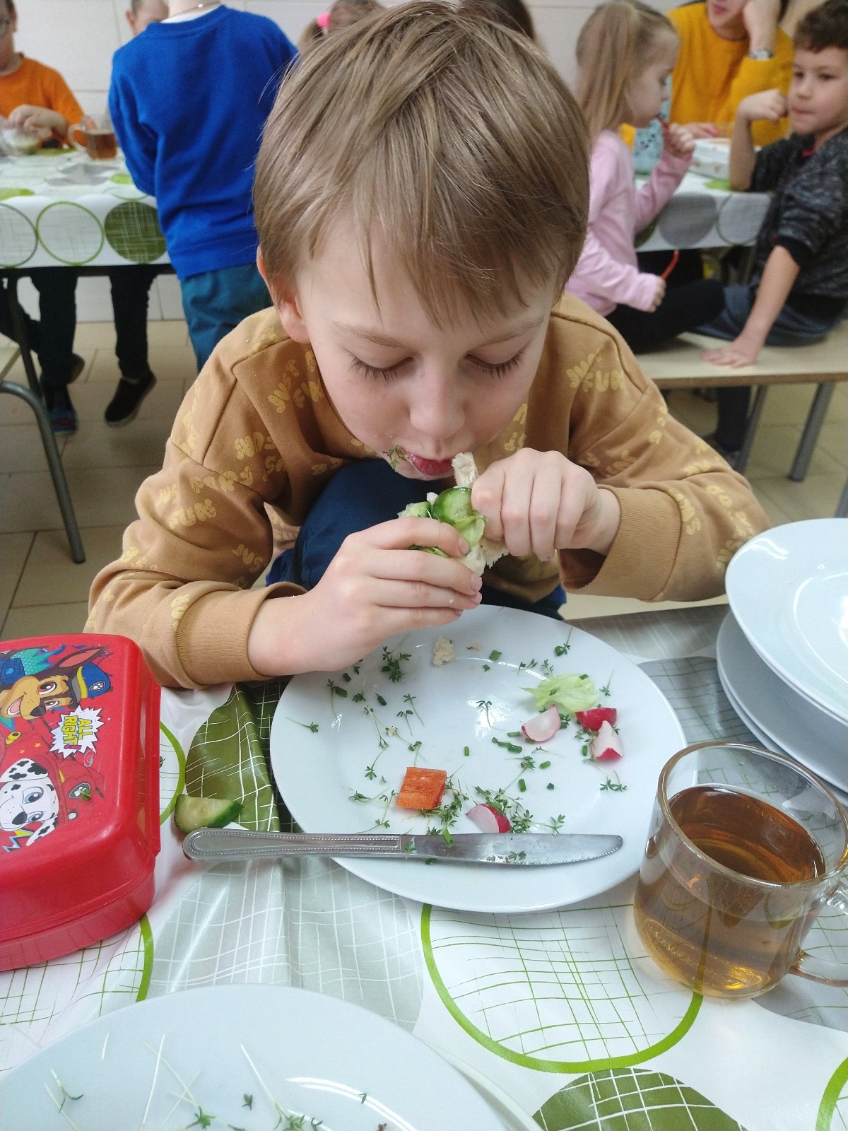 15 marca uczniowie klasy I przygotowywali kanapki. Na stole nie zabrakło sera, jajek, pomidorów, rzodkiewki, ogórków, sałaty, papryki oraz wyhodowanej w klasie rzeżuchy i szczypiorku. Dzieci smarowały pieczywo masłem, kroiły warzywa oraz układały dowolnie przez siebie wybrane witaminy. Wszystkie dzieci z wielkim apetytem zajadały przygotowane przez siebie kanapki. Dzięki takim zajęciom dzieci kształcą w sobie odpowiednie nawyki żywieniowe, rozwijają kreatywność, wyobraźnię i dbałość o higienę podczas spożywania posiłku. Kanapki wykonane samodzielnie przez dzieci wyglądały pięknie i kolorowo, a smakowały pysznie i były pełne witamin!