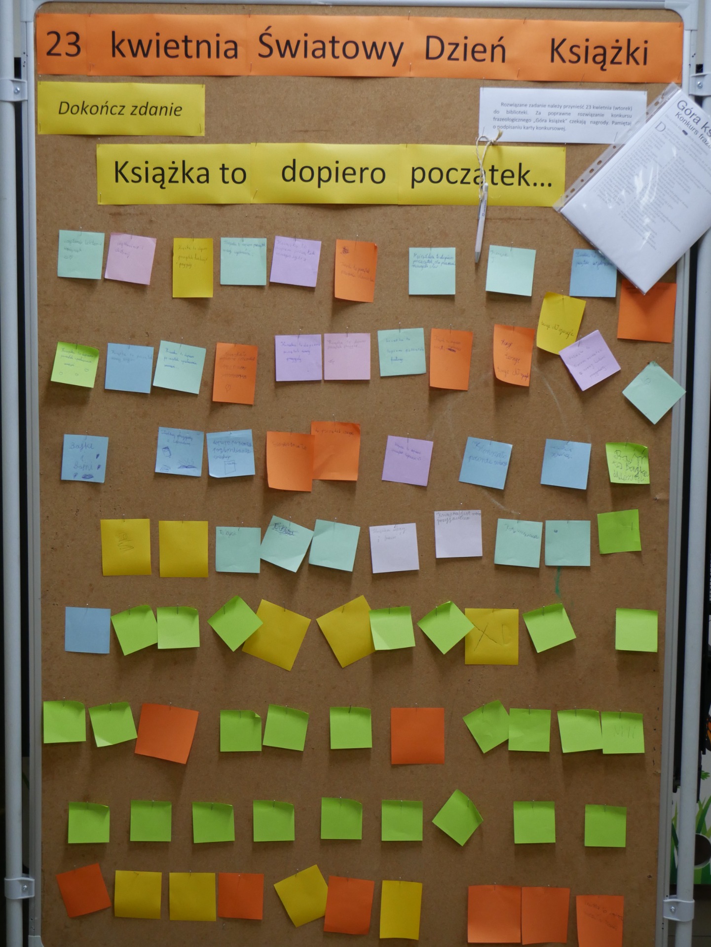 Światowy Dzień Książki to coroczne międzynarodowe święto na cześć książek i czytelnictwa obchodzone 23 kwietnia. W naszej szkole z tej okazji odbyła się akcja promująca czytelnictwo. Na tablicy zawisło wydrukowane zdanie "Książka to dopiero początek ...", zadaniem uczniów było dokończenie tego zdania i zapisanie swoich pomysłów na kolorowych karteczkach. Dzieci miały też możliwość uczestniczyć w konkursie frazeologicznym "Góra książek". Zadania konkursowe poprawnie rozwiązali: Julia Tracz kl.VI, Adam Sikora kl.VI oraz Kacper Cąder kl.VII. Zwycięzcy otrzymali dyplomy i nagrody książkowe.