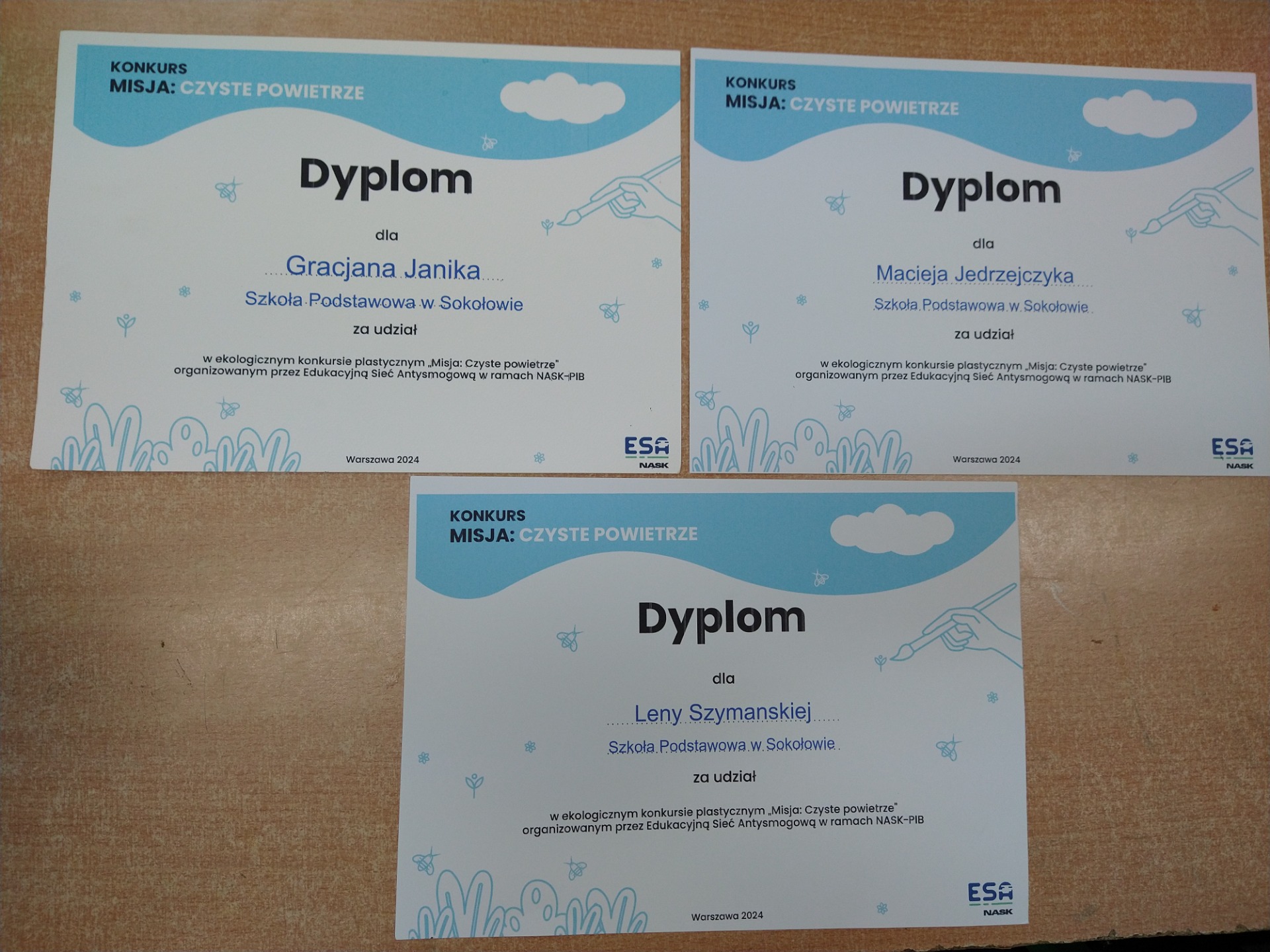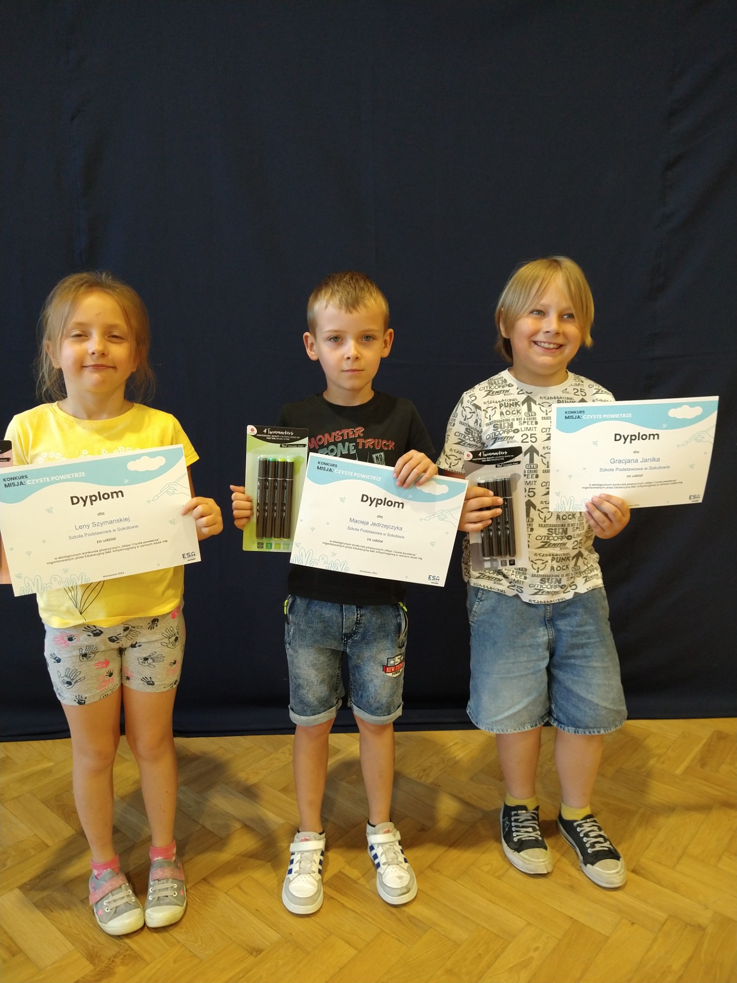 Uczniowie klasy pierwszej wzięli udział w ekologicznym konkursie plastycznym skierowanym do klas 1–3 szkół podstawowych. Organizatorem konkursu jest Edukacyjna Sieć Antysmogowa. Zadanie konkursowe polegało na pokazaniu w interesujący i twórczy sposób problem smogu, jego wpływu na zdrowie lub promowanie aktywnych działań na rzecz czystego powietrza. W konkursie udział wzięło 1285 uczniów z całej Polski. Wśród wyróżnionych nie ma uczniów naszej szkoły. Miłym gestem jest jednak przesłanie podziękowań i dyplomów za udział: Maciejowi Jędrzejczykowi, Lenie Szymańskiej i Gracjanowi Janikowi.