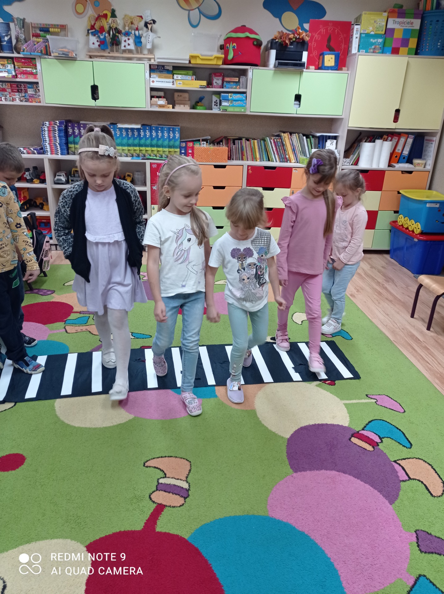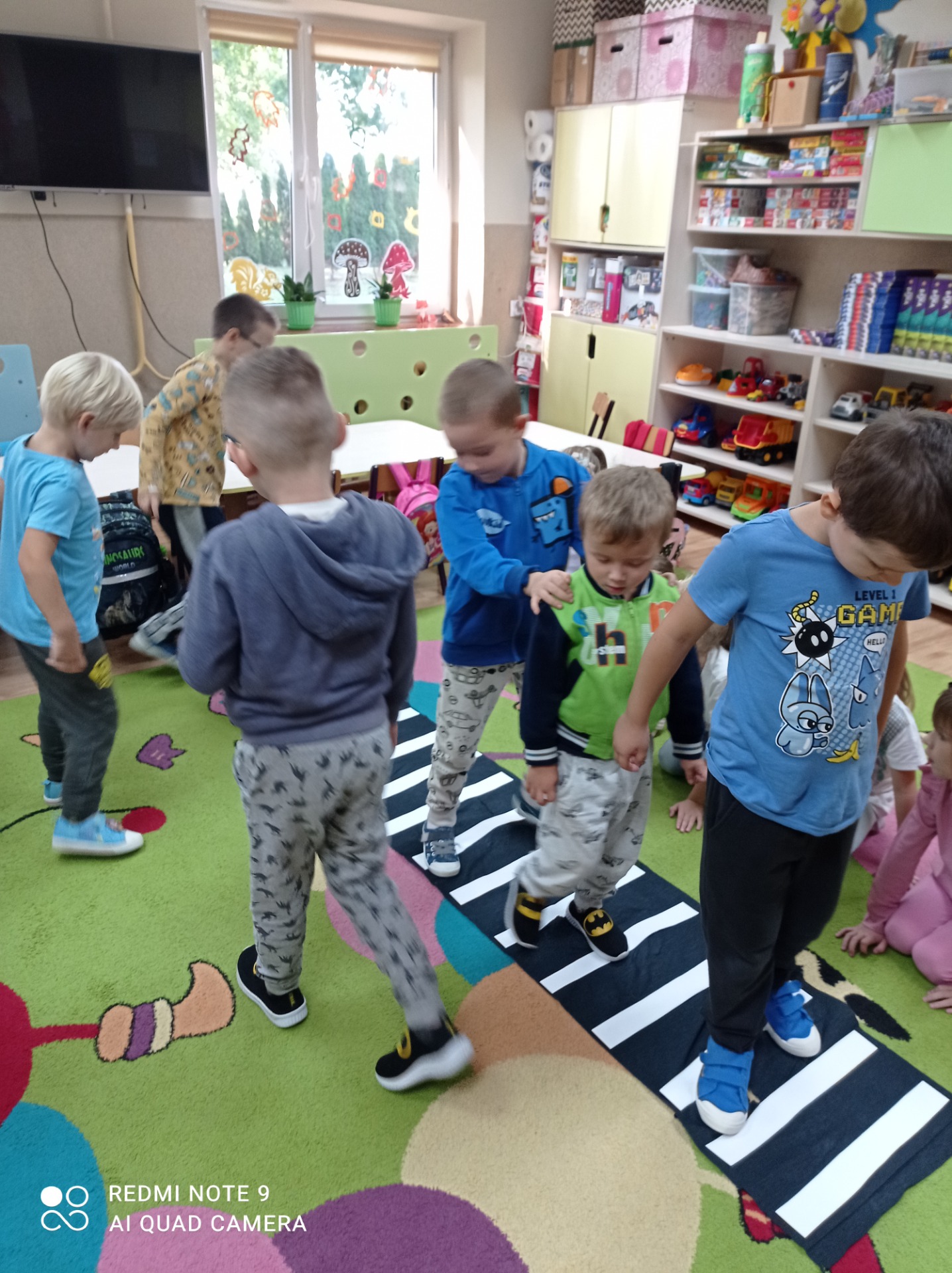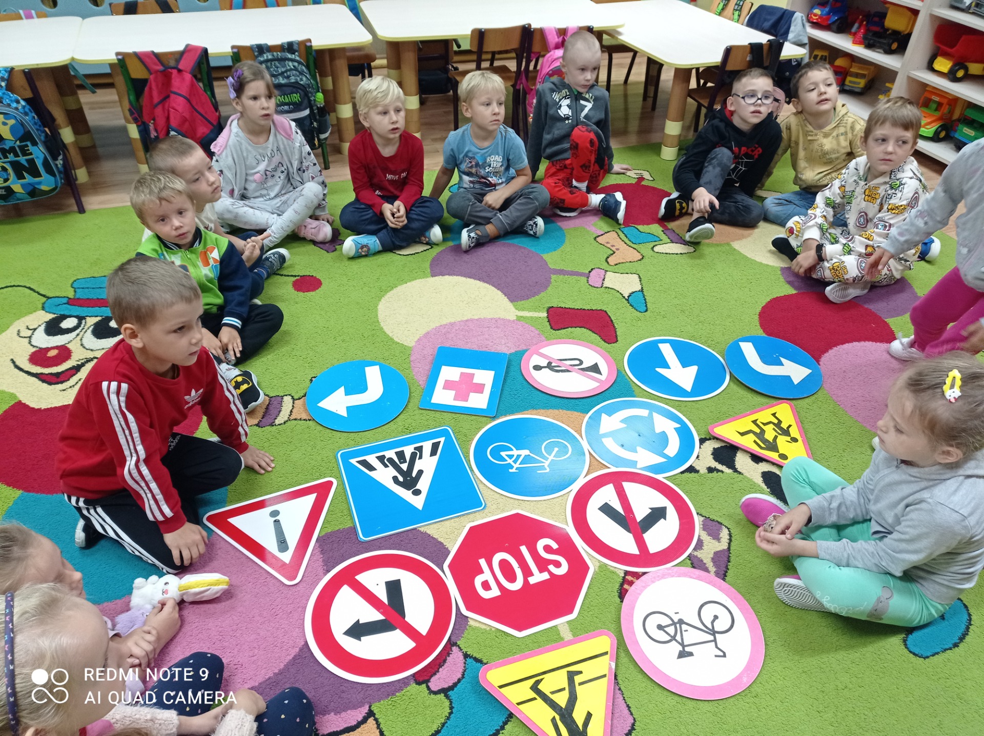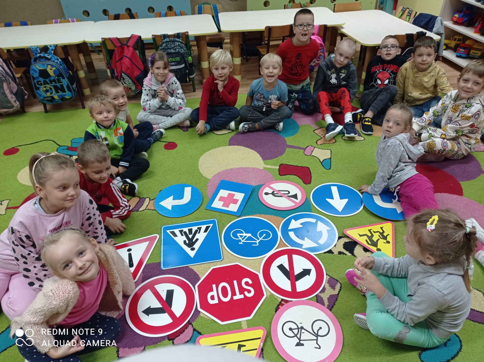 Przypomnieliśmy sobie numery alarmowe oraz zasady odpowiedzialnego korzystania z nich. Zapoznaliśmy się z zasadami ruchu drogowego a także omówiliśmy zachowania niedopuszczalne „na drodze”. Poznaliśmy procedurę przechodzenia przez jezdnię i zastosowanie sygnalizacji świetlnej, jej kolorów i ich znaczenia. Oglądaliśmy i nazywaliśmy znaki drogowe. Chętnie uczestniczyliśmy w zabawach dydaktycznych, plastycznych, między innymi pt.”Czerwony, zielony”, „Stop”. Wiemy, jakie korzyści płyną z posiadania elementów odblaskowych.