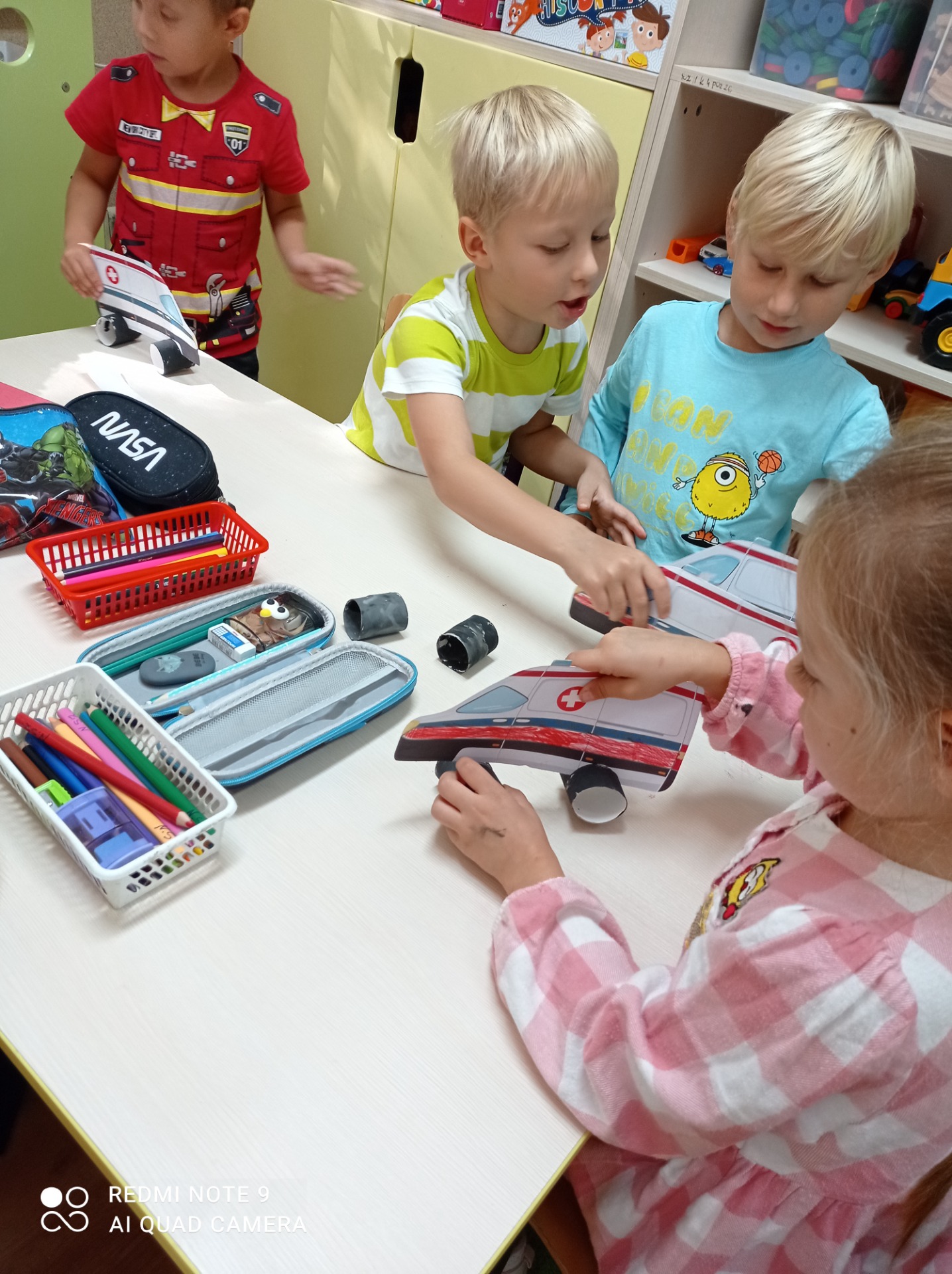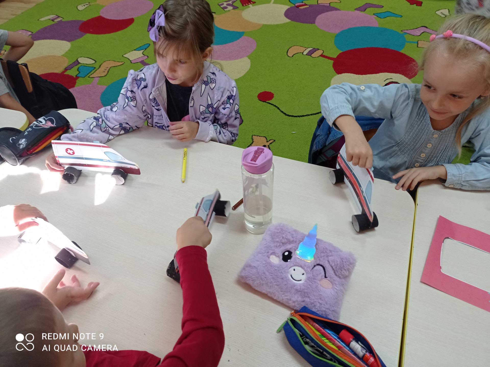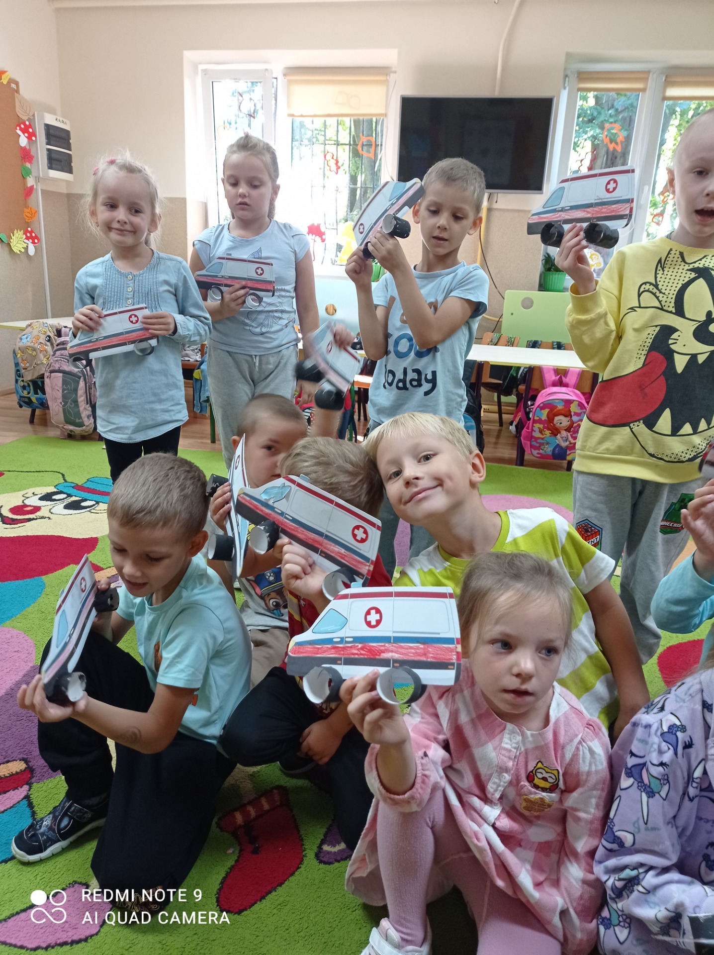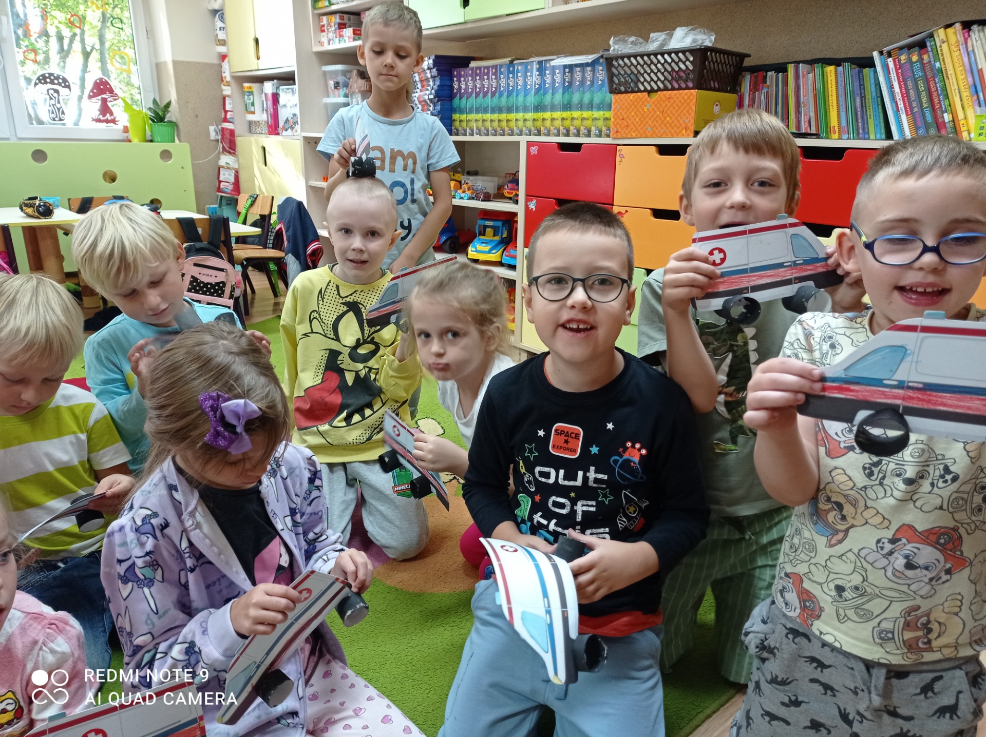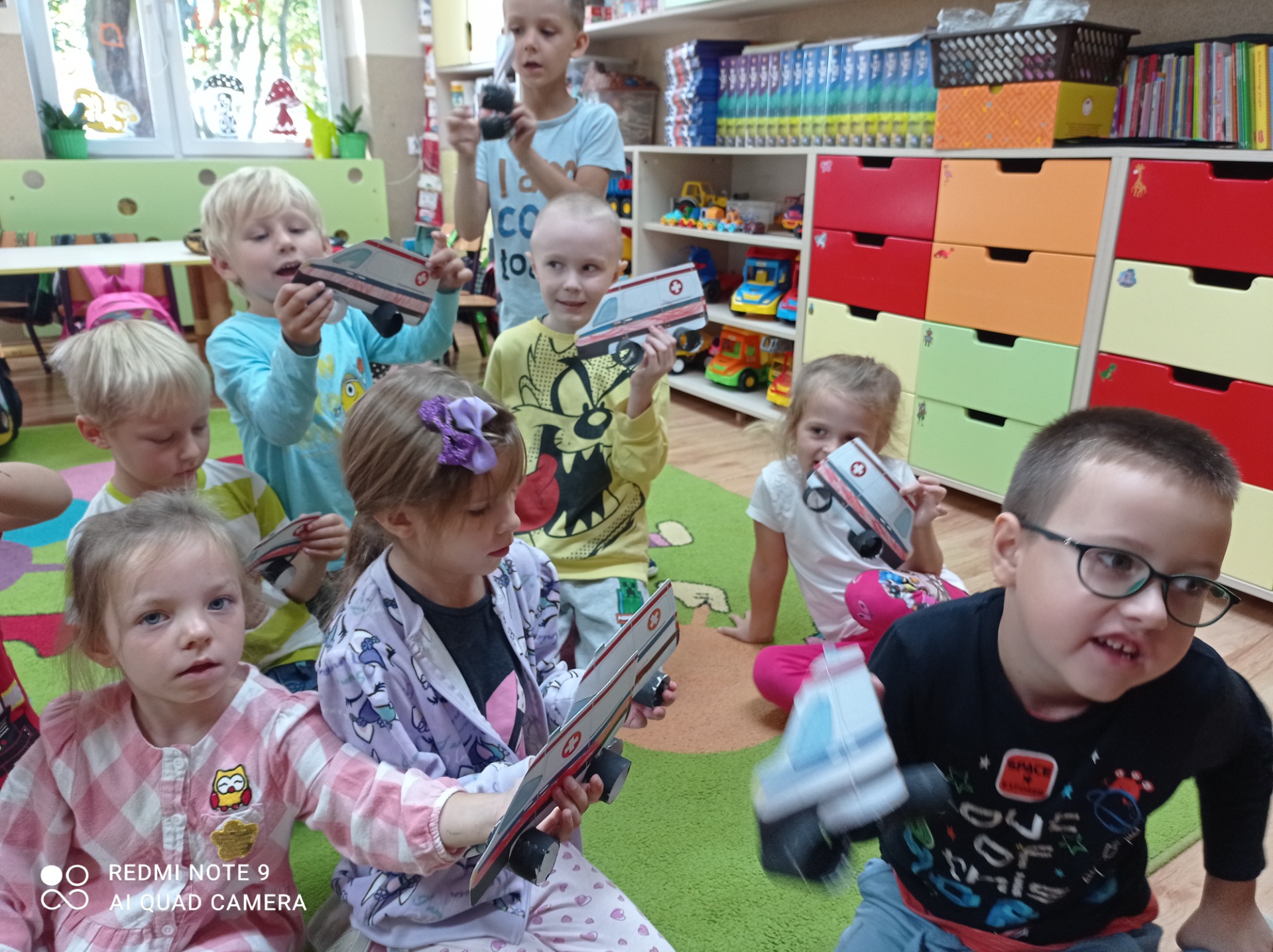 Przypomnieliśmy sobie numery alarmowe oraz zasady odpowiedzialnego korzystania z nich. Zapoznaliśmy się z zasadami ruchu drogowego a także omówiliśmy zachowania niedopuszczalne „na drodze”. Poznaliśmy procedurę przechodzenia przez jezdnię i zastosowanie sygnalizacji świetlnej, jej kolorów i ich znaczenia. Oglądaliśmy i nazywaliśmy znaki drogowe. Chętnie uczestniczyliśmy w zabawach dydaktycznych, plastycznych, między innymi pt.”Czerwony, zielony”, „Stop”. Wiemy, jakie korzyści płyną z posiadania elementów odblaskowych.