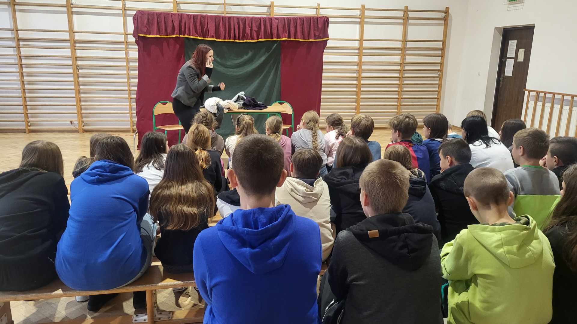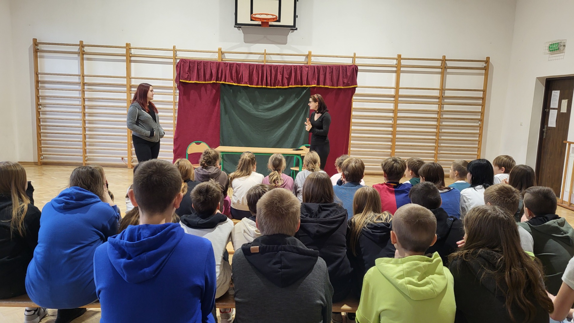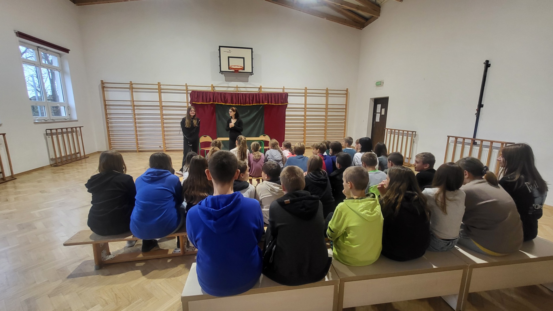 W dniu 18 listopada 2024 roku do szkoły zawitali aktorzy krakowskiego Teatru Edukacji i Profilaktyki „Maska”. Uczniowie klas IV-VIII obejrzeli przedstawienie pod tytułem „Szkolna elita”. Spektakl ten poruszał problem przemocy rówieśniczej wśród dzieci i młodzieży. Propagował prawidłowe reakcje na bycie świadkiem przemocy, uwrażliwiał na krzywdę tych, którzy sami nie potrafią się jej przeciwstawić. Niestety „przemoc karmi się ciszą”, a ofiary bardzo niechętnie mówią o swoich doświadczeniach i nie zgłaszają problemu osobom dorosłym. Najczęściej starają się pomóc sobie na swój własny sposób i zdarzają się sytuacje, gdy konsekwencje prześladowań są bardzo poważne. Dlatego niezmiernie ważne jest, aby stanowczo sprzeciwiać się przemocowym zachowaniom, bo gdy stajemy się ich biernymi obserwatorami, one nadal będą trwać.