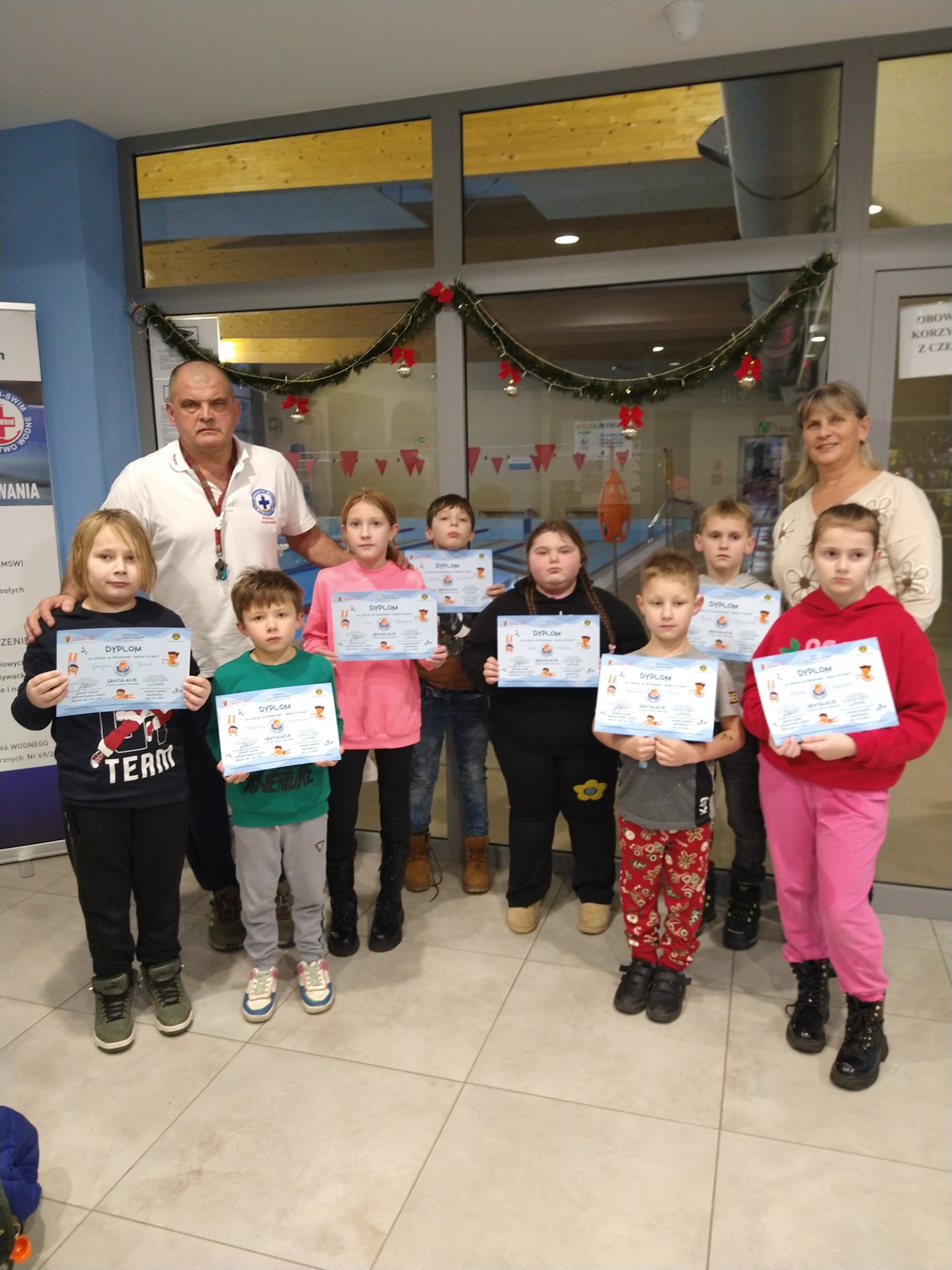 Uczniowie klasy drugiej i trzeciej Szkoły Podstawowej w Sokołowie zakończyli kurs nauki pływania w ramach ogólnopolskiego programu powszechnej nauki pływania ,,Umiem Pływać”. Podstawowym celem projektu było doprowadzenie do opanowania przez uczniów elementarnych sposobów pływania oraz zdobycie umiejętności pływania stylem grzbietowym, a także uświadomienie dzieciom, rodzicom korzyści zdrowotnych jakie pociąga za sobą umiejętność nauki pływania. Zajęcia odbywały się raz w tygodniu. Podczas 20-godzinnych zajęć na krytej pływalni w Sulejowie, pod kierunkiem instruktora WOPR p. Leszka Ciechanowskiego oraz ratowników, uczniowie poznawali tajniki nauki pływania. Dzieci chętnie i aktywnie uczestniczyły w zajęciach na basenie. Na zakończenie dzieci otrzymały dyplomy potwierdzające zdobycie nowych umiejętności w nauce pływania oraz będące uhonorowaniem zaangażowania i wysiłku włożonego w zajęcia. Udział w tym projekcie umożliwił aktywne spędzanie wolnego czasu. Zajęcia na basenie rozbudziły potrzebę uczestnictwa dzieci w takiej formie aktywności ruchowej. Dzieci nauczyły się w sposób odpowiedzialny i bezpieczny korzystać z basenu. Zajęcia dały uczniom nie tylko możliwość nabycia podstawowych umiejętności pływania, ale również możliwość rozwijania sprawności fizycznej. Projekt był finansowany przez Ministerstwo Sportu i Turystyki, a dowozy zapewnił Urząd Gminy Paradyżu.