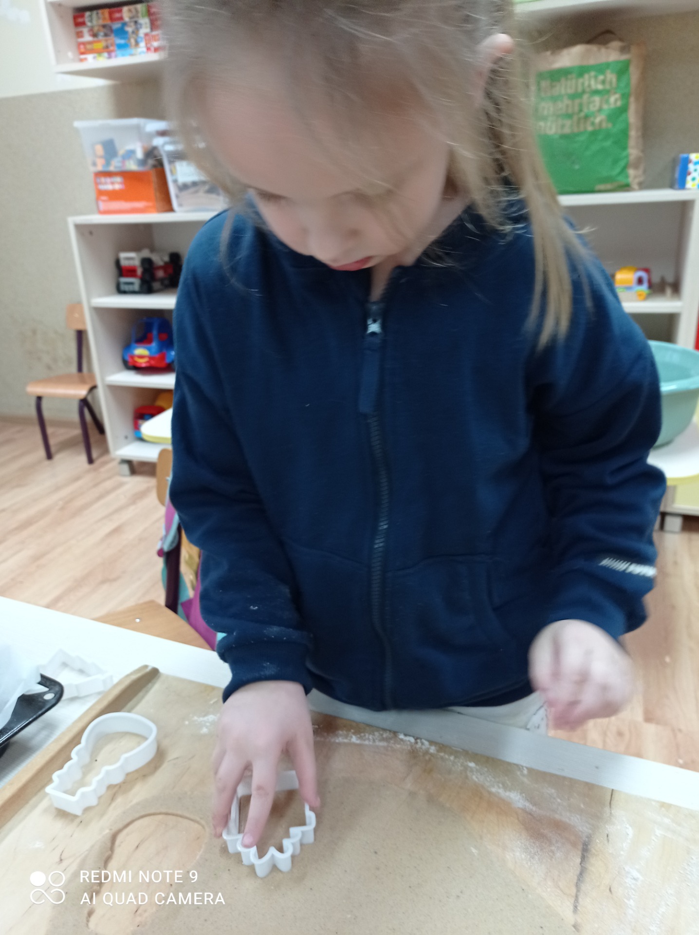 Najpierw dzieci poznały składniki i sposób wykonania ciasta, a następnie po dokładnym umyciu rąk ochoczo zabrały się do pracy. Z przygotowanego ciasta, wykrawały foremkami w świątecznych kształtach pyszne ciasteczka. Następnie pierniczki zostały upieczone.
