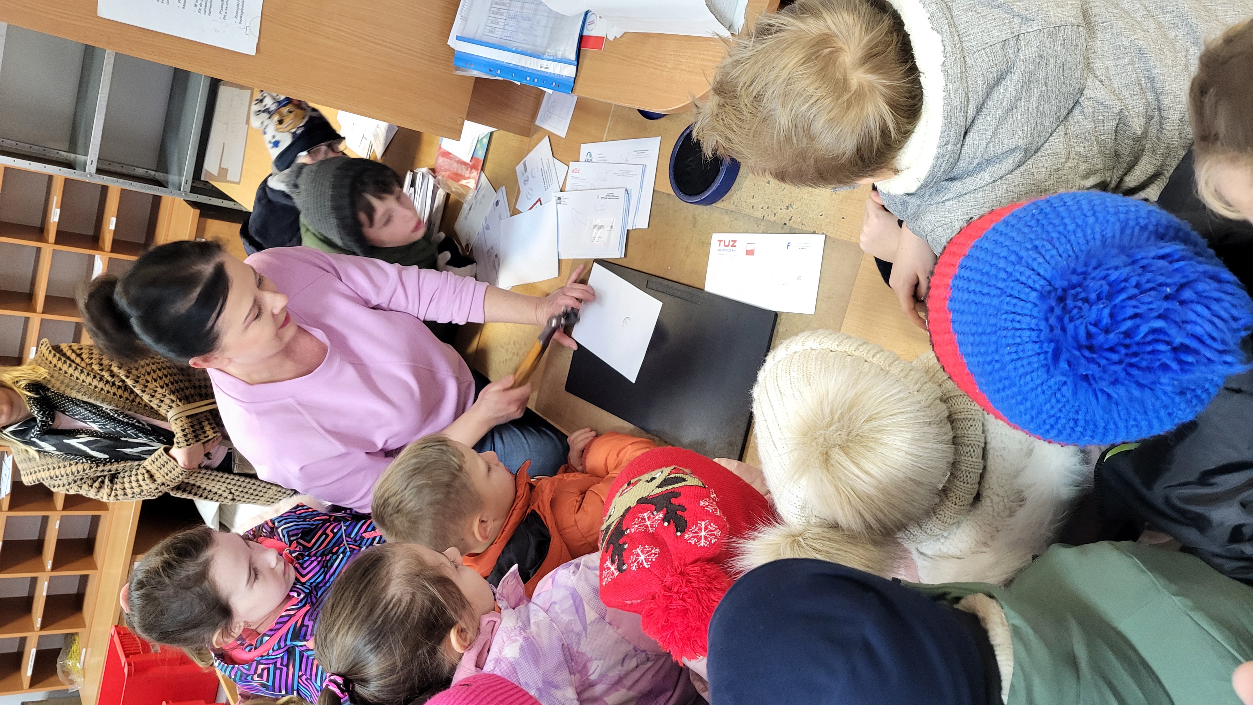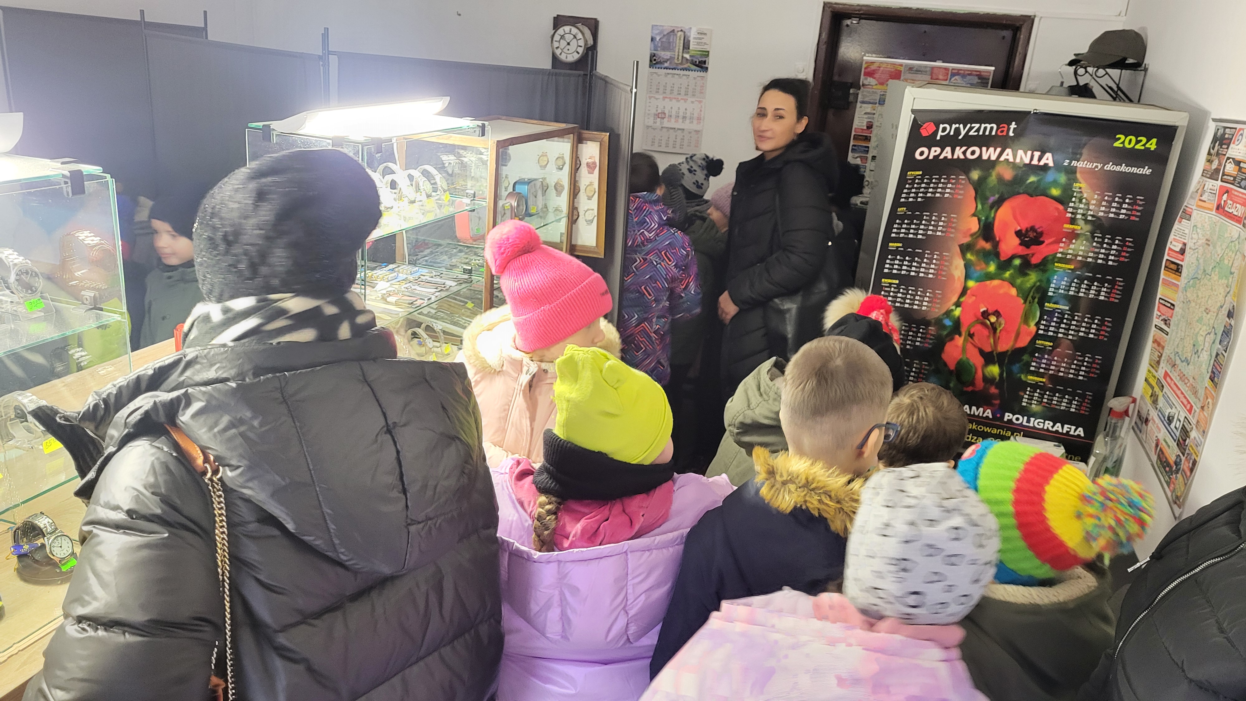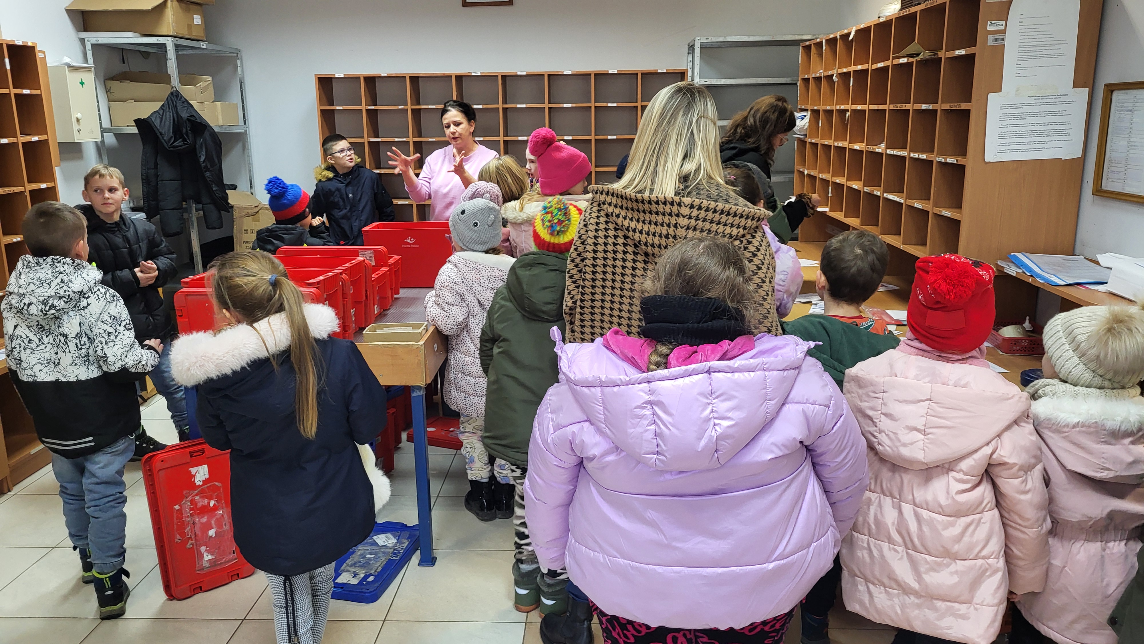 Dnia 18.12.2024r. uczniowie klas I-III wraz z opiekunkami wzięli udział w wycieczce do Opoczna. Pierwszym punktem wycieczki była poczta. Dzieci zapoznały się z instytucją poczty, pracą listonosza oraz zakresem usług pocztowych. Uczniowie zwiedzali różne pomieszczenia od zaplecza oraz mogli sprawdzić jak ciężka jest torba listonosza. Każde dziecko miało możliwość przybicia pieczątki datownikiem. Drugim punktem wycieczki była wizyta u zegarmistrza. Uczniowie zostali zapoznani z zawodem, który niestety zanika. Obejrzeli narzędzia niezbędne do pracy zegarmistrza, zobaczyli jak przebiega proces wymiany baterii w zegarku. Następnie dzieci odwiedziły Bibliotekę Pedagogiczną. Podczas wizyty uczniowie spacerowali pomiędzy wąskimi regałami zapoznając się z różnorodnymi księgozbiorami. Niespodzianką dla dzieci był teatrzyk kamishibai o tematyce Świąt Bożego Narodzenia. Dzieci odwiedziły również czytelnię, w której mogły podziwiać obrazy i inne rękodzieła. Ostatnim punktem wyjazdu była wizyta w schronisku dla zwierząt, podczas której dzieci przekazały artykuły zebrane w ramach akcji ,,Szlachetna paka dla zwierzaka’’. Pracownik schroniska opowiedział o swojej pracy oraz oprowadził uczniów po terenie schroniska. Wycieczka w której brali udział uczniowie klas I-III była doskonałą okazją do utrwalenia nawyku kulturalnego zachowania się w miejscach publicznych.