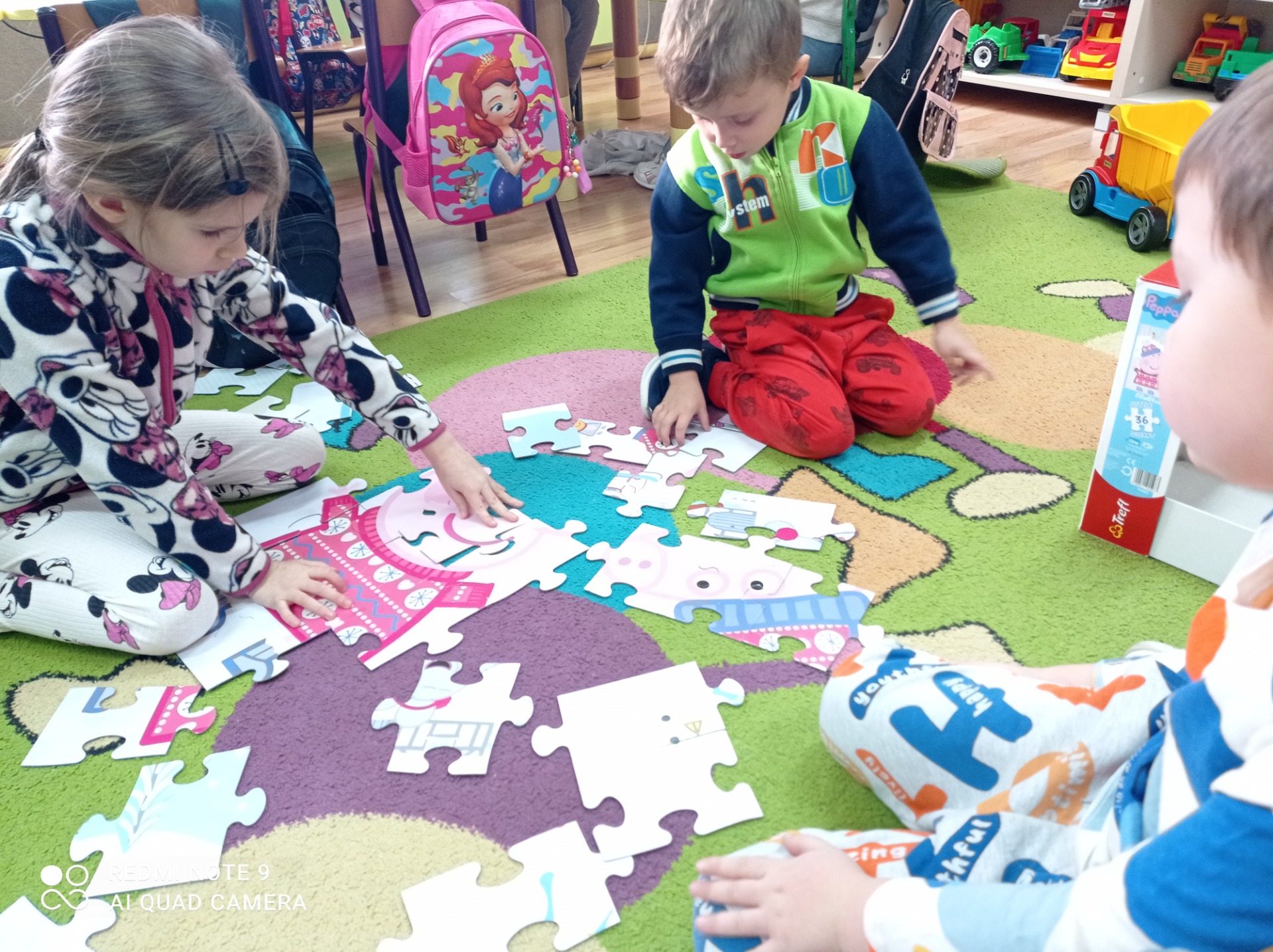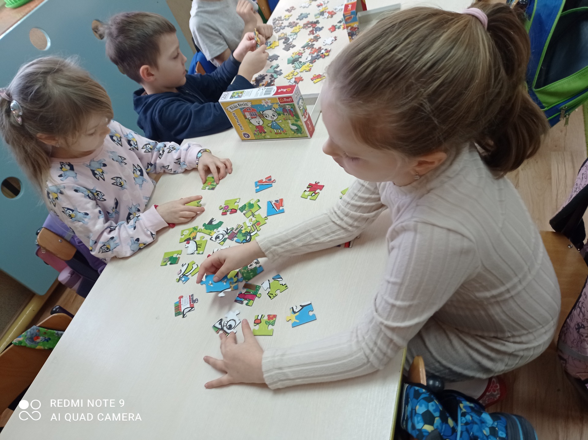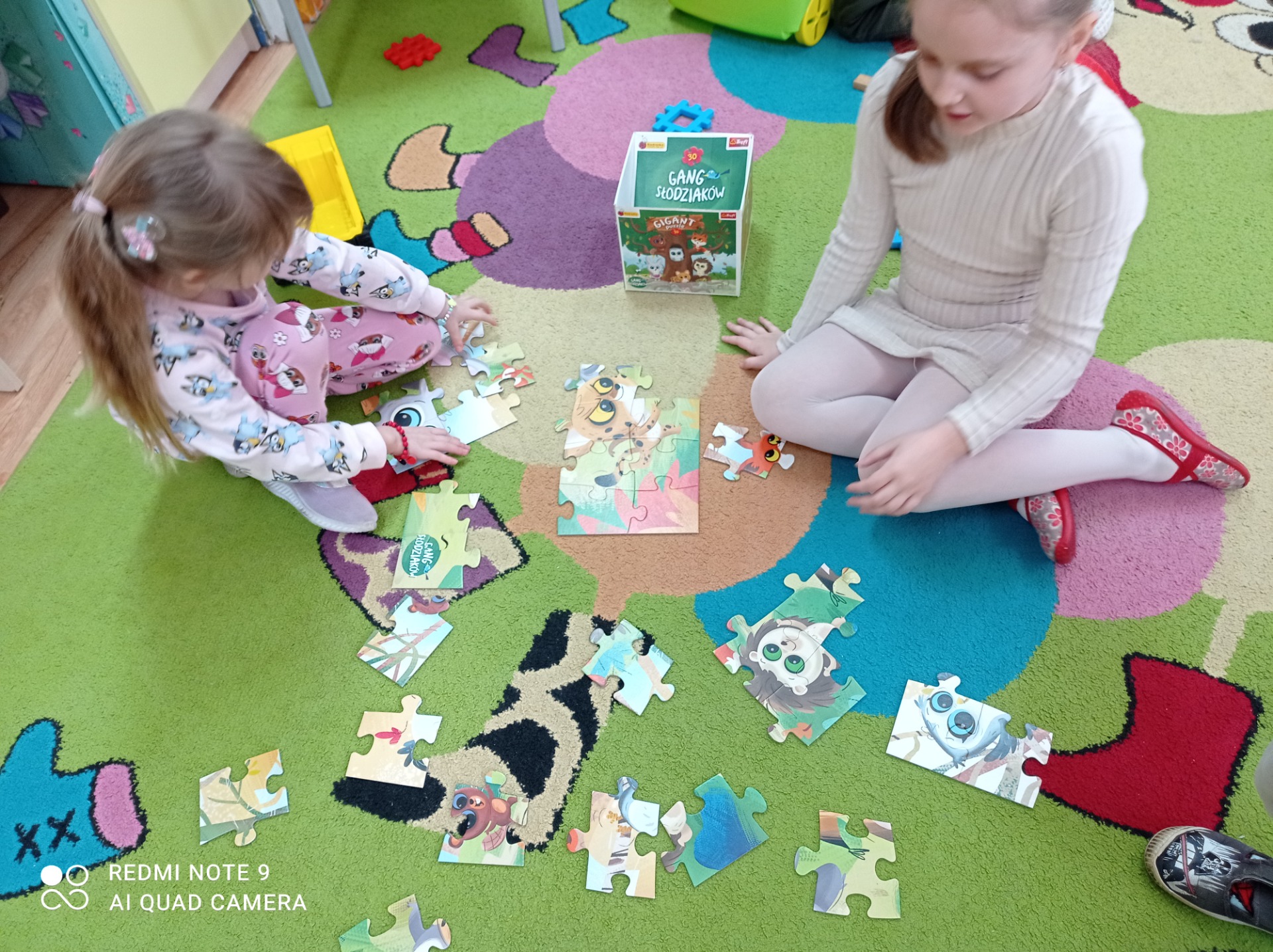 29 stycznia nasze przedszkolaki z radością obchodziły Międzynarodowy Dzień Puzzli - jedno z wielu nietypowych świąt. Jak wiadomo, układanie puzzli to świetna zabawa, która posiada walory edukacyjne. To znakomity trening pamięci i koncentracji, który dodatkowo uczy rozpoznawania kształtów oraz logicznego myślenia. Puzzle rozwijają też wiarę we własne możliwości, ćwiczą sprawność manualną dłoni, wytrwałość i cierpliwość, są świetną porcją zabawy i nauki. Zabawa puzzlami od najmłodszych lat sprawia, że dziecko rozwija tak zwaną zdolność analizy i syntezy wzrokowej, czyli rozkładania całości na poszczególne elementy i ponownego składania ich w całość. Ponadto stymulują one rozwój mózgu oraz ćwiczą spostrzegawczość. Dzieci układały puzzle różnorodnych rodzajów, jednak najwięcej radości dostarczyło im stworzenie swoich własnych puzzli!.