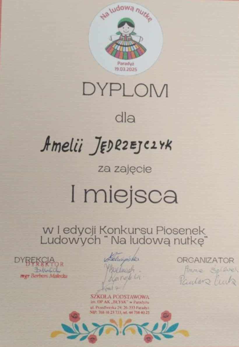 Naszą Szkołę reprezentowali następujący uczniowie: Amelia Jędrzejczyk zajmując miejsce I w kategorii soliści oraz Fabian Zięba i Igor Zięba występujący w kategorii zespół