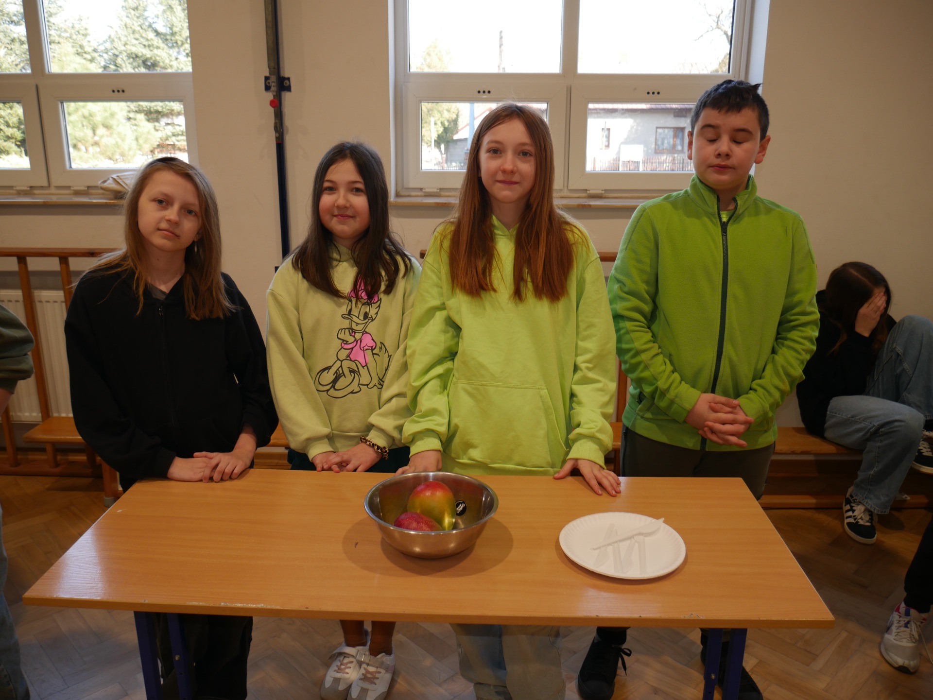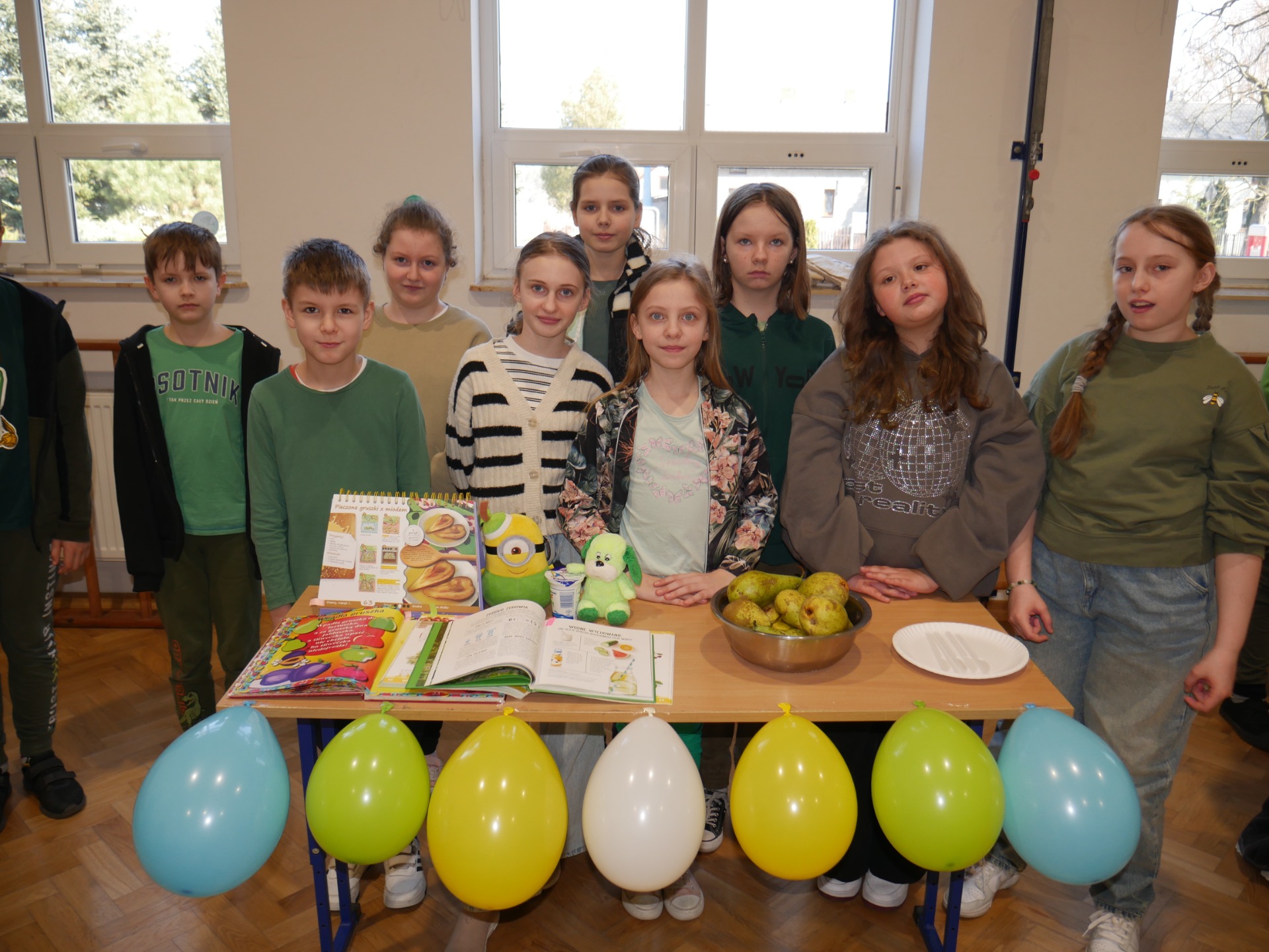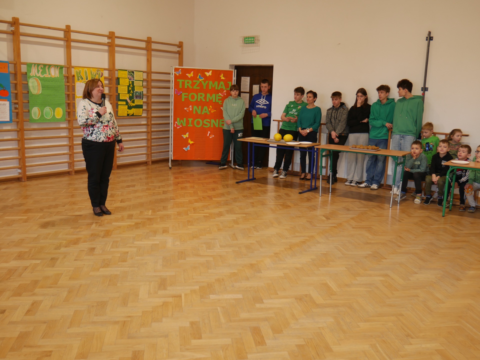 Uczniowie klas młodszych wzięli udział w zajęciach edukacyjnych o tematyce wiosennej. Chętnie dzielili się wiedzą na temat zwiastunów ropoczynającej się pory roku. Następnie odbyli barwny pochód z marzanną podczas którego prowadzili obserwacje przyrodnicze. Słuchali śpiewu ptaków, szukali pąków na drzewach oraz wypatrywali pierwszych wiosennych kwiatów. Na zakończenie pożegnali zimę obrzędem spalenia słomiano-papierowej kukły. W tym dniu obowiązywał zielony ubiór i dobry humor! Następnie wszyscy uczniowie udali się do sali gimnastycznej, gdzie przedstawili właściwości odżywcze i zdrowotne różnych owoców oraz produktów mlecznych. Po prezentacji owoce zostały umyte, obrane i pokrojone na sałatkę. Każdy skosztował tego pysznego dania. Finałem dnia był konkurs na "najbardziej zieloną klasę", oczywiście chodziło o zielone elementy strojów.