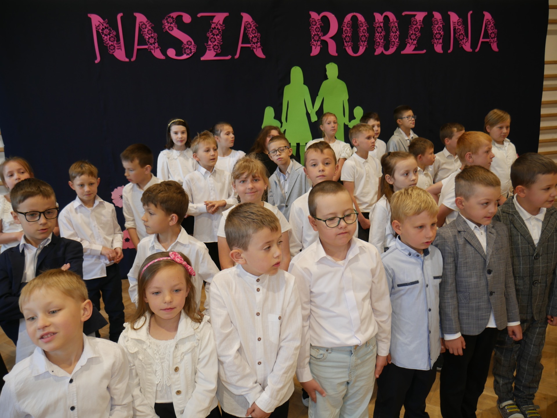 Dnia 30 maja 2025 roku w naszej szkole odbył się Dzień Rodziny. O godz. 830 wszyscy spotkaliśmy się na sali gimnastycznej. Pani Dyrektor Sylwia Sarna-Jurek powitała wszystkich zgromadzonych gości i podziękowała całej radzie rodziców za wkład w organizację tej uroczystości. Uczniowie klas 0-3 pod kierownictwem pań: Sylwii Kaczmarek, Beaty Biegały, Anety Rzeźnik, Bożeny Juźwik, Edyty Jackowskiej oraz Katarzyny Juszczyk wykonali występ artystyczny i obdarowali swoich rodziców drobnymi upominkami. Następnie uczniowie klasy czwartej, piątej i szóstej zatańczyli dla swoich rodzicieli.