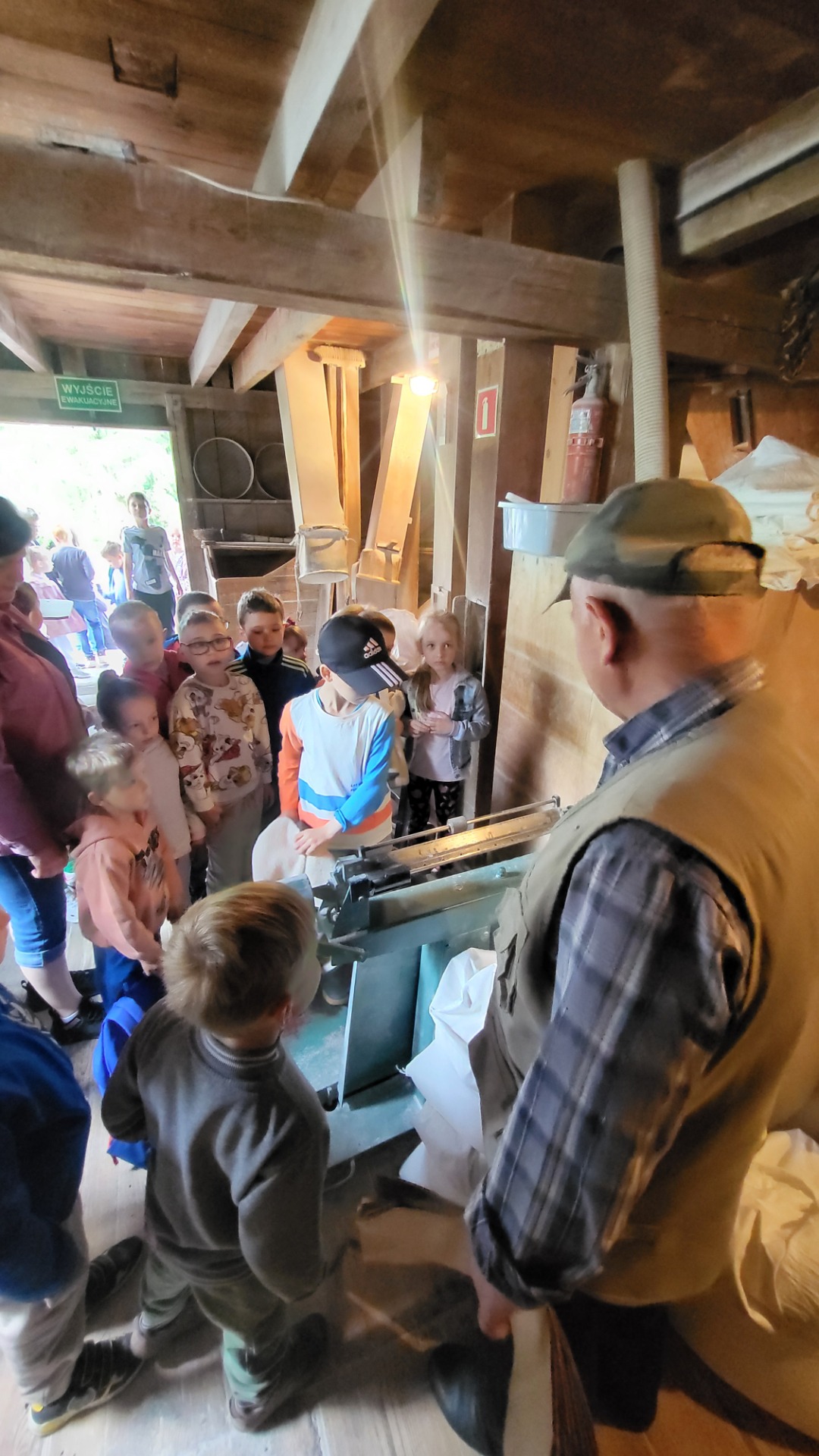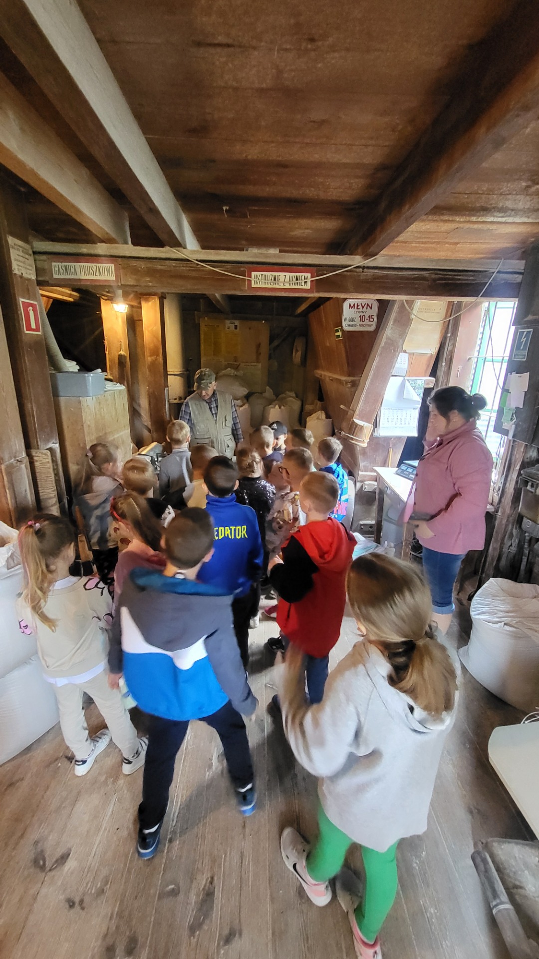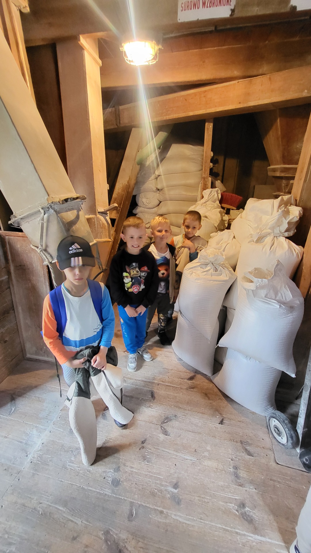 W dniu 03.06.2025r., uczniowie klas 0 – III wraz z opiekunami wybrali się na wycieczkę do Grążowic oraz Januszewic. Pierwszym punktem wyjazdu była wizyta w młynie w Grążowicach. Dzieci miały okazję odwiedzić zabytkowy młyn. Właścicielem młyna jest Pan Ryszard Kupis. Miejsce to zrobiło na wszystkich bardzo duże wrażenie. Uczniowie zwiedzili młyn, poznali i zobaczyli cały proces produkcji mąki od ziarenka do gotowego produktu z wykorzystaniem znajdujących się tam maszyn. Miały okazję również poznać pracę młynarza - dziś już tak zapomnianego zawodu. Pan Ryszard bardzo ciekawie i z zaangażowaniem opowiadał o historii tego miejsca, zaprezentował eksponaty prawdziwej rzemieślniczej pracy młynarza oraz cierpliwie odpowiadał na wszystkie pytania. Pokazał w jaki sposób działają maszyny, jak przerabiane jest zboże począwszy od przyjęcia w młynie, aż do momentu gdy mąka trafia do piekarni, cukierni lub do sklepu.