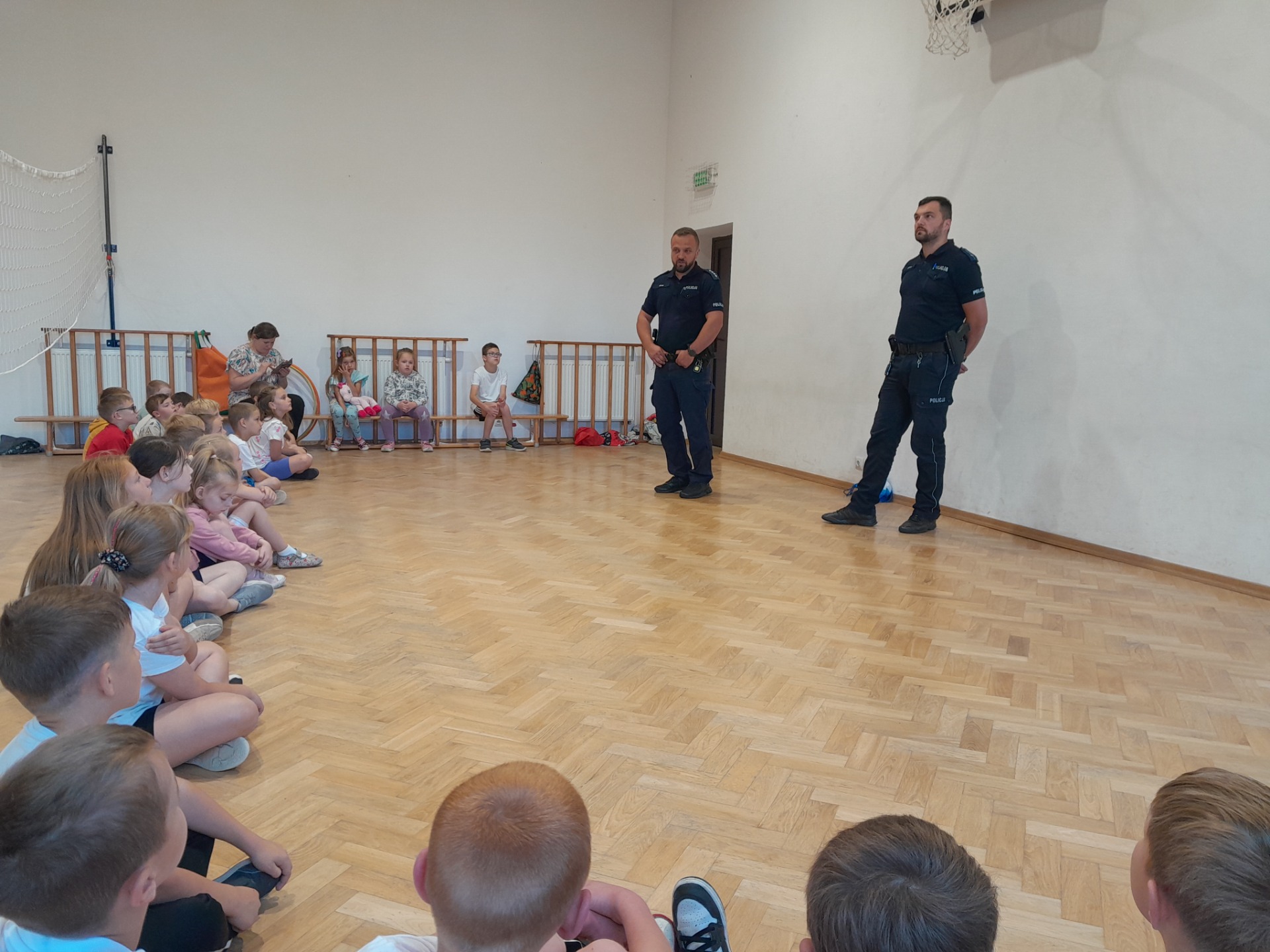 W klasach I–III policjanci przeprowadzili pogadanki dotyczące bezpieczeństwa podczas wakacji, ze szczególnym uwzględnieniem zagrożeń wynikających z przebywania w pobliżu dróg, zbiorników wodnych, a także zachowania ostrożności podczas prac polowych.