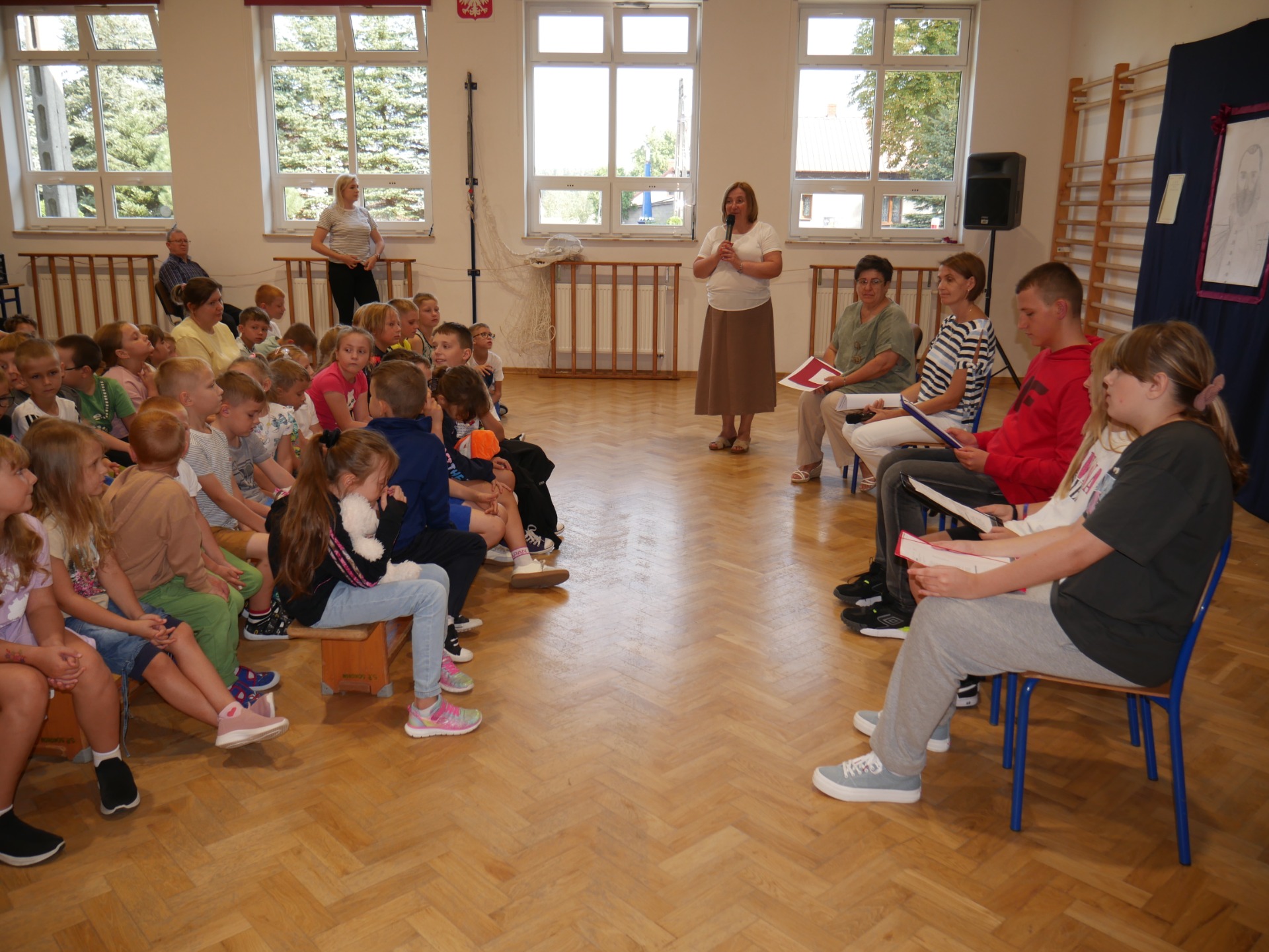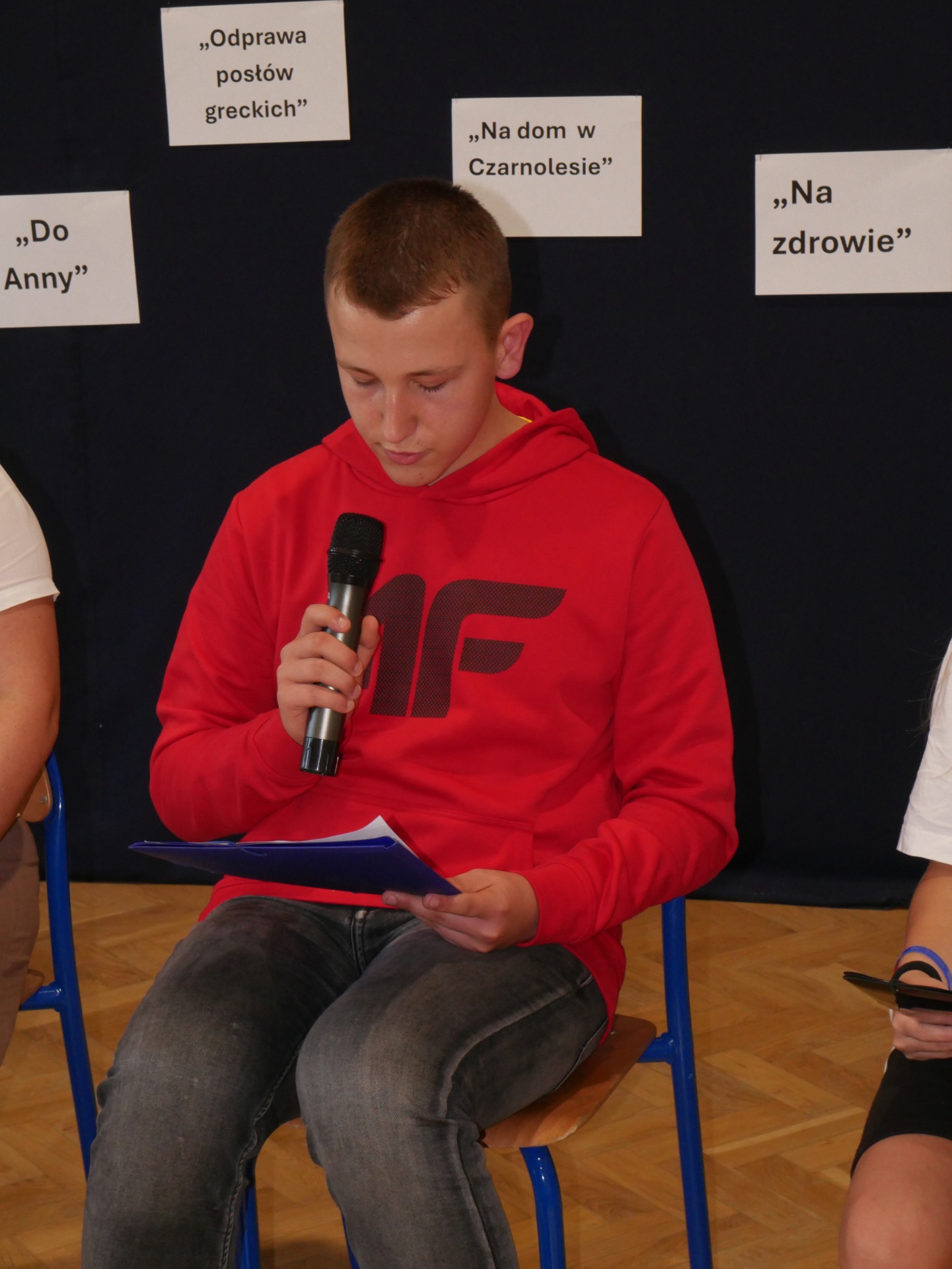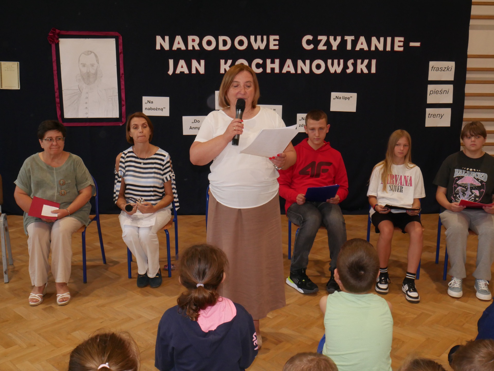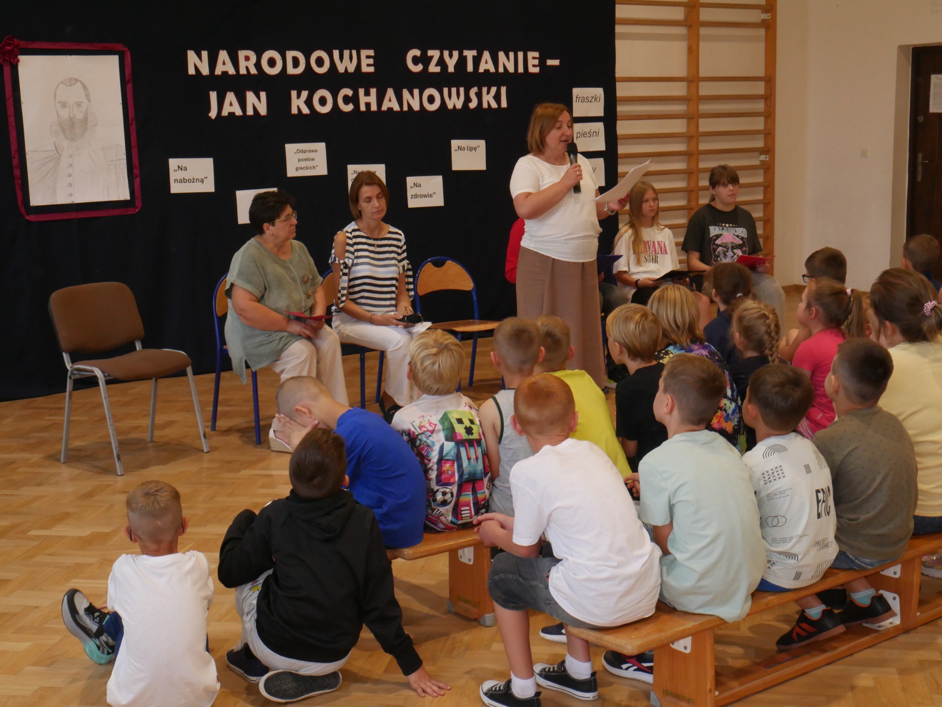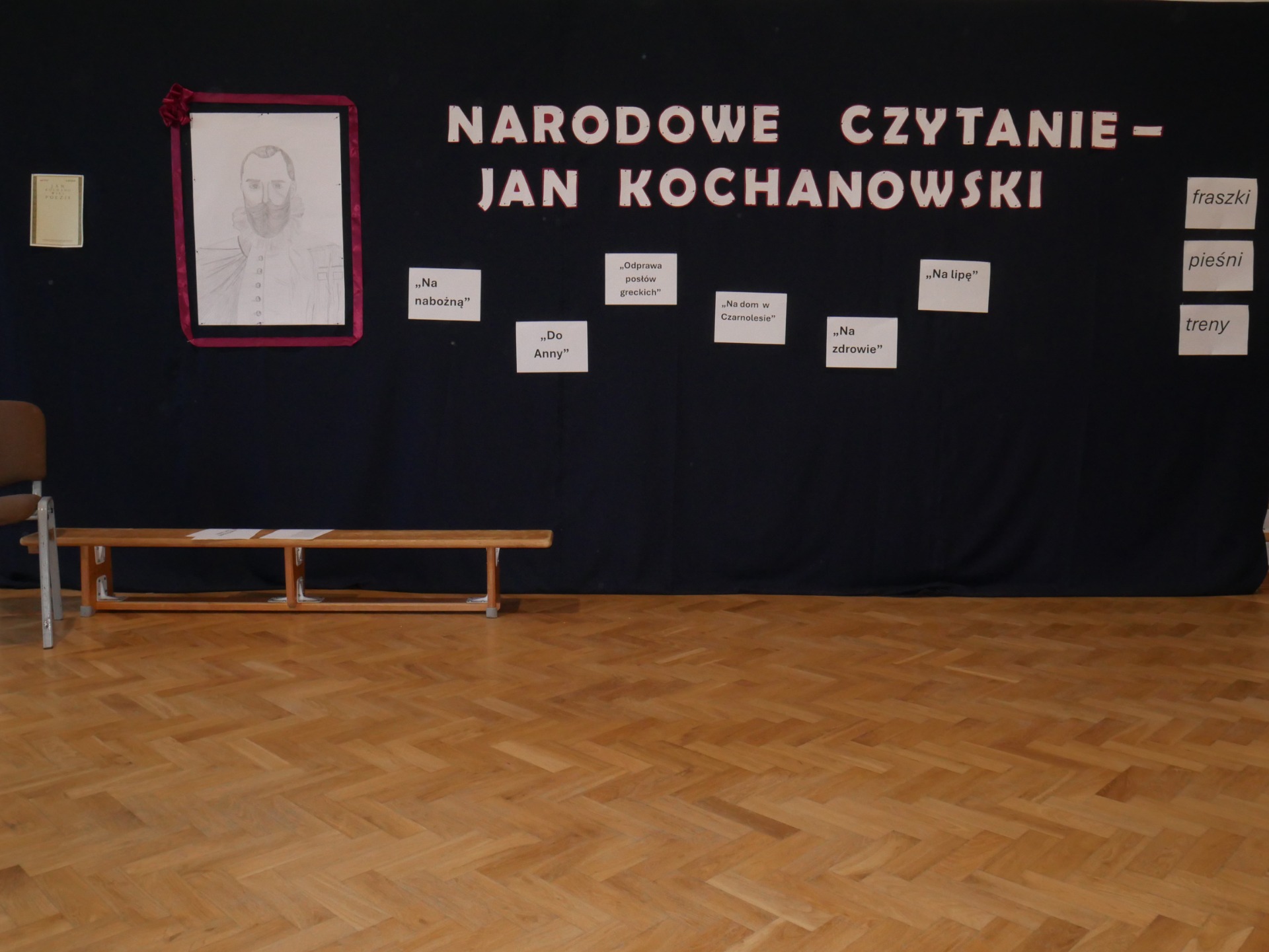 Nasza szkoła czynnie włączyła się do tego, zachęcającego do czytania, wydarzenia. Uczeń klasy VIII- Adam Sikora przybliżył zgromadzonym postać Jana Kochanowskiego- jednego z pierwszych, którzy wybrali jako język swych dzieł- język polski. Choć żył i tworzył pięćset lat temu możemy o Janie z Czarnolasu powiedzieć, że był człowiekiem wielu talentów. Dobrze wykształcony, oczytany, towarzyski, lubiący podróże i znający kilka języków... To tylko niektóre z jego zalet. Warto poznać tę mało znaną postać- przedstawiciela polskiego renesansu.