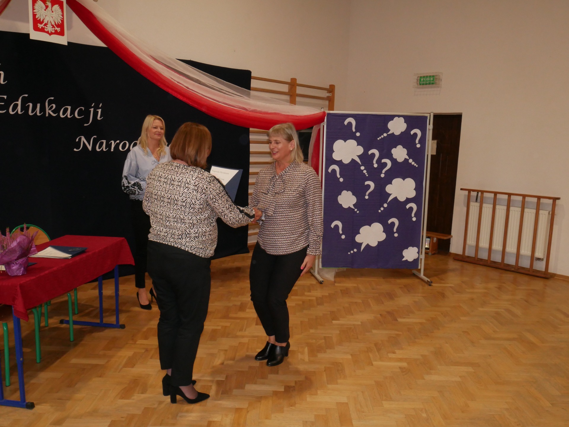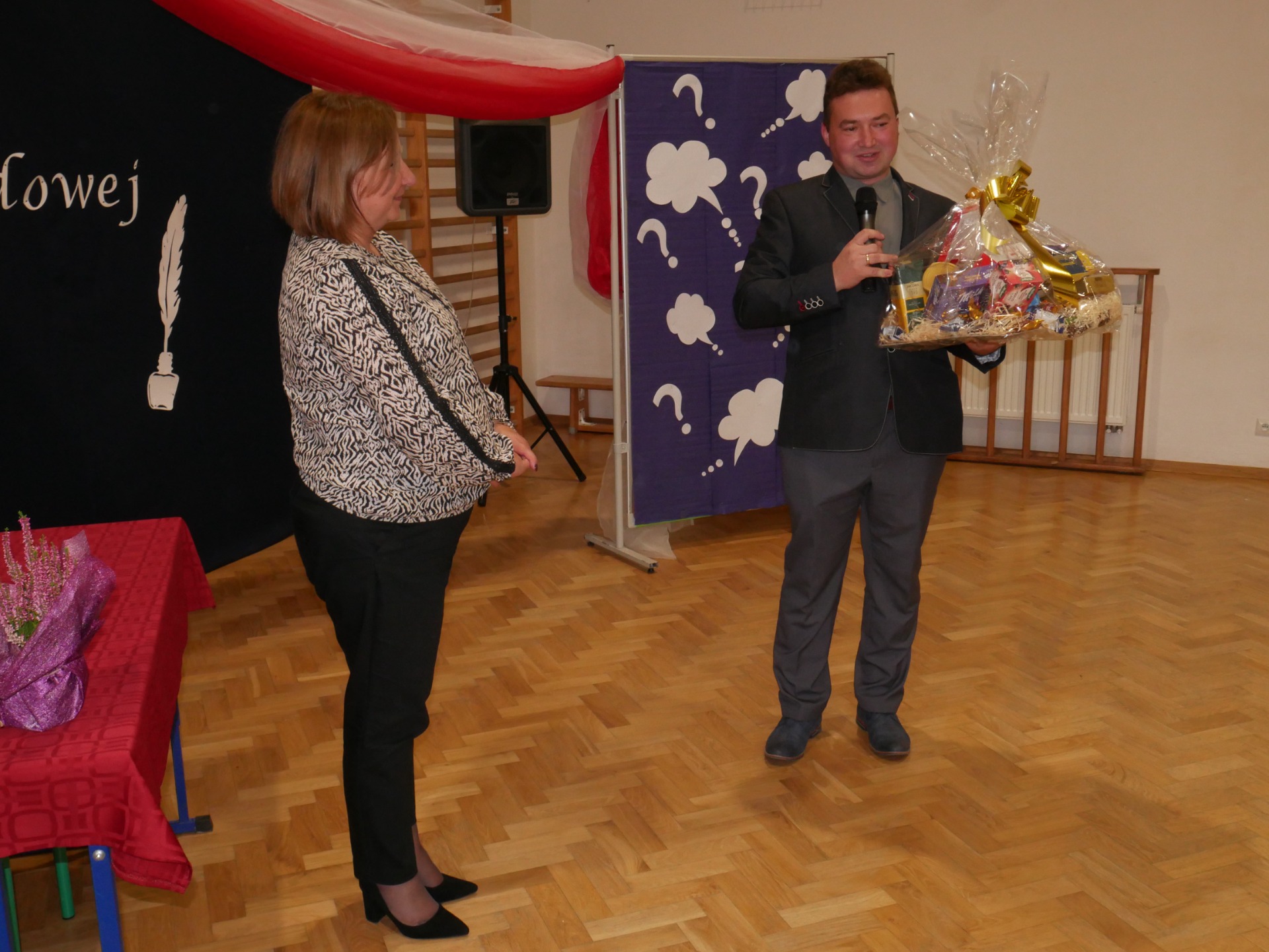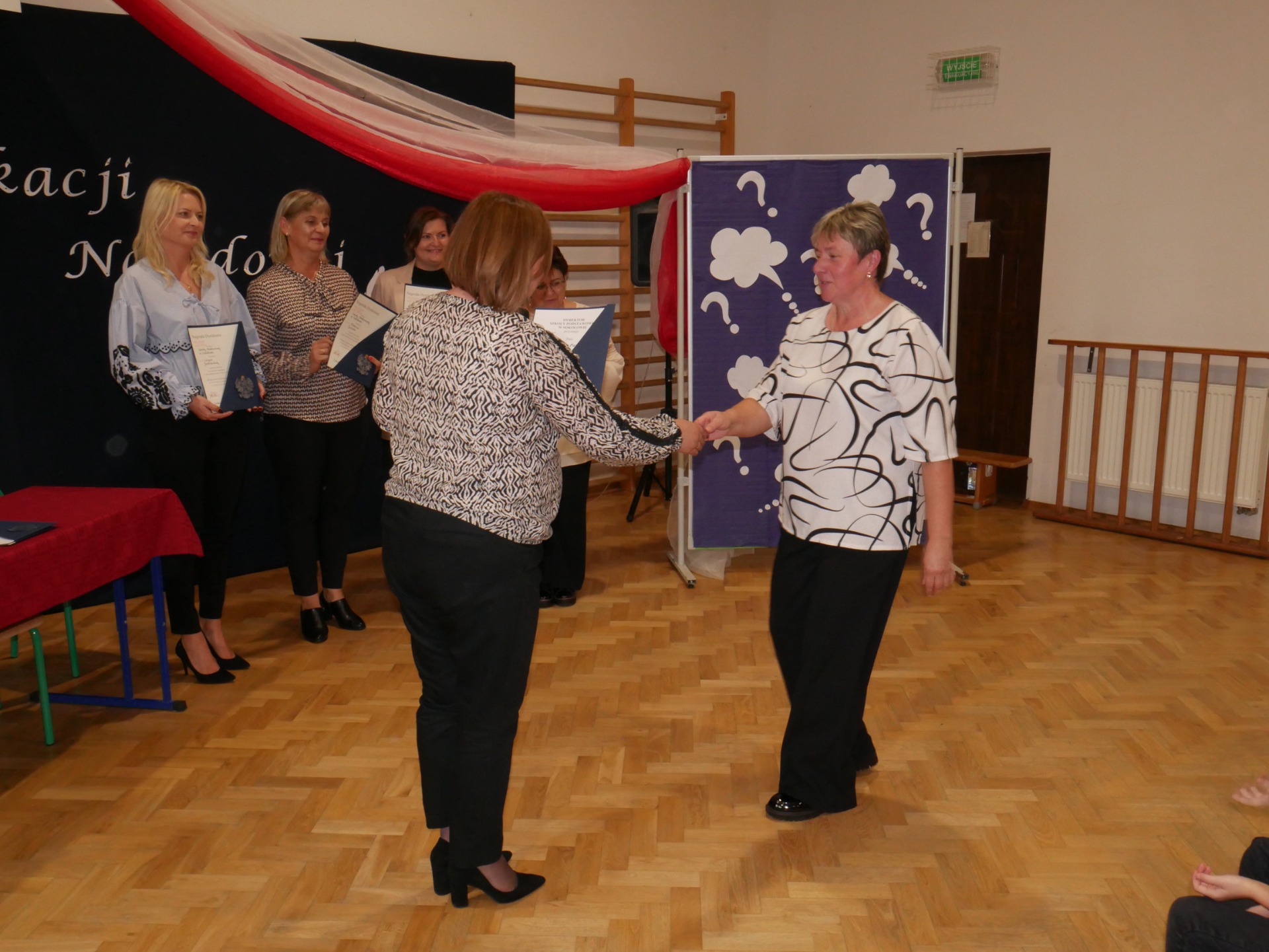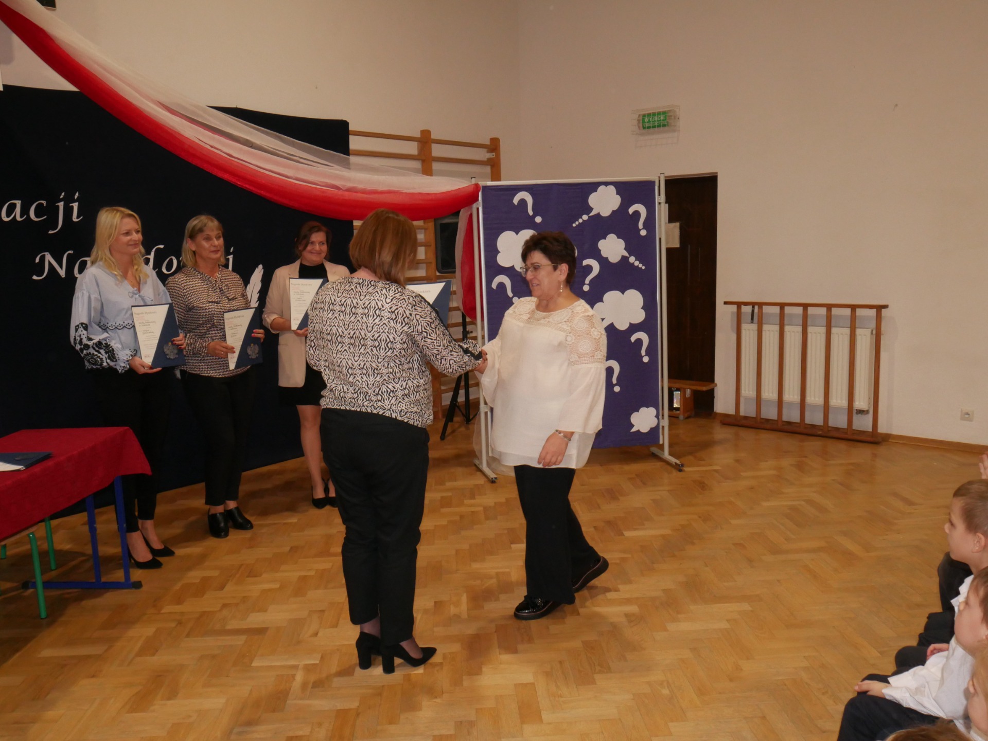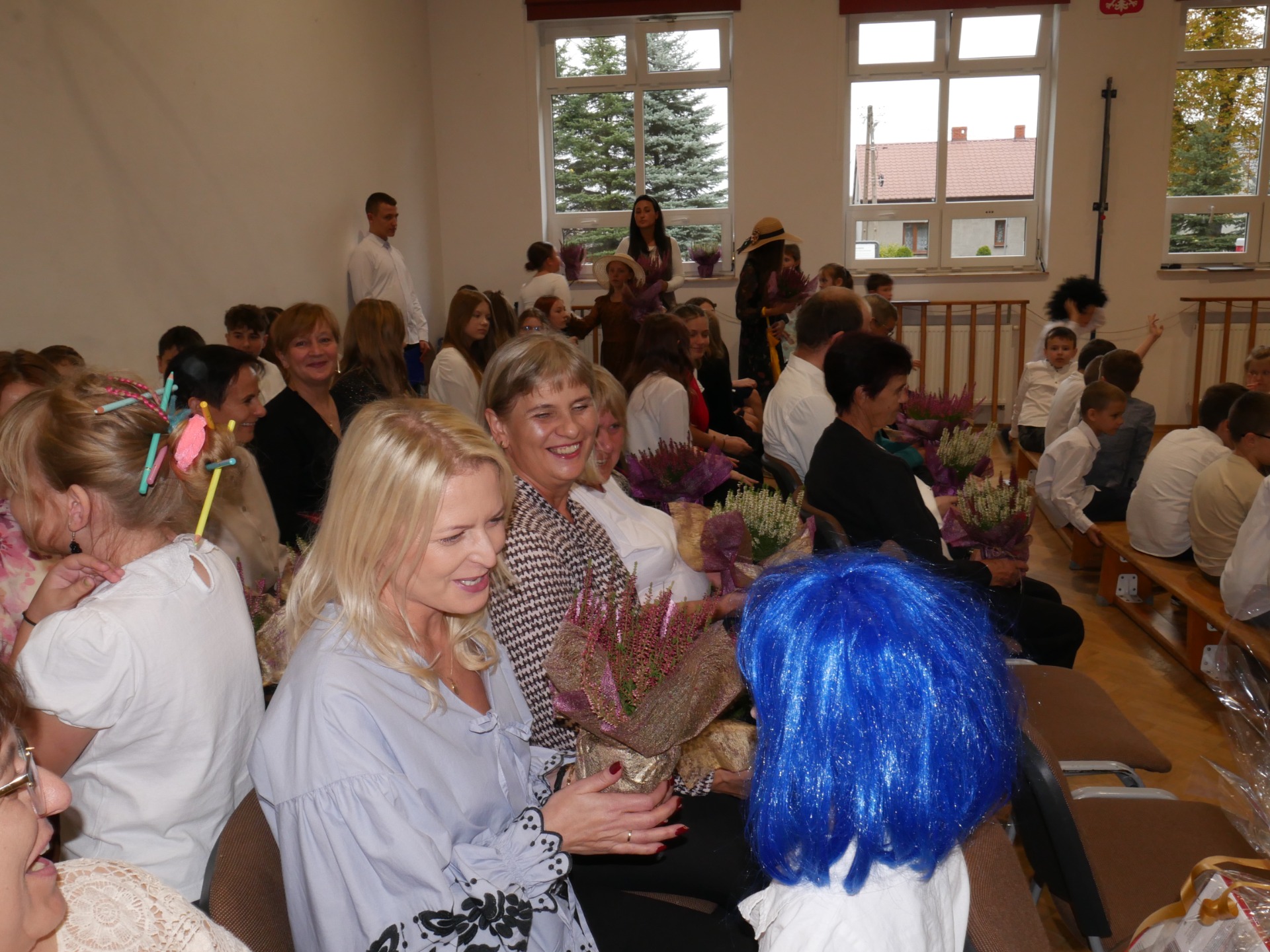 Uroczystość rozpoczęła się od Hymnu i powitania przybyłych gości w osobach: p. Anny Gliszczyńskiej, p. Stanisława Kamińskiego, p. Jolanty Gajzler, p. Bożeny Juźwik, p. przewodniczacego Gąsiorowskiego oraz p. Haliny Biniek z kapelą i wszystkich pozostałych uczestników. Uczniowie uświetnili uroczystość słowno - muzycznym występem, pełnym humoru i zabawy. Pracownicy szkoły zostali obdarowani pięknymi kwiatami - wrzosami. Pani dyrektor Sylwia Sarna - Jurek wręczła nagrody dla nauczycieli i pracowników administracji. Otrzymali je państwo: Edyta Jackowska, Bożena Juźwik, Sylwia Kaczmarek, Małgorzata Wilk, Dorota Pawlik, Zuzanna Wiktorowicz, Przemysław Borowski i Grzegorz Pawlik. Przewodniczący Rady Rodziców podziękował za miłą wspólpracę i wręczył na ręce p. dyrektor słodki upominek