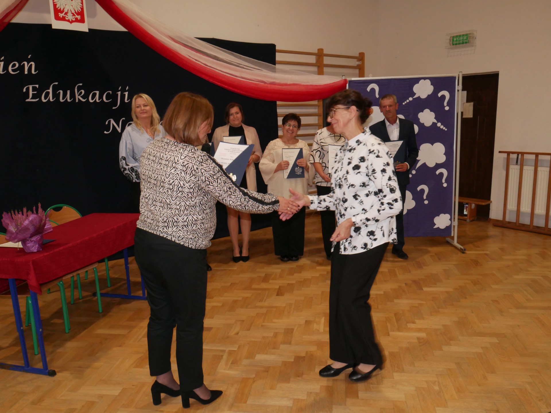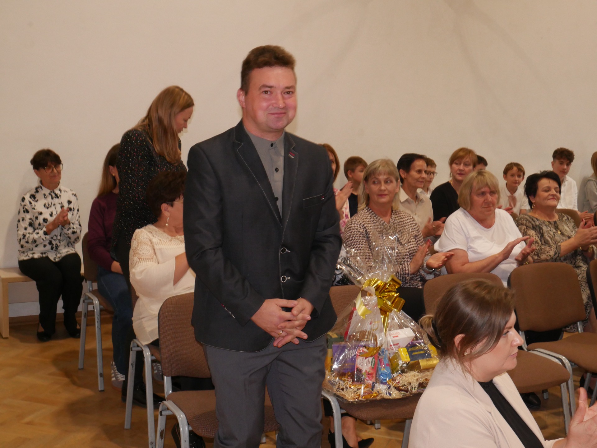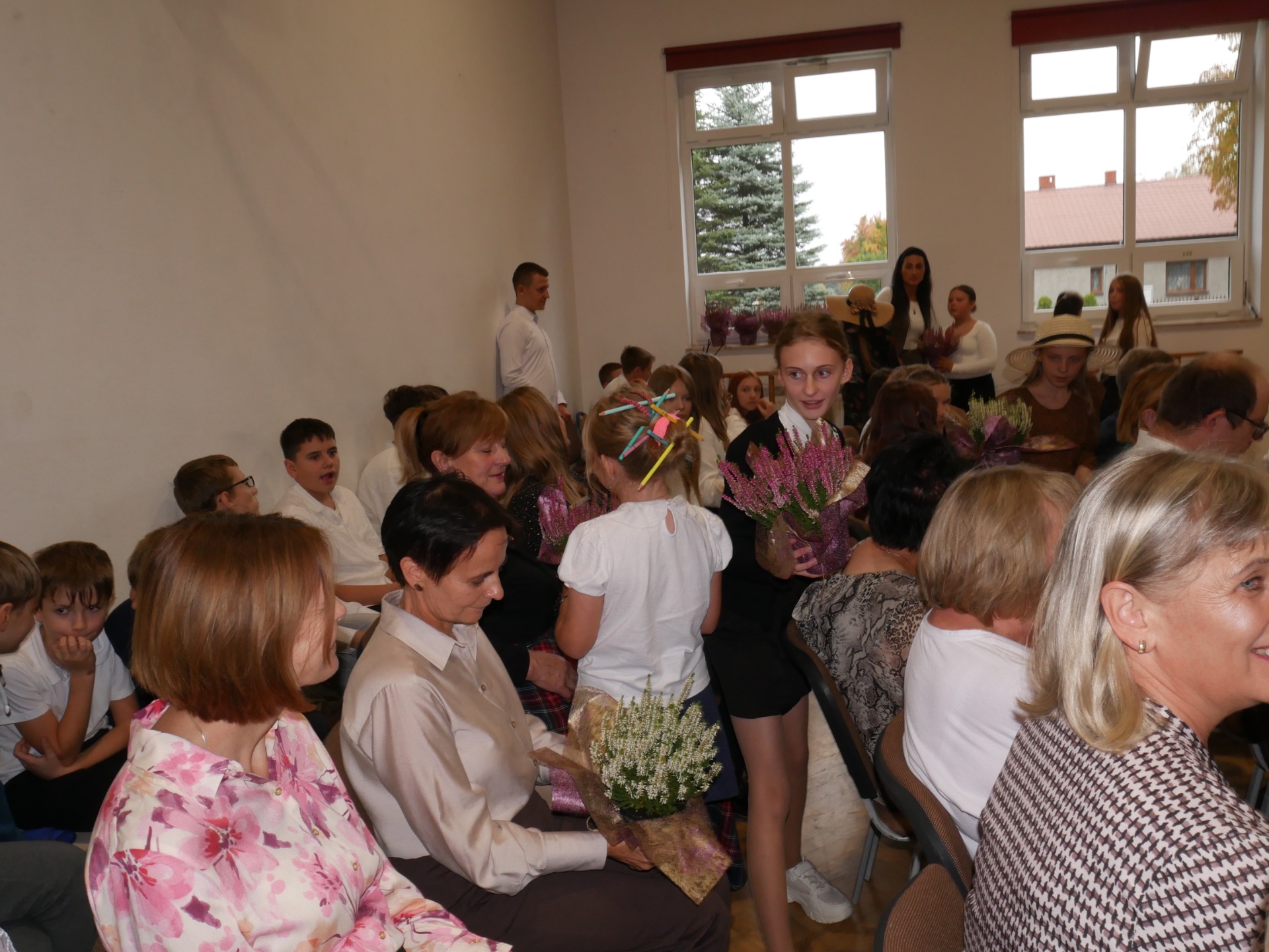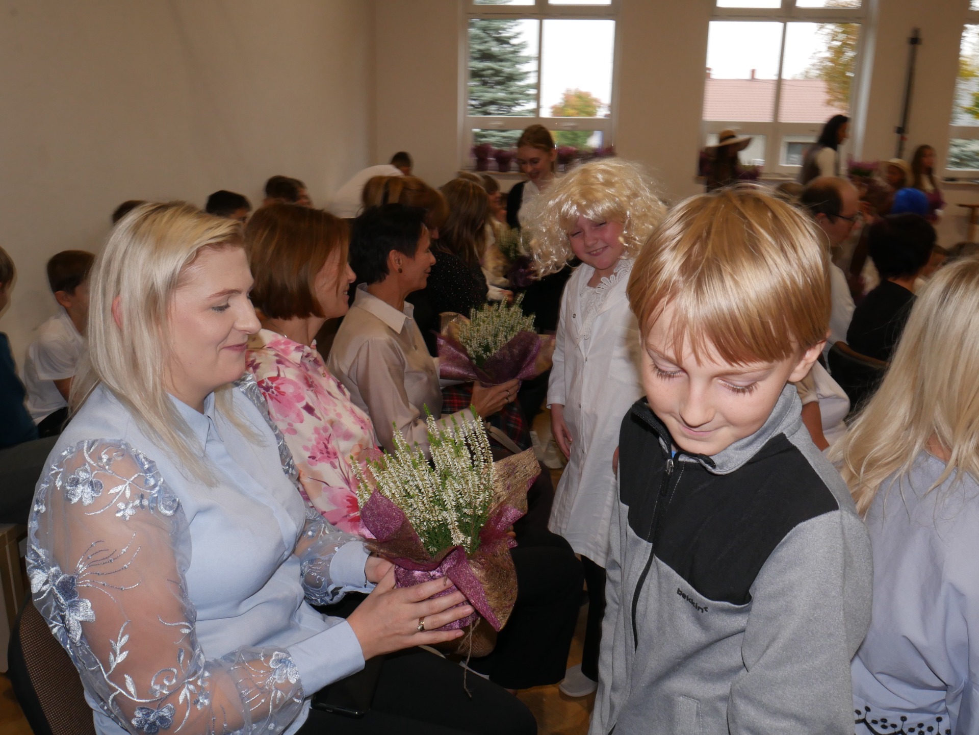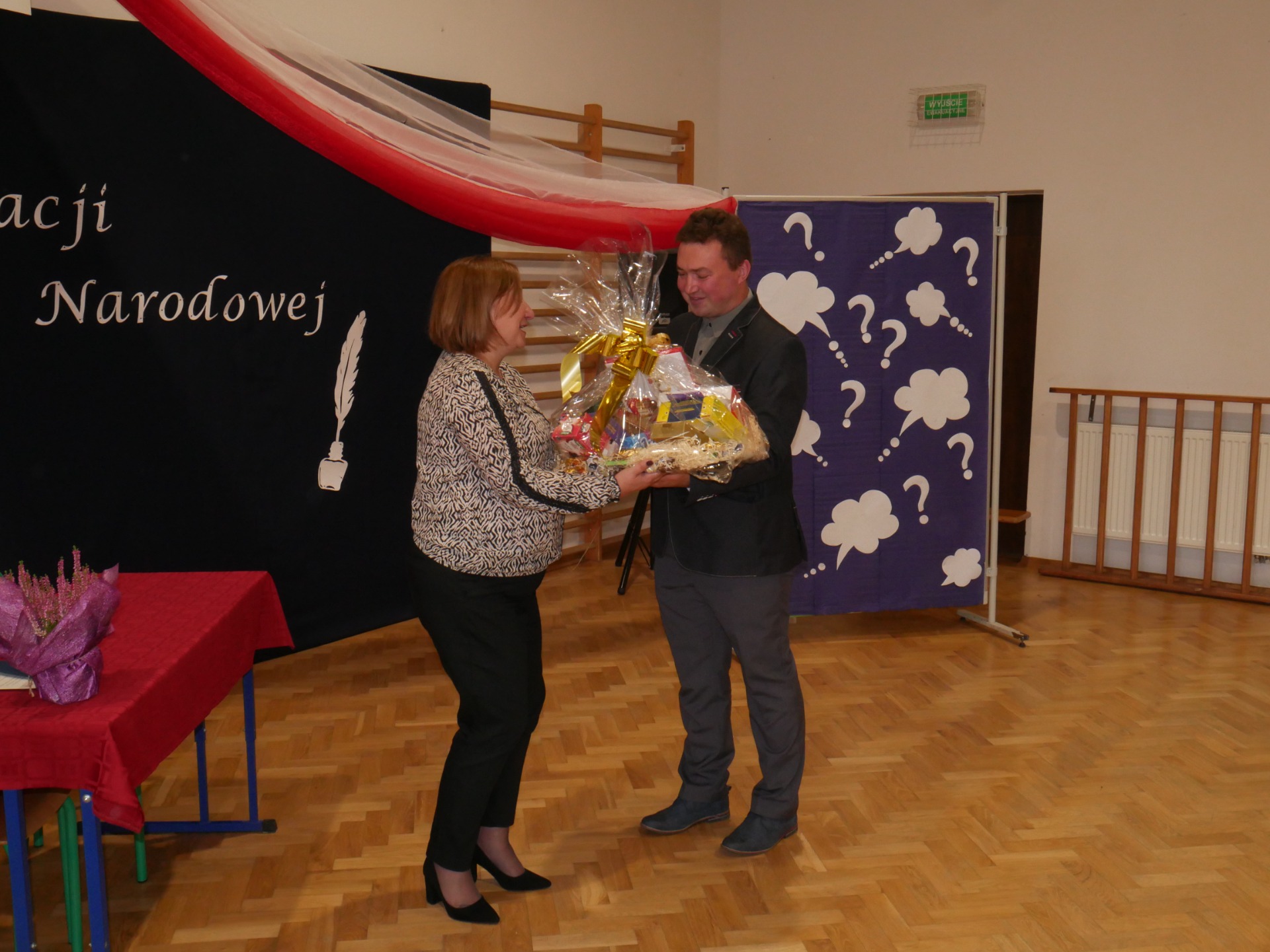 Uroczystość rozpoczęła się od Hymnu i powitania przybyłych gości w osobach: p. Anny Gliszczyńskiej, p. Stanisława Kamińskiego, p. Jolanty Gajzler, p. Bożeny Juźwik, p. przewodniczacego Gąsiorowskiego oraz p. Haliny Biniek z kapelą i wszystkich pozostałych uczestników. Uczniowie uświetnili uroczystość słowno - muzycznym występem, pełnym humoru i zabawy. Pracownicy szkoły zostali obdarowani pięknymi kwiatami - wrzosami. Pani dyrektor Sylwia Sarna - Jurek wręczła nagrody dla nauczycieli i pracowników administracji. Otrzymali je państwo: Edyta Jackowska, Bożena Juźwik, Sylwia Kaczmarek, Małgorzata Wilk, Dorota Pawlik, Zuzanna Wiktorowicz, Przemysław Borowski i Grzegorz Pawlik. Przewodniczący Rady Rodziców podziękował za miłą wspólpracę i wręczył na ręce p. dyrektor słodki upominek