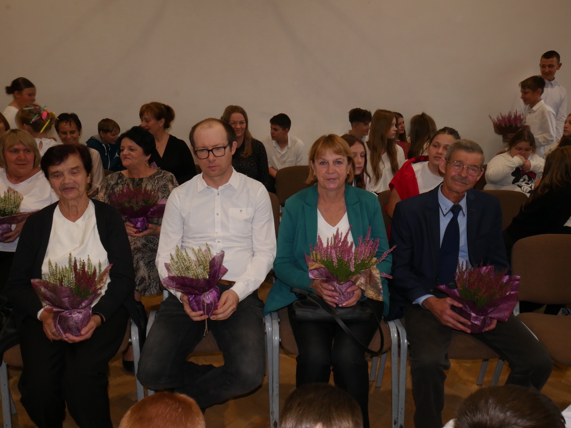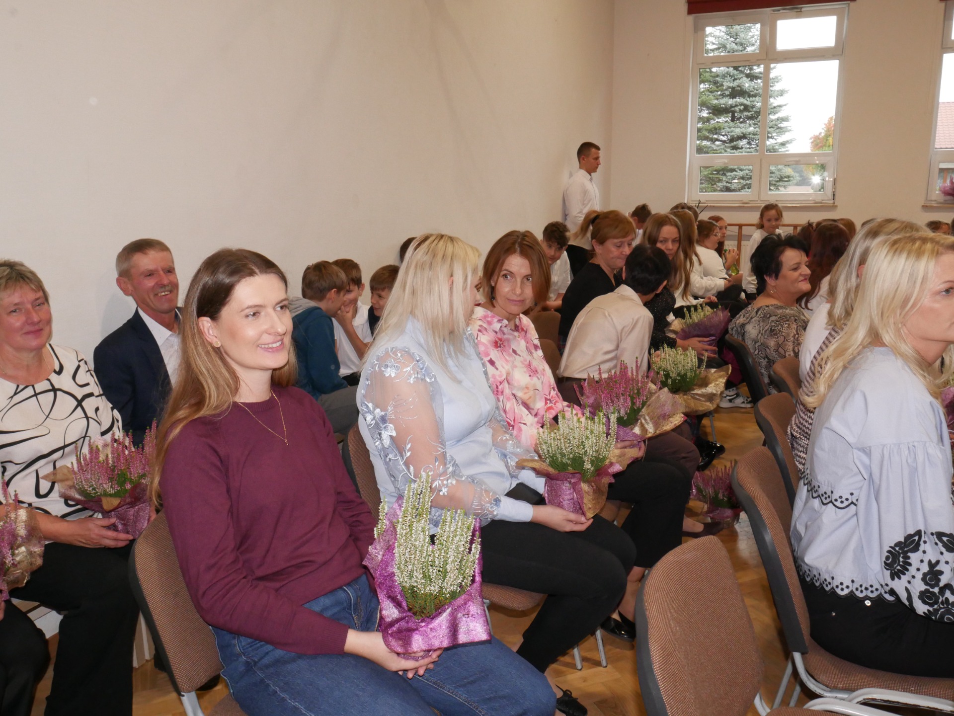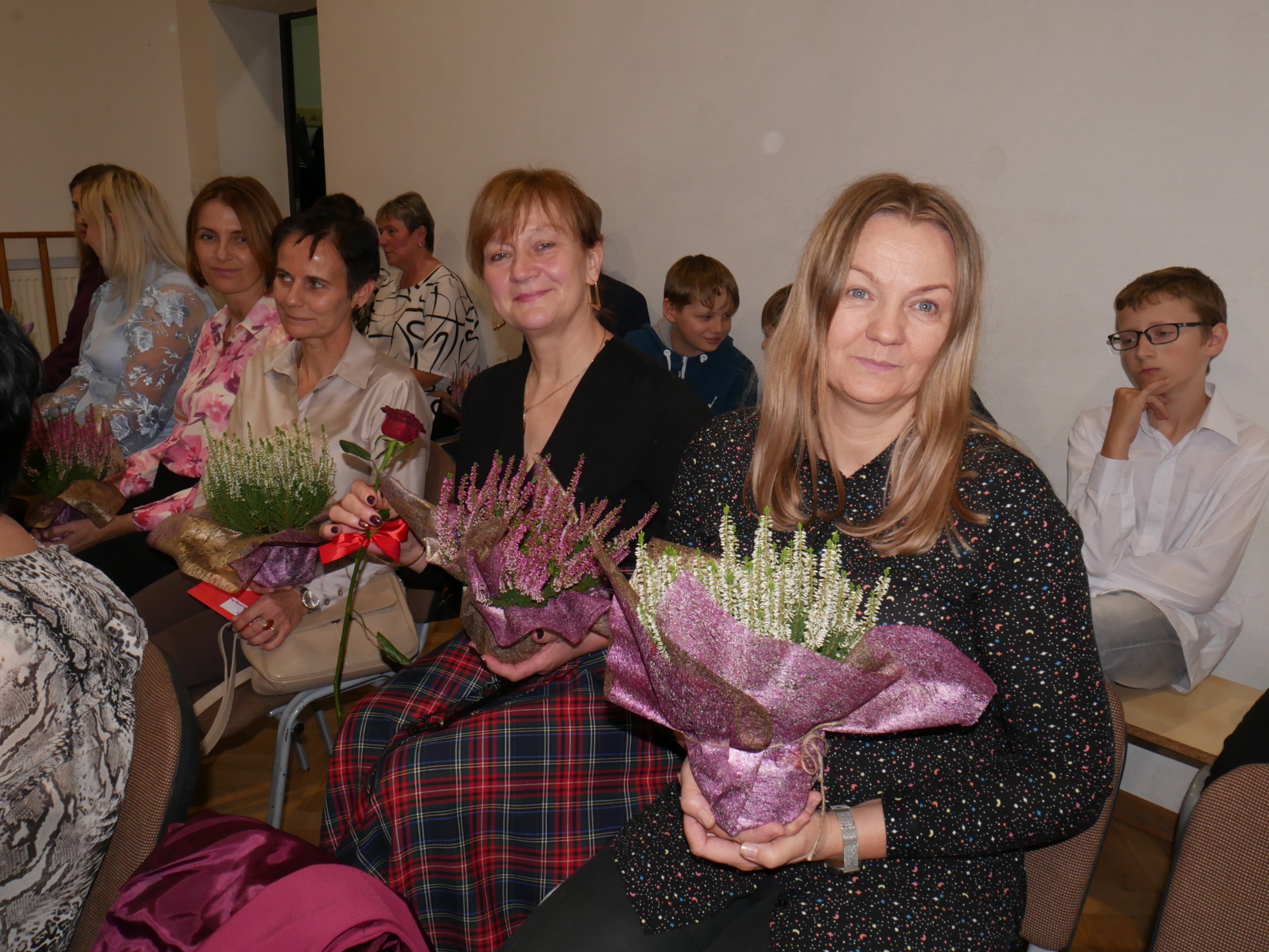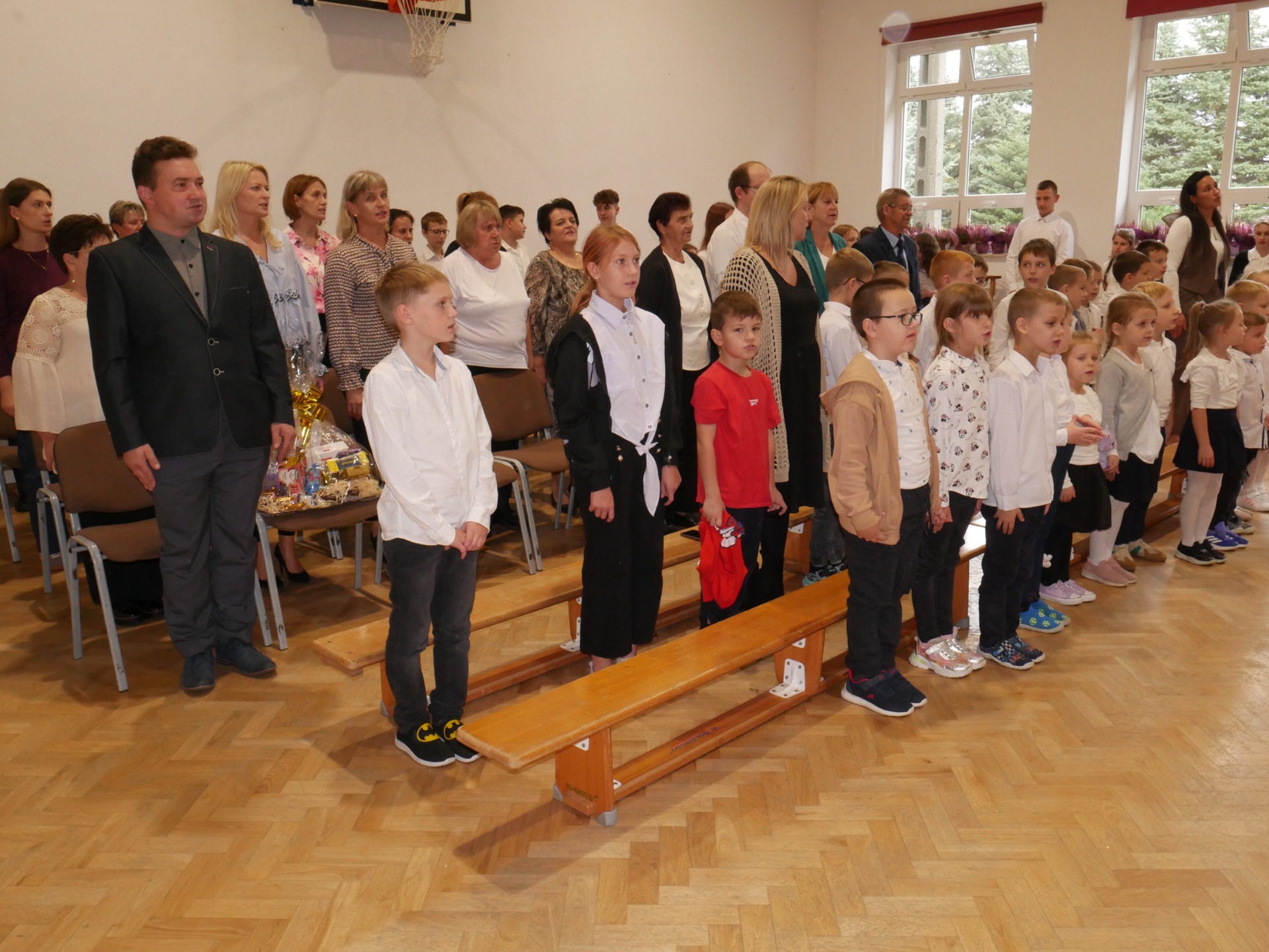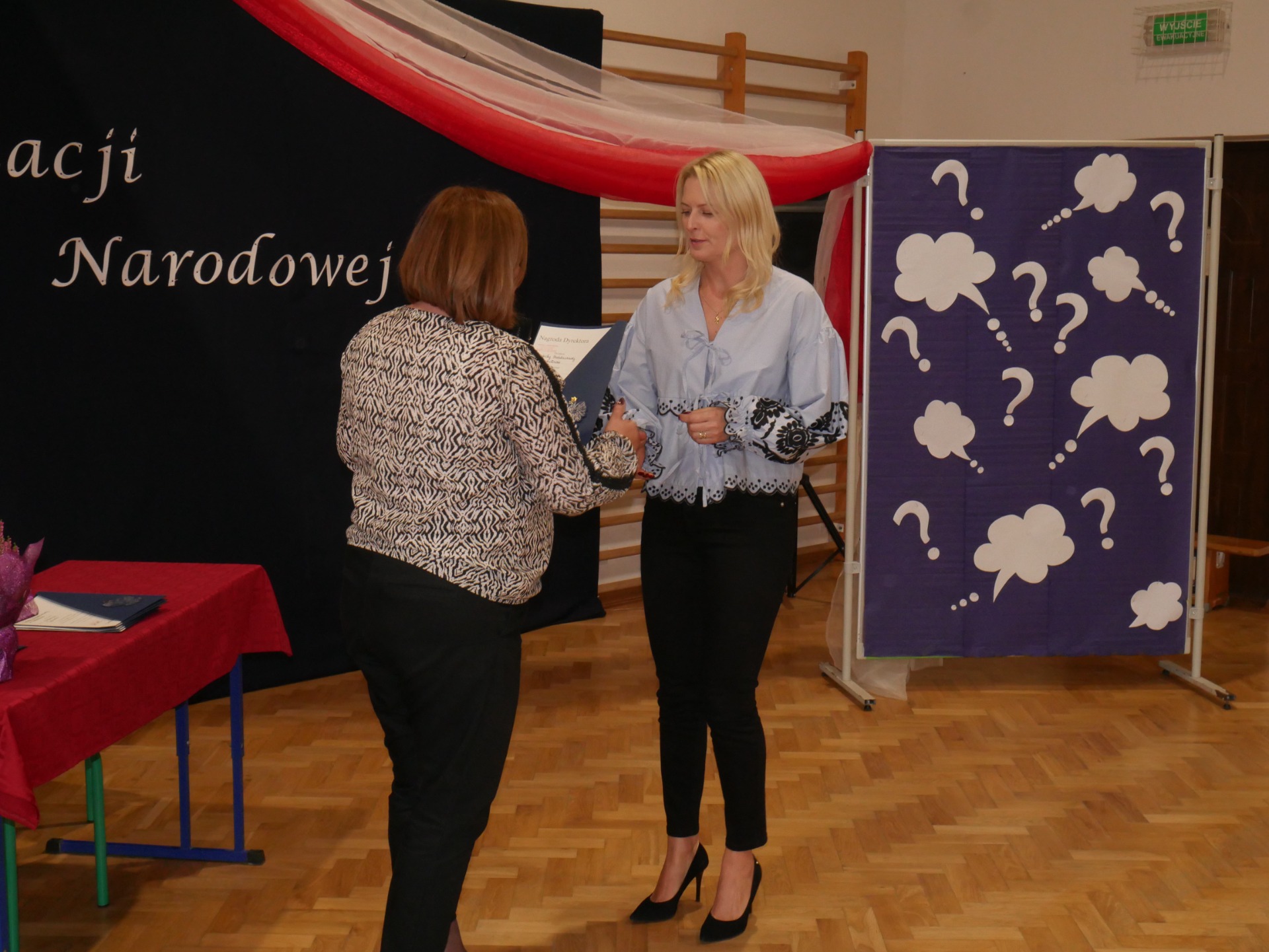 Uroczystość rozpoczęła się od Hymnu i powitania przybyłych gości w osobach: p. Anny Gliszczyńskiej, p. Stanisława Kamińskiego, p. Jolanty Gajzler, p. Bożeny Juźwik, p. przewodniczacego Gąsiorowskiego oraz p. Haliny Biniek z kapelą i wszystkich pozostałych uczestników. Uczniowie uświetnili uroczystość słowno - muzycznym występem, pełnym humoru i zabawy. Pracownicy szkoły zostali obdarowani pięknymi kwiatami - wrzosami. Pani dyrektor Sylwia Sarna - Jurek wręczła nagrody dla nauczycieli i pracowników administracji. Otrzymali je państwo: Edyta Jackowska, Bożena Juźwik, Sylwia Kaczmarek, Małgorzata Wilk, Dorota Pawlik, Zuzanna Wiktorowicz, Przemysław Borowski i Grzegorz Pawlik. Przewodniczący Rady Rodziców podziękował za miłą wspólpracę i wręczył na ręce p. dyrektor słodki upominek