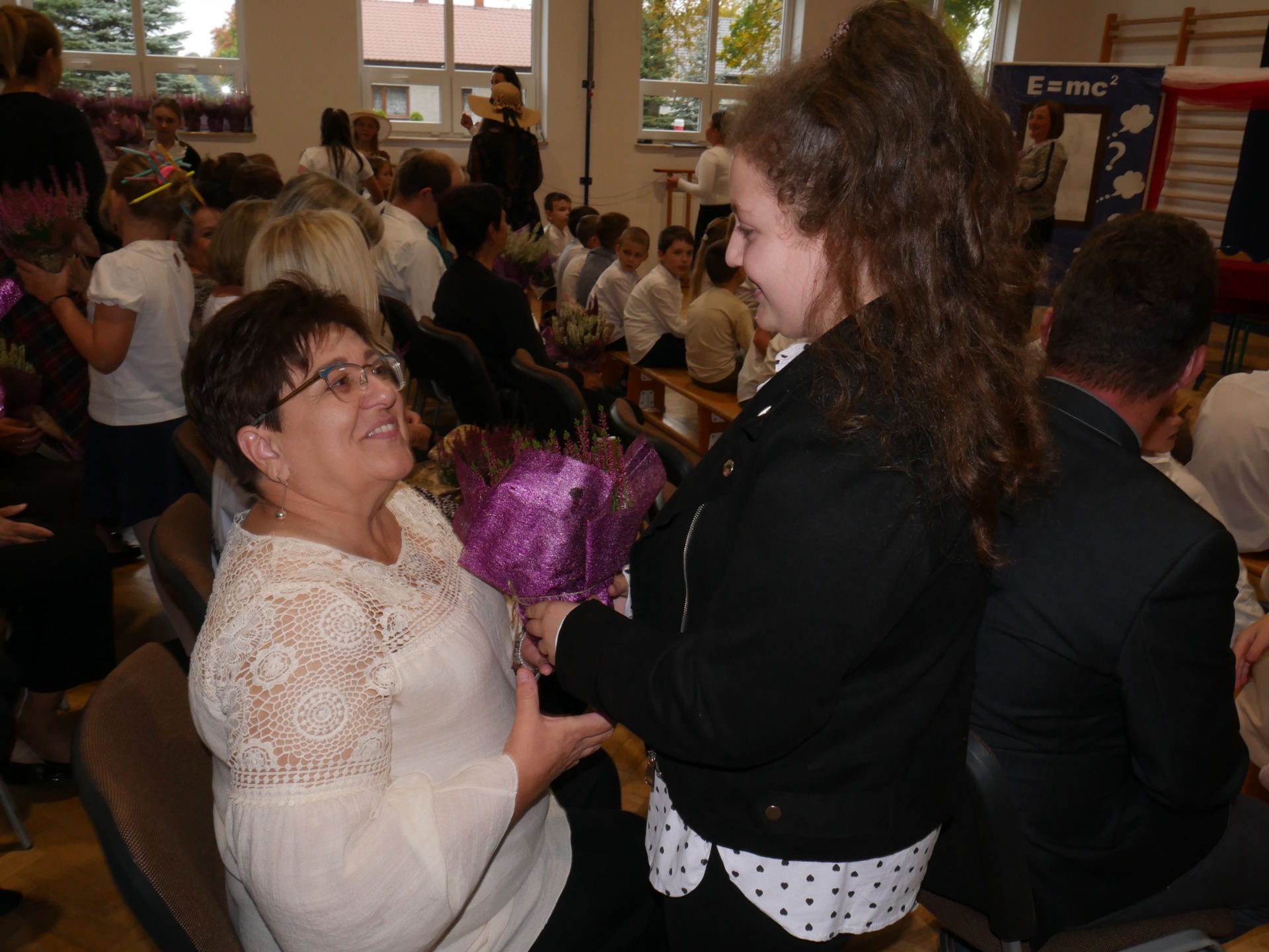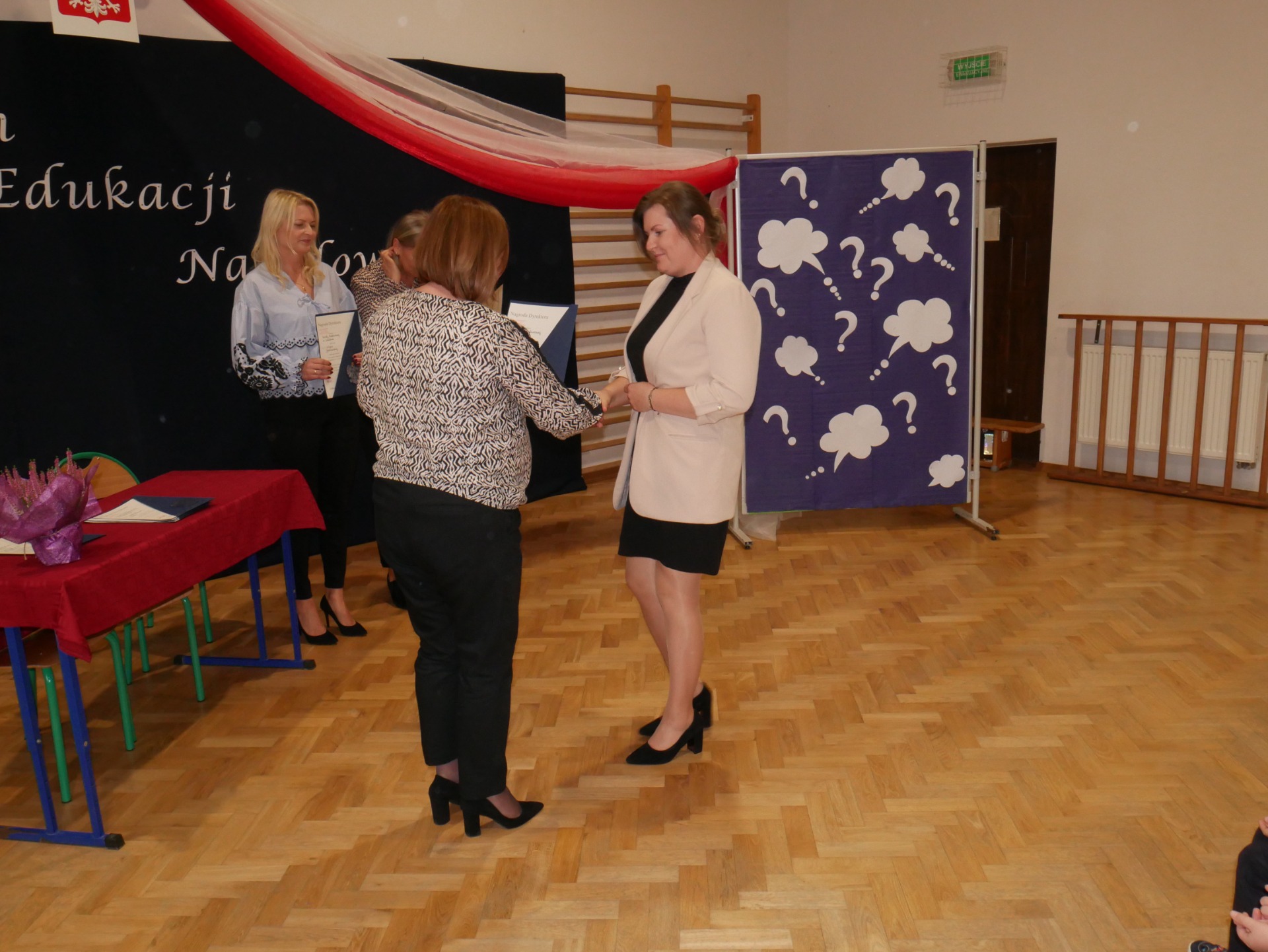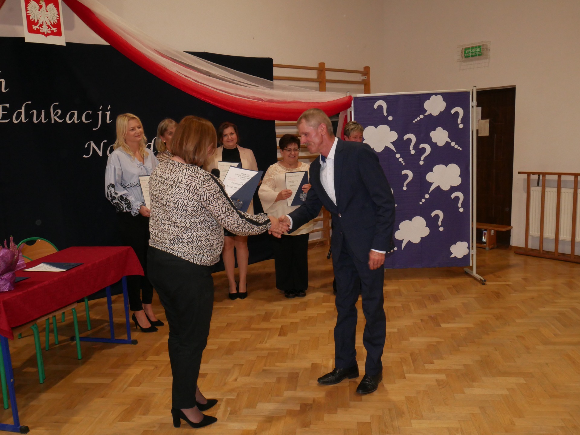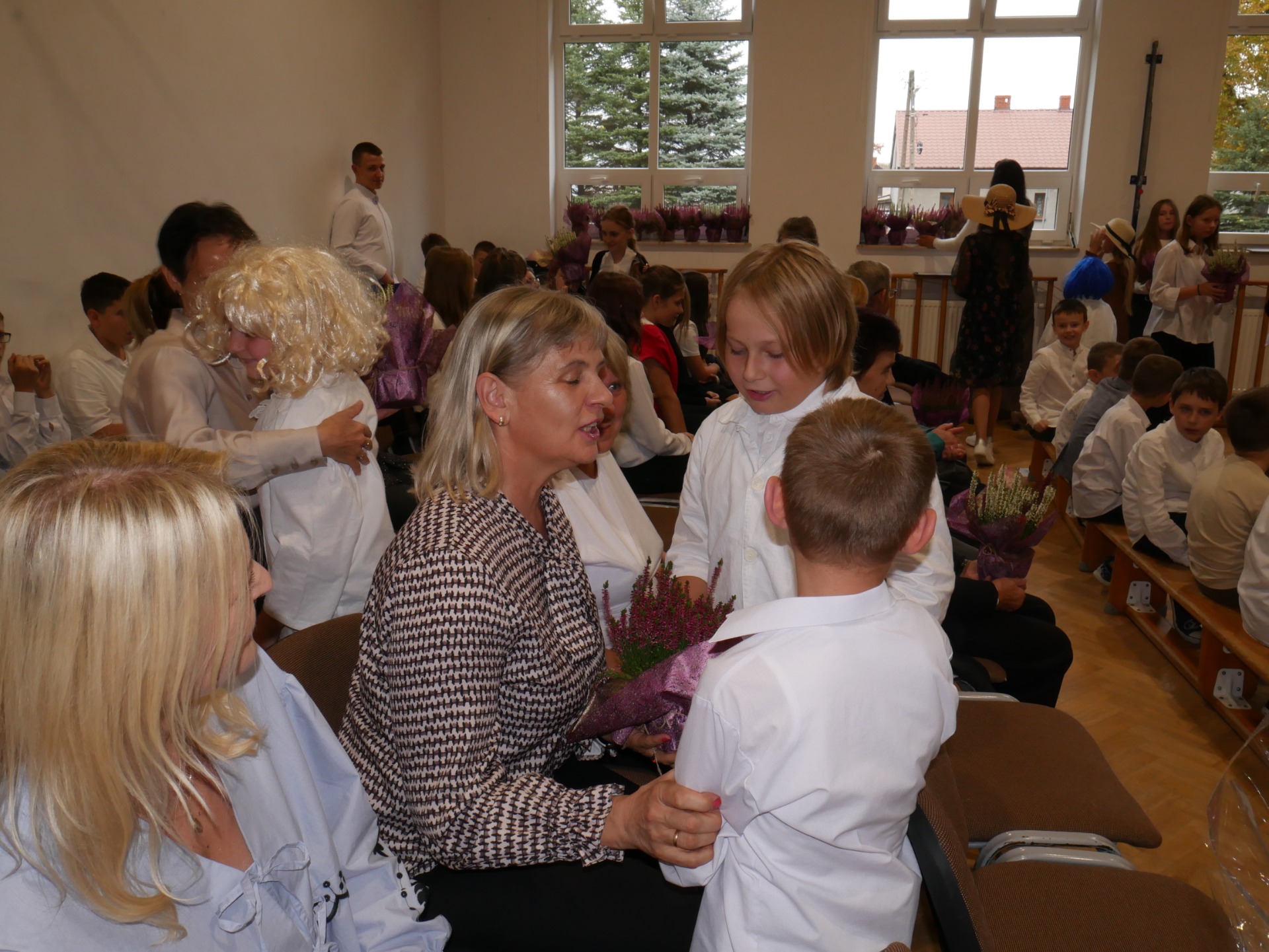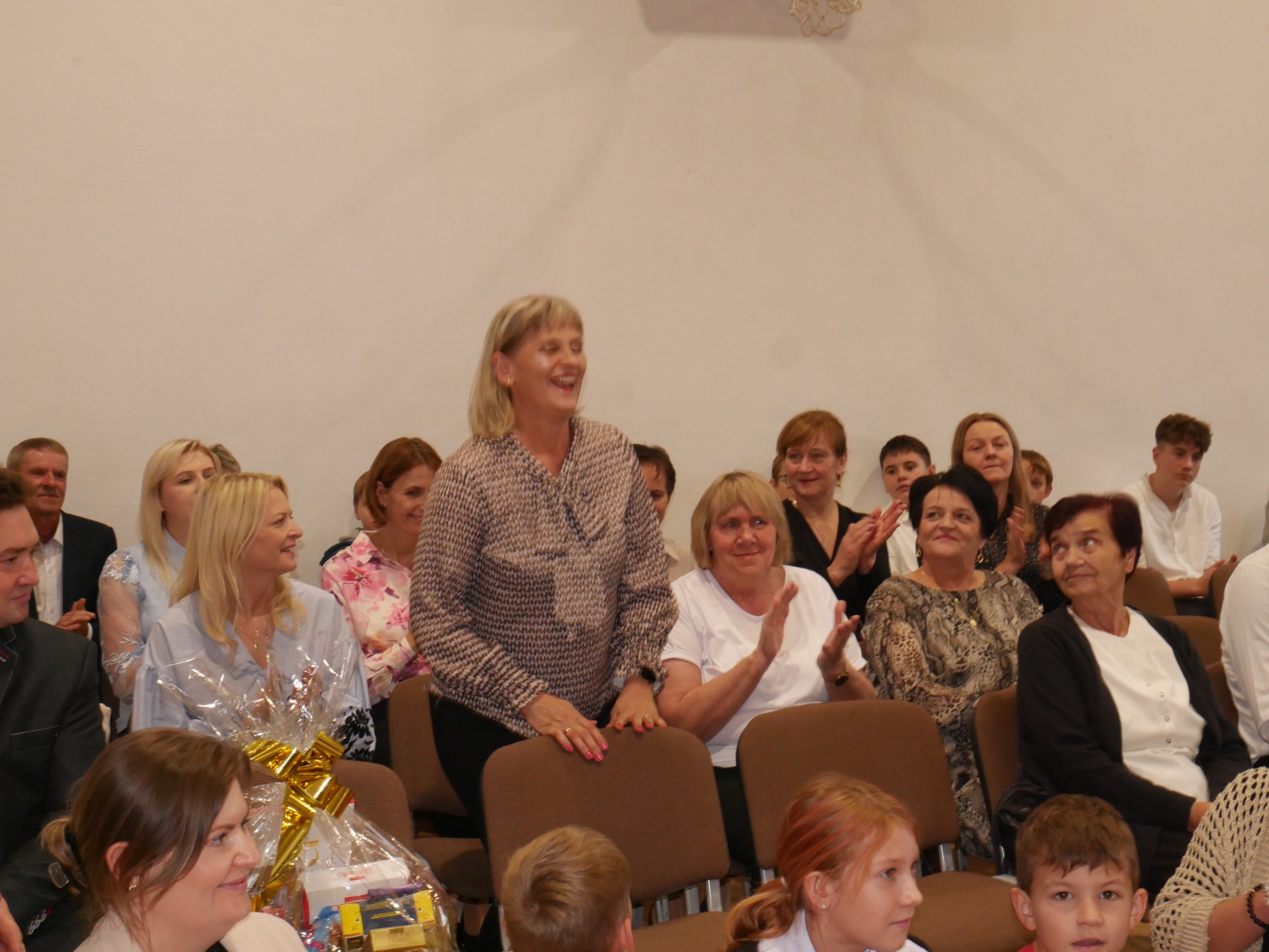 Uroczystość rozpoczęła się od Hymnu i powitania przybyłych gości w osobach: p. Anny Gliszczyńskiej, p. Stanisława Kamińskiego, p. Jolanty Gajzler, p. Bożeny Juźwik, p. przewodniczacego Gąsiorowskiego oraz p. Haliny Biniek z kapelą i wszystkich pozostałych uczestników. Uczniowie uświetnili uroczystość słowno - muzycznym występem, pełnym humoru i zabawy. Pracownicy szkoły zostali obdarowani pięknymi kwiatami - wrzosami. Pani dyrektor Sylwia Sarna - Jurek wręczła nagrody dla nauczycieli i pracowników administracji. Otrzymali je państwo: Edyta Jackowska, Bożena Juźwik, Sylwia Kaczmarek, Małgorzata Wilk, Dorota Pawlik, Zuzanna Wiktorowicz, Przemysław Borowski i Grzegorz Pawlik. Przewodniczący Rady Rodziców podziękował za miłą wspólpracę i wręczył na ręce p. dyrektor słodki upominek