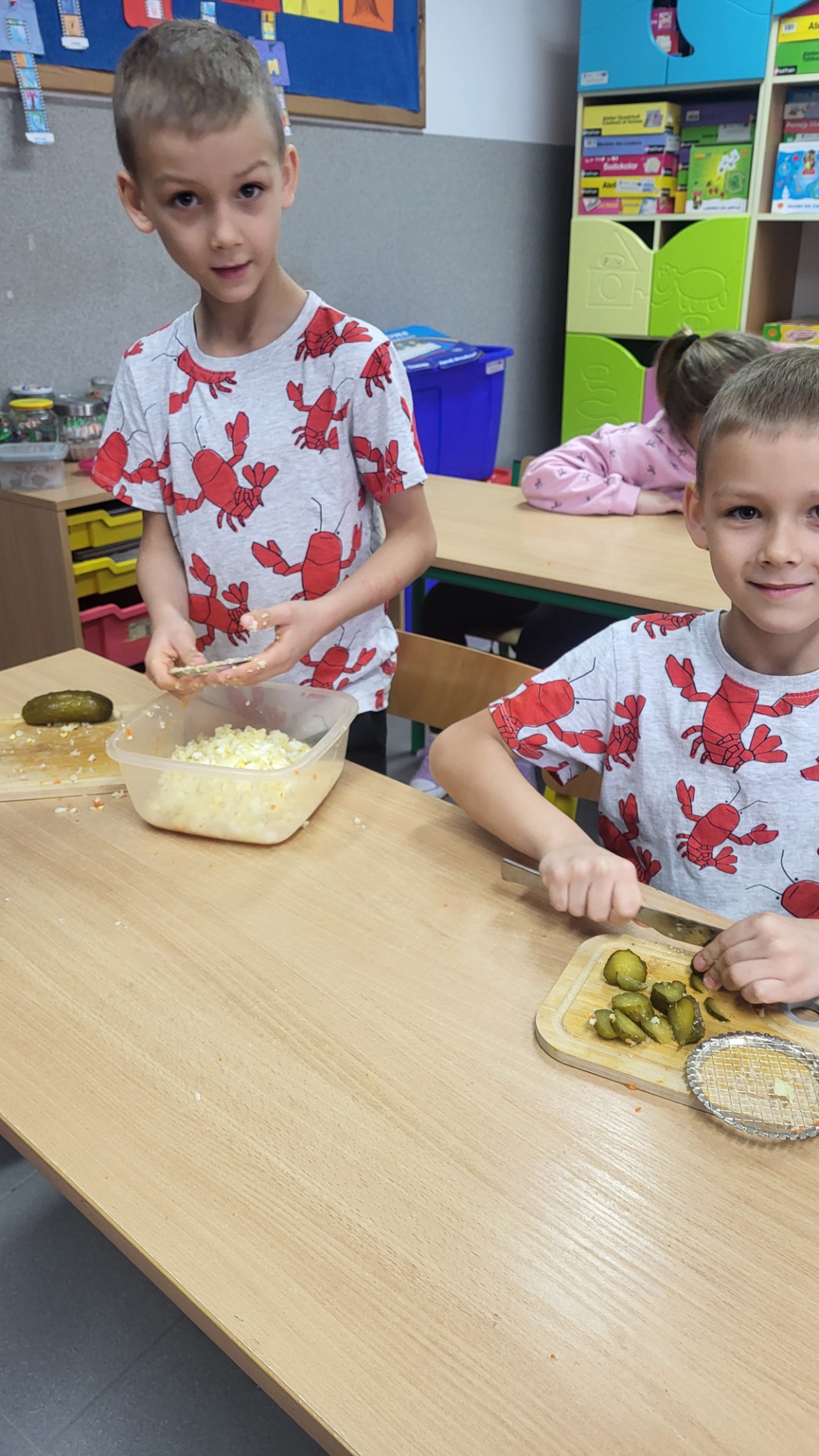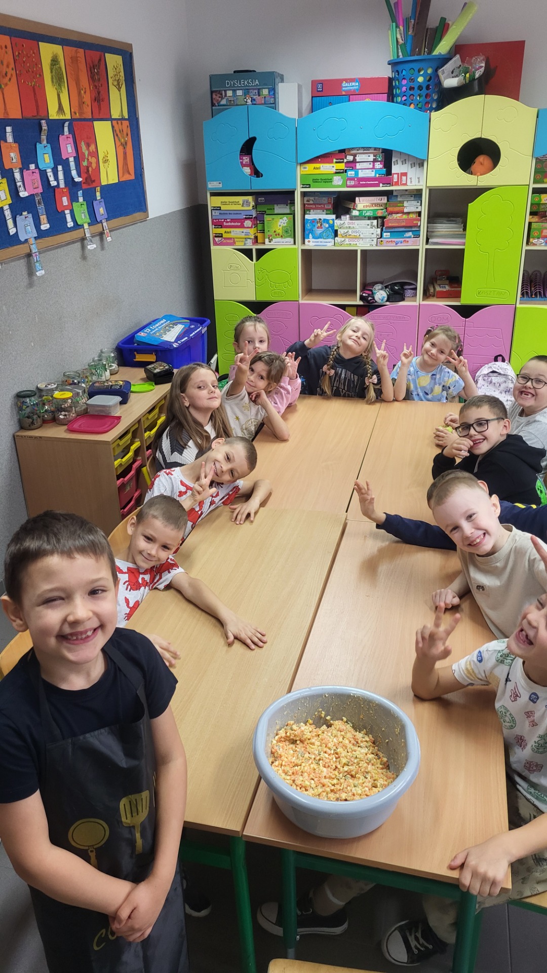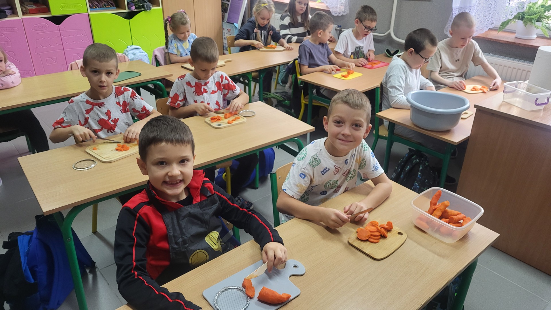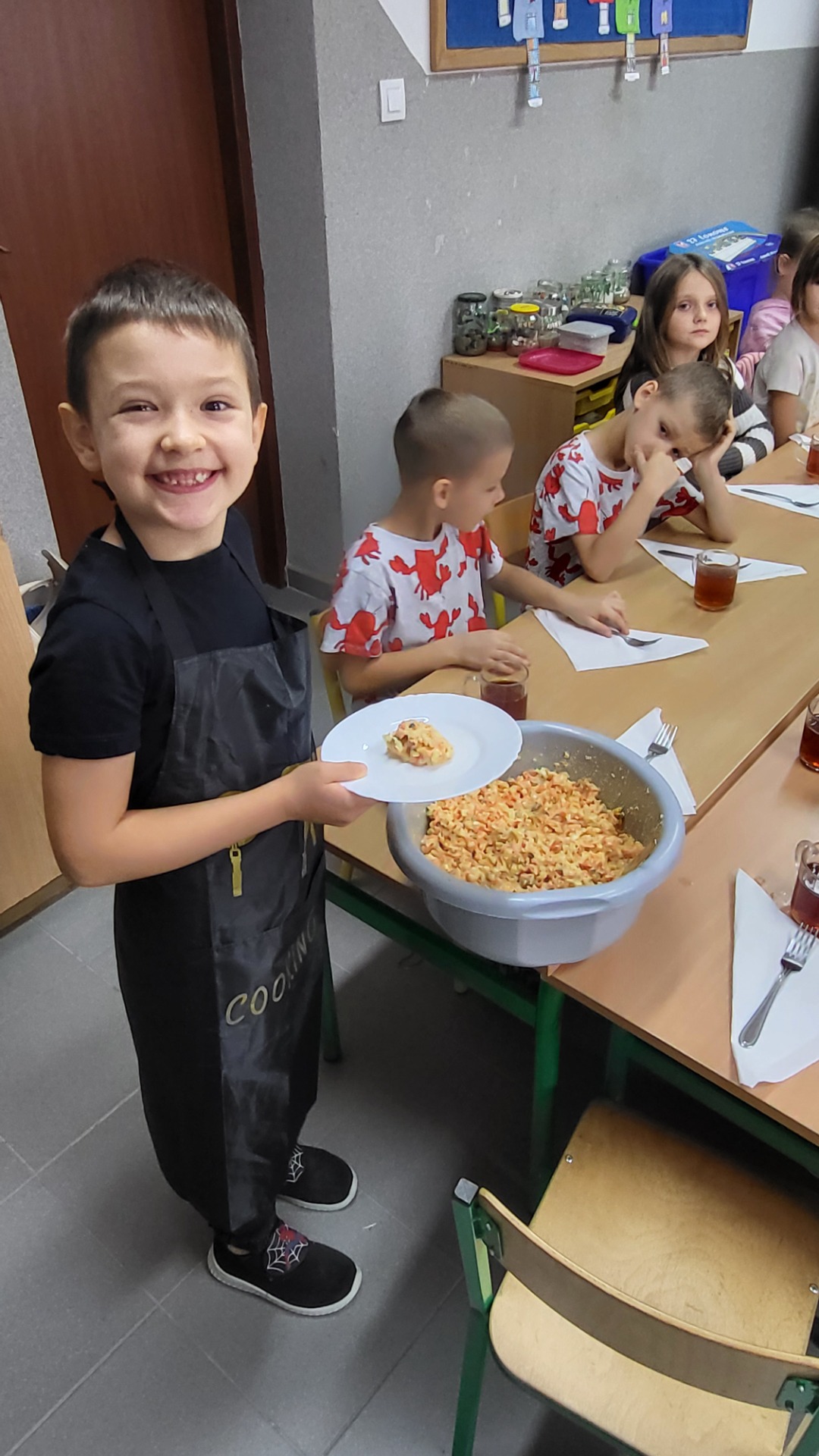Dzieci z klasy pierwszej miały okazję przekonać się, że zdrowe jedzenie może być nie tylko pożyteczne, ale i smaczne. Podczas zajęć kulinarnych wspólnie przygotowały sałatkę jarzynową. Dzięki współpracy powstała kolorowa, pełna witamin potrawa, którą wszyscy z apetytem degustowali. Zajęcia były nie tylko świetną zabawą, ale również okazją do utrwalenia zasad zdrowego odżywiania oraz nauki bezpiecznego posługiwania się narzędziami kuchennymi. Dzieci uczyły się także zasad savoir vivre podczas spożywania posiłków. Na zakończenie wszyscy zgodnie stwierdzili, że własnoręcznie przygotowana sałatka smakuje najlepiej.