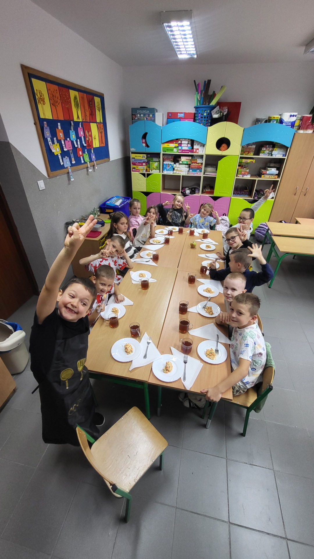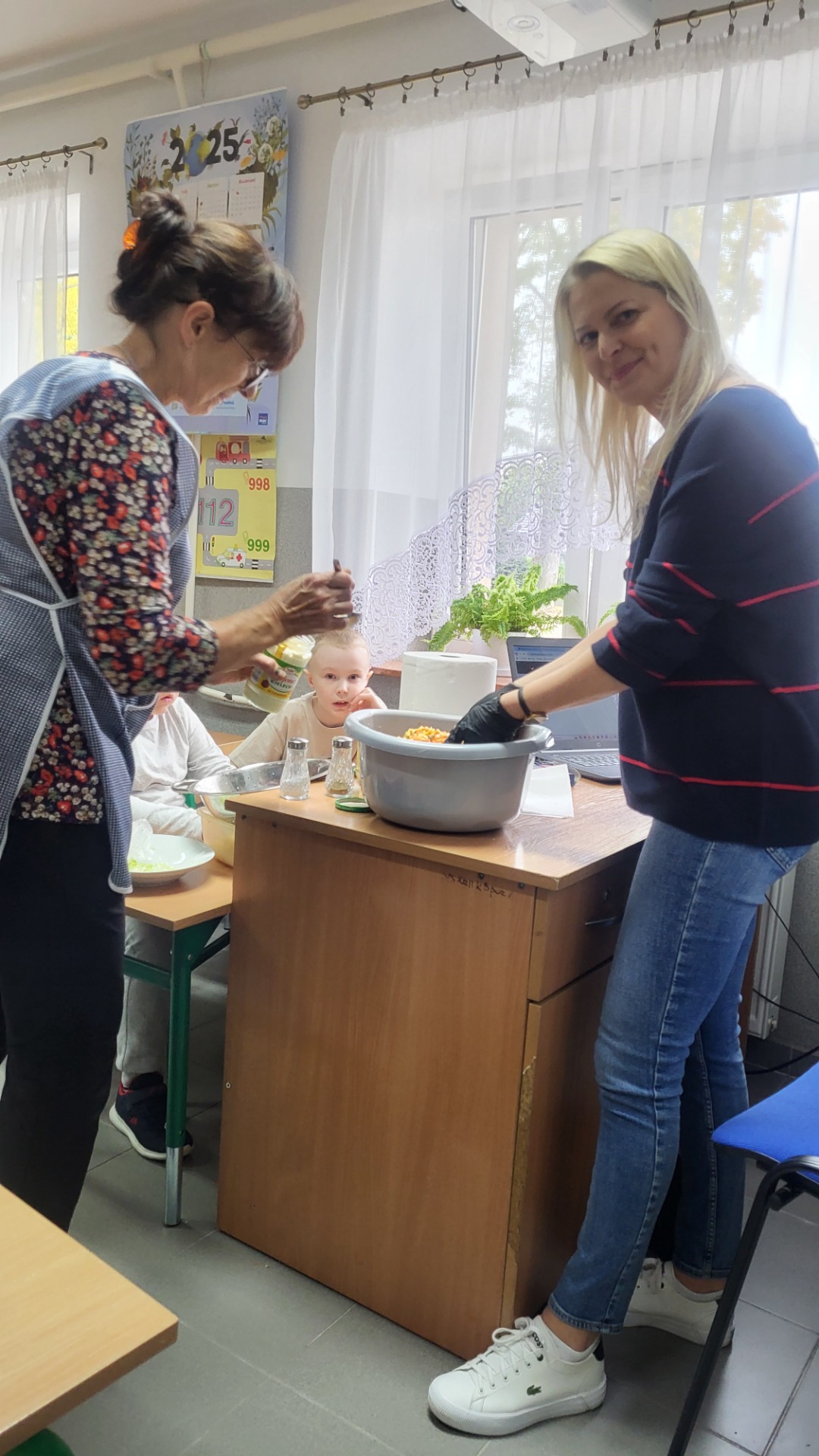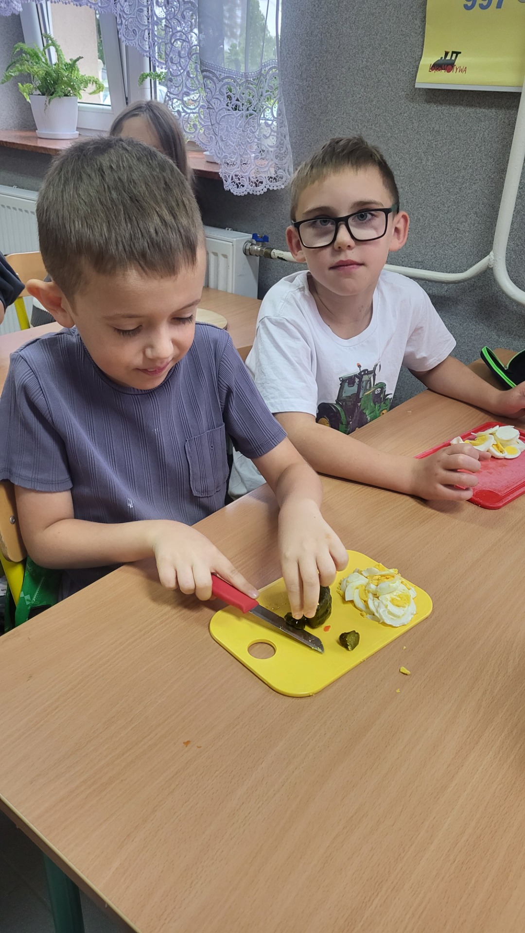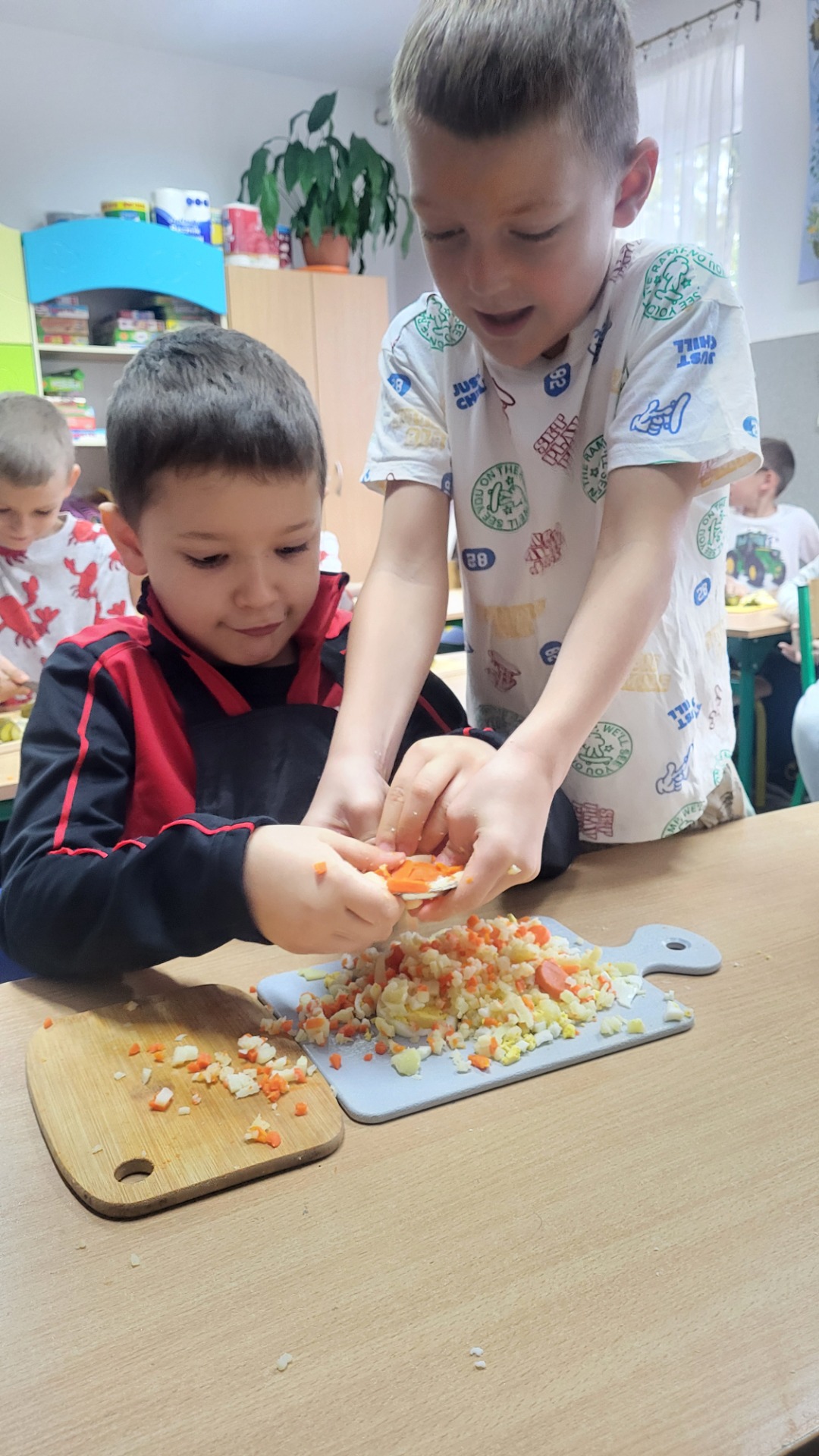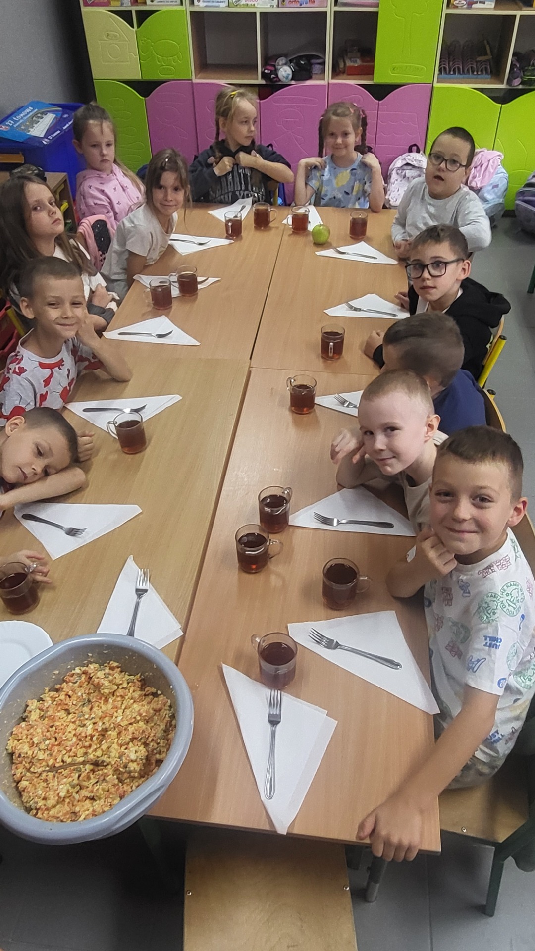 Dzieci z klasy pierwszej miały okazję przekonać się, że zdrowe jedzenie może być nie tylko pożyteczne, ale i smaczne. Podczas zajęć kulinarnych wspólnie przygotowały sałatkę jarzynową. Dzięki współpracy powstała kolorowa, pełna witamin potrawa, którą wszyscy z apetytem degustowali. Zajęcia były nie tylko świetną zabawą, ale również okazją do utrwalenia zasad zdrowego odżywiania oraz nauki bezpiecznego posługiwania się narzędziami kuchennymi. Dzieci uczyły się także zasad savoir vivre podczas spożywania posiłków. Na zakończenie wszyscy zgodnie stwierdzili, że własnoręcznie przygotowana sałatka smakuje najlepiej.