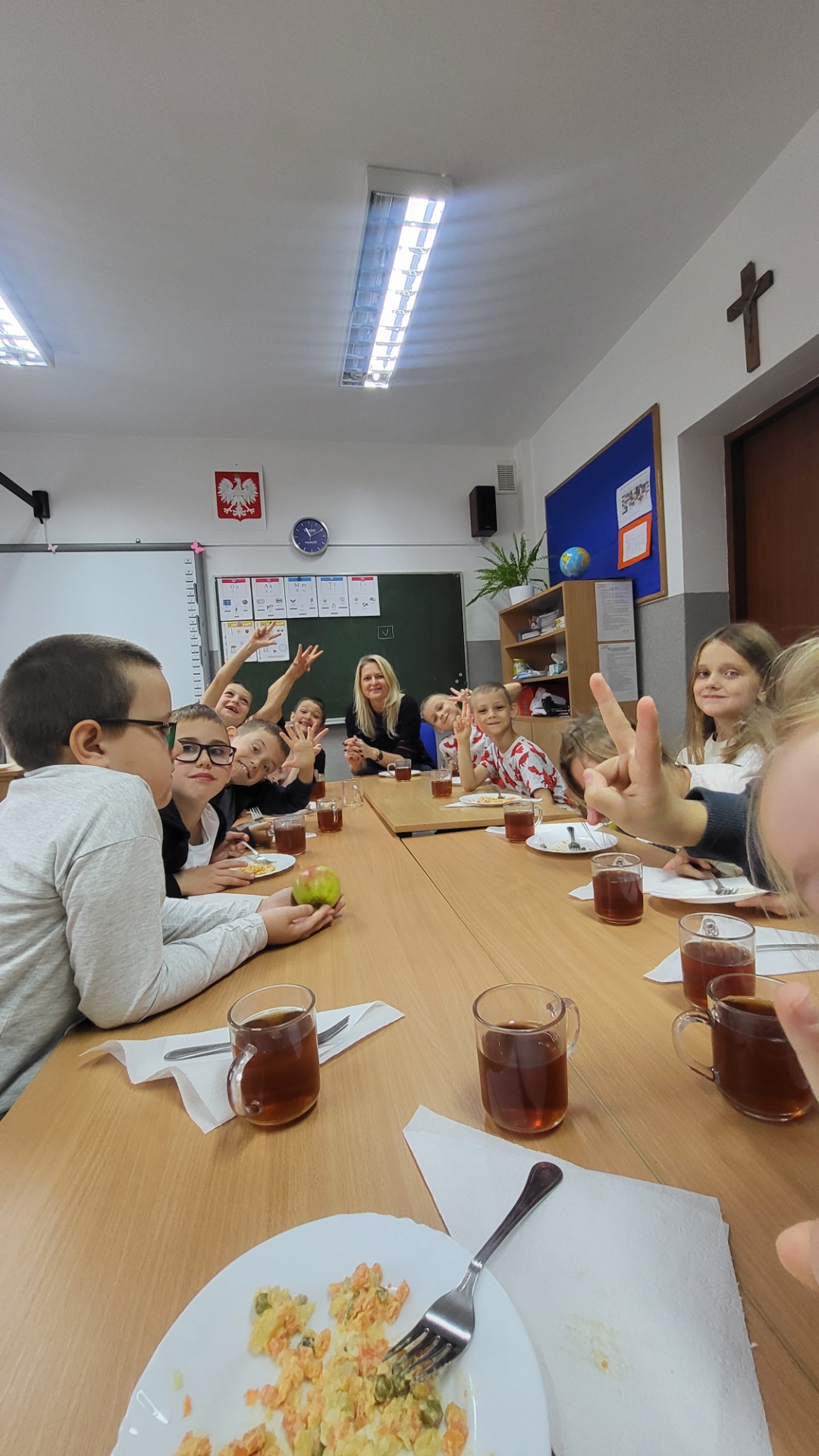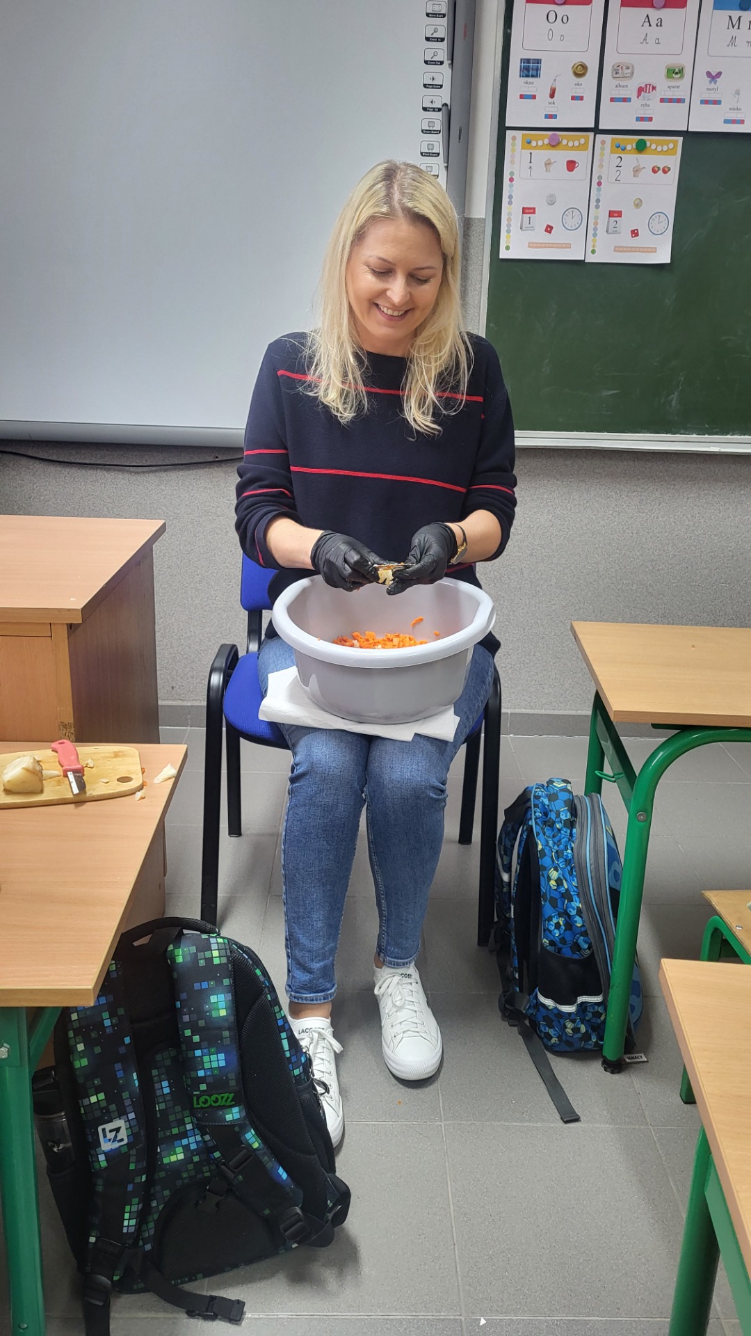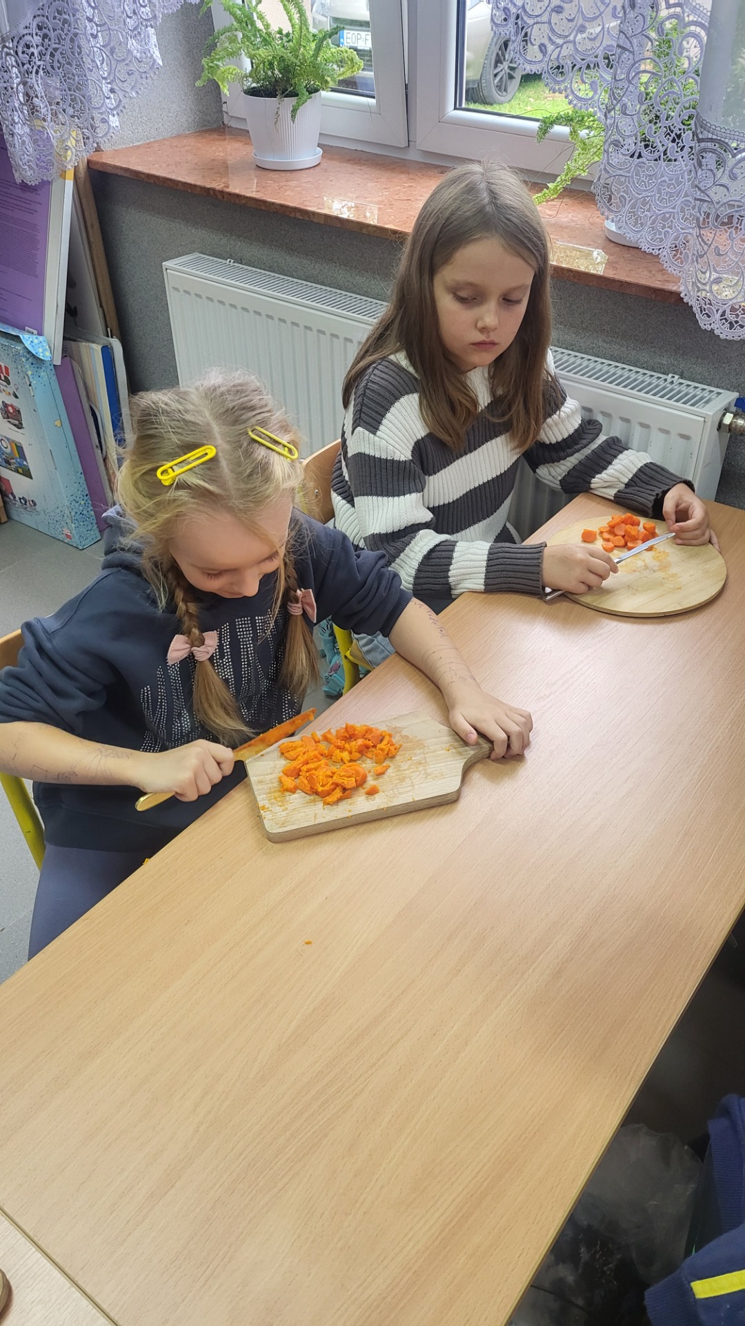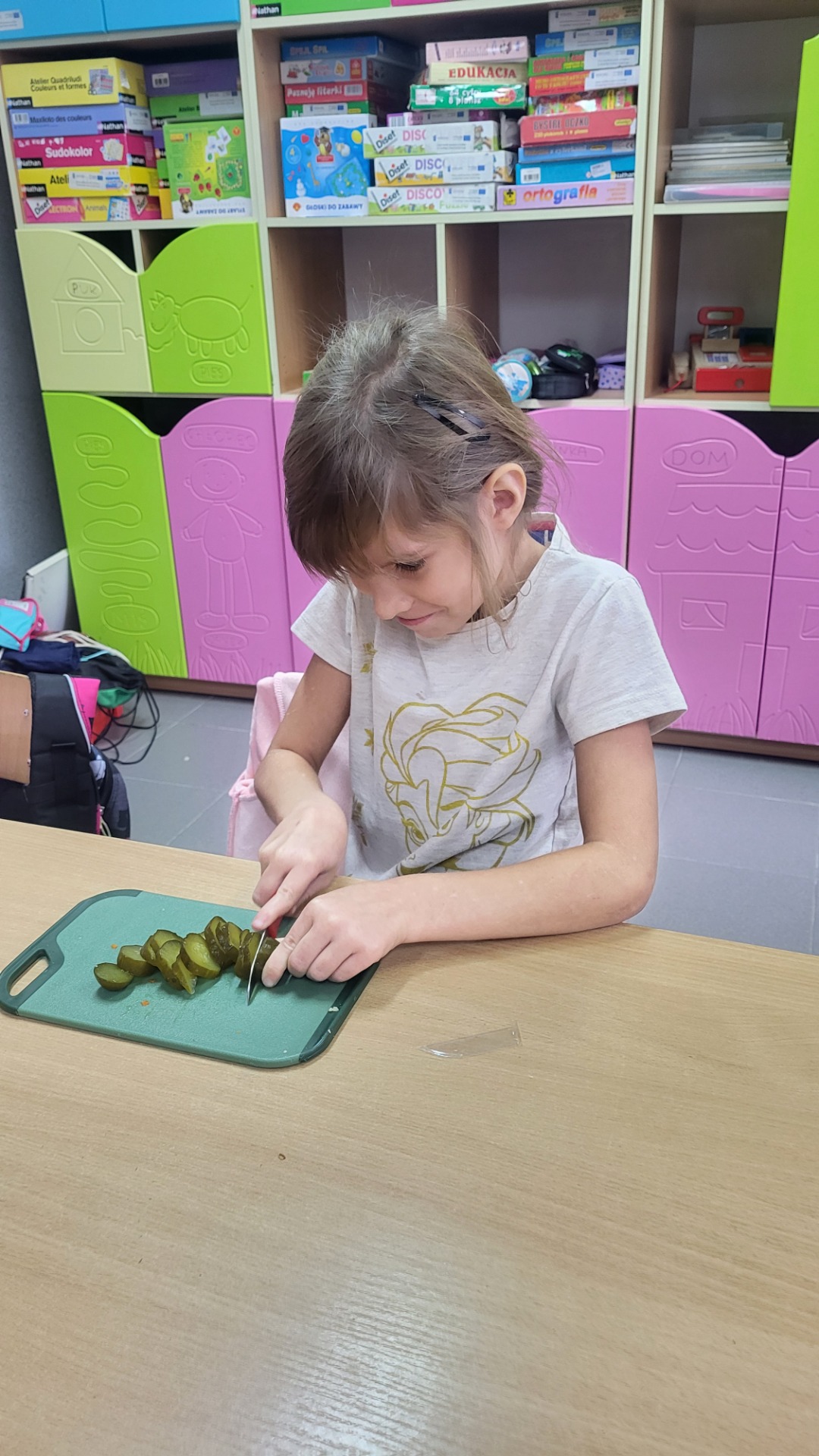 Dzieci z klasy pierwszej miały okazję przekonać się, że zdrowe jedzenie może być nie tylko pożyteczne, ale i smaczne. Podczas zajęć kulinarnych wspólnie przygotowały sałatkę jarzynową. Dzięki współpracy powstała kolorowa, pełna witamin potrawa, którą wszyscy z apetytem degustowali. Zajęcia były nie tylko świetną zabawą, ale również okazją do utrwalenia zasad zdrowego odżywiania oraz nauki bezpiecznego posługiwania się narzędziami kuchennymi. Dzieci uczyły się także zasad savoir vivre podczas spożywania posiłków. Na zakończenie wszyscy zgodnie stwierdzili, że własnoręcznie przygotowana sałatka smakuje najlepiej.