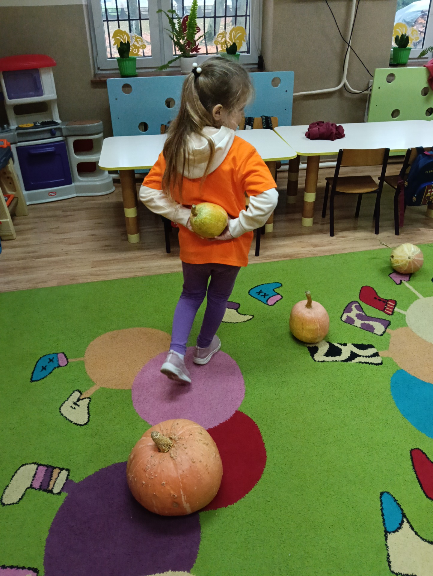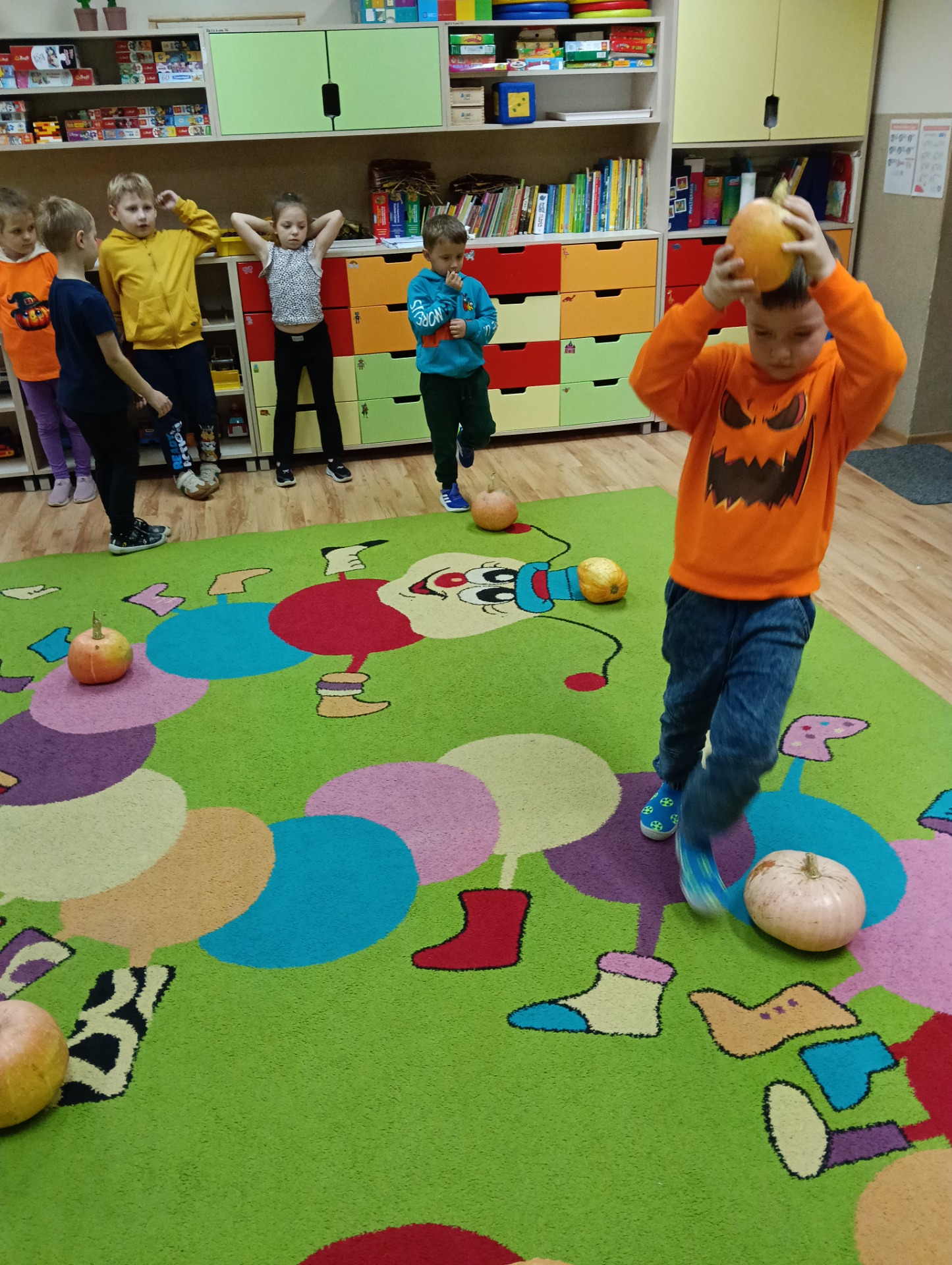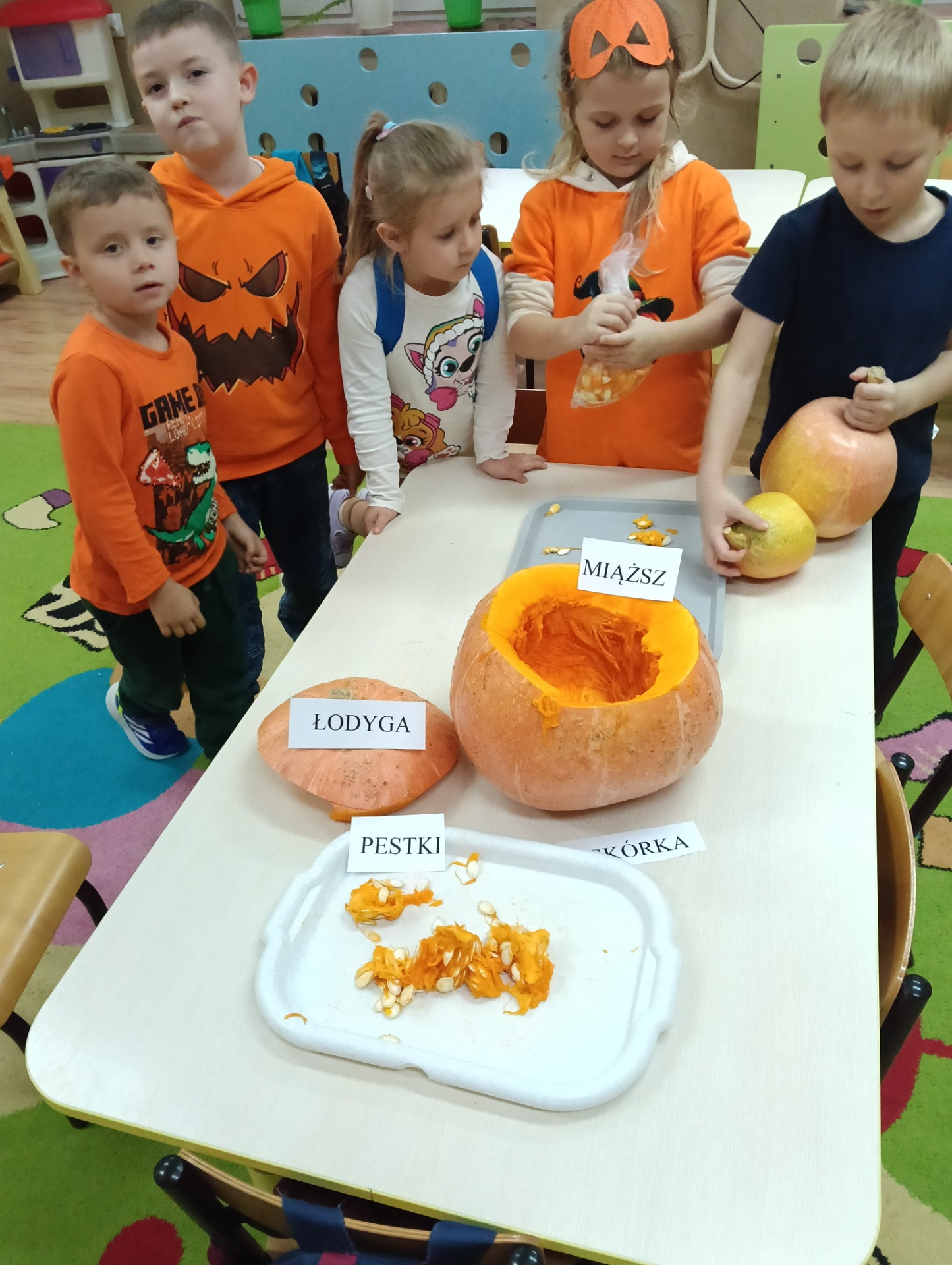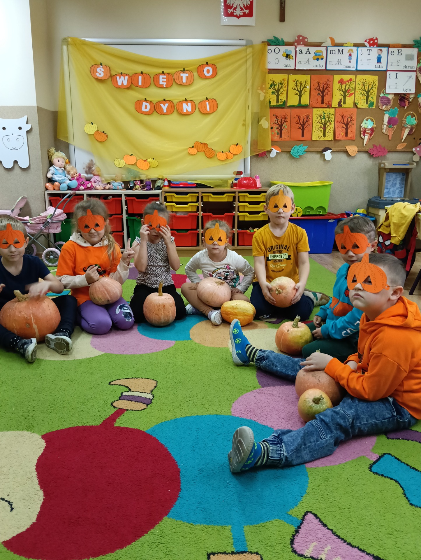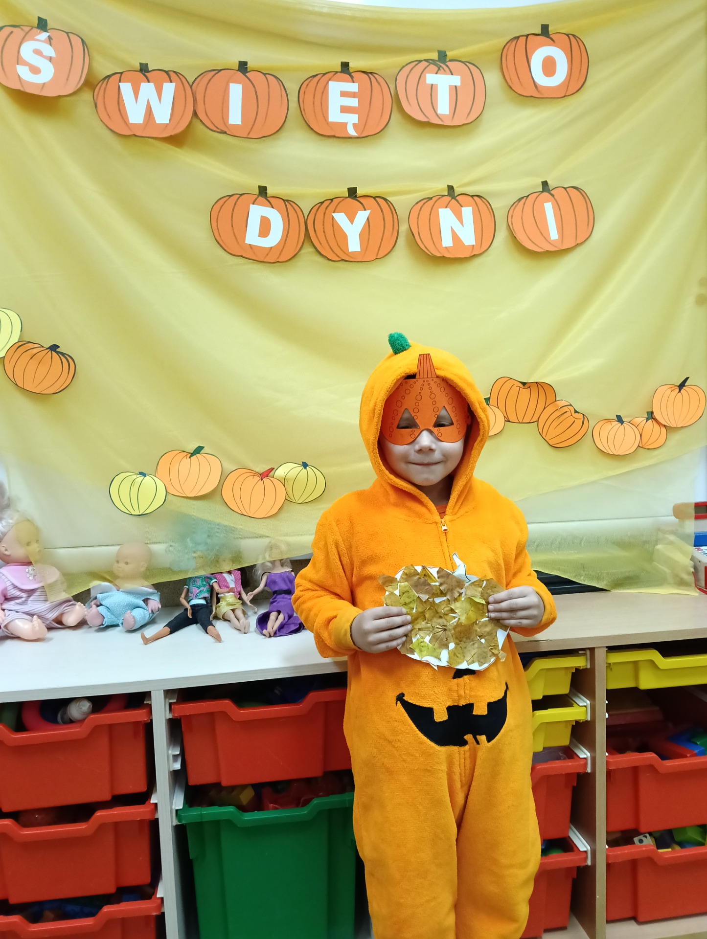 Dnia 3 listopada w naszym oddziale przedszkolnym obchodziliśmy "Dzień Dyni". W tym dniu dominował kolor pomarańczowy. Na zajęciach edukacyjnych przedszkolaki dowiedziały się jak wygląda dynia z zewnątrz i od środka za pomocą zmysłów (węch, dotyk, smak). Przyjrzeliśmy się dokładnie z jakich nasion rośnie oraz jakie potrawy można przygotować z wykorzystaniem dyni. Spróbowaliśmy także nasion z dyni, które okazały się bardzo smaczne. Były również zabawy dyniowe oparte na muzyce i ruchu, m.in.: "Wędrująca dynia", "Co mnie ominie, gdy przegapię dynię" oraz "Dyniowe zawody". Dodatkowo, przedszkolaki rozwijały kompetencje matematyczne poprzez udział w zabawie: "Dyniowe łamigłówki", dzieci kształtowały umiejętność klasyfikowania dyń według wielkości i koloru. Określali ile jest dyń, przeliczali dynie posługując się liczebnikami porządkowymi oraz porównywania dyń w zbiorach (mniej, więcej, tyle samo). Tego dnia dzieci wykonały również prace plastyczne z wykorzystaniem jesiennych barw liści, które stały się ozdobą naszego przedszkola.