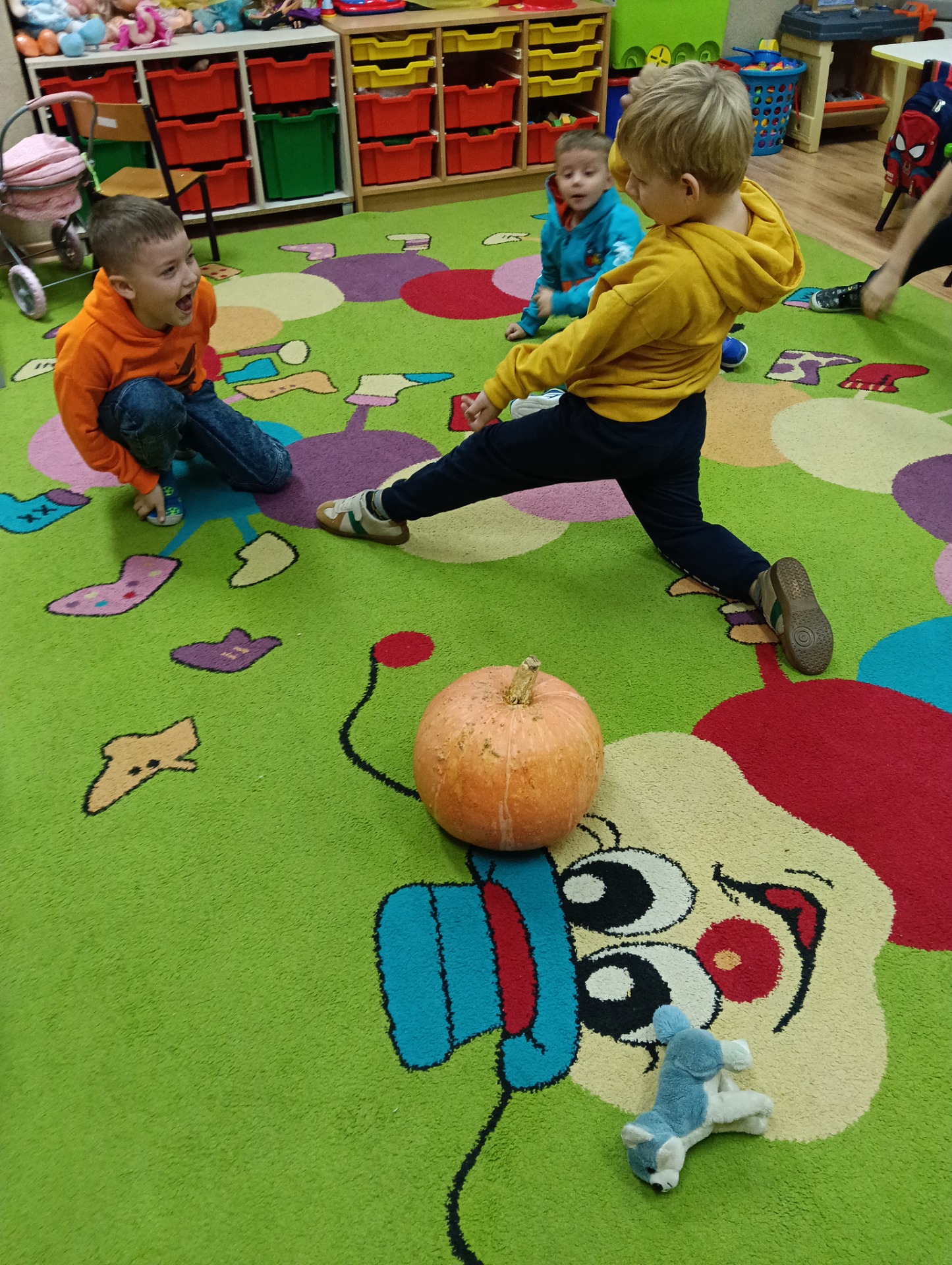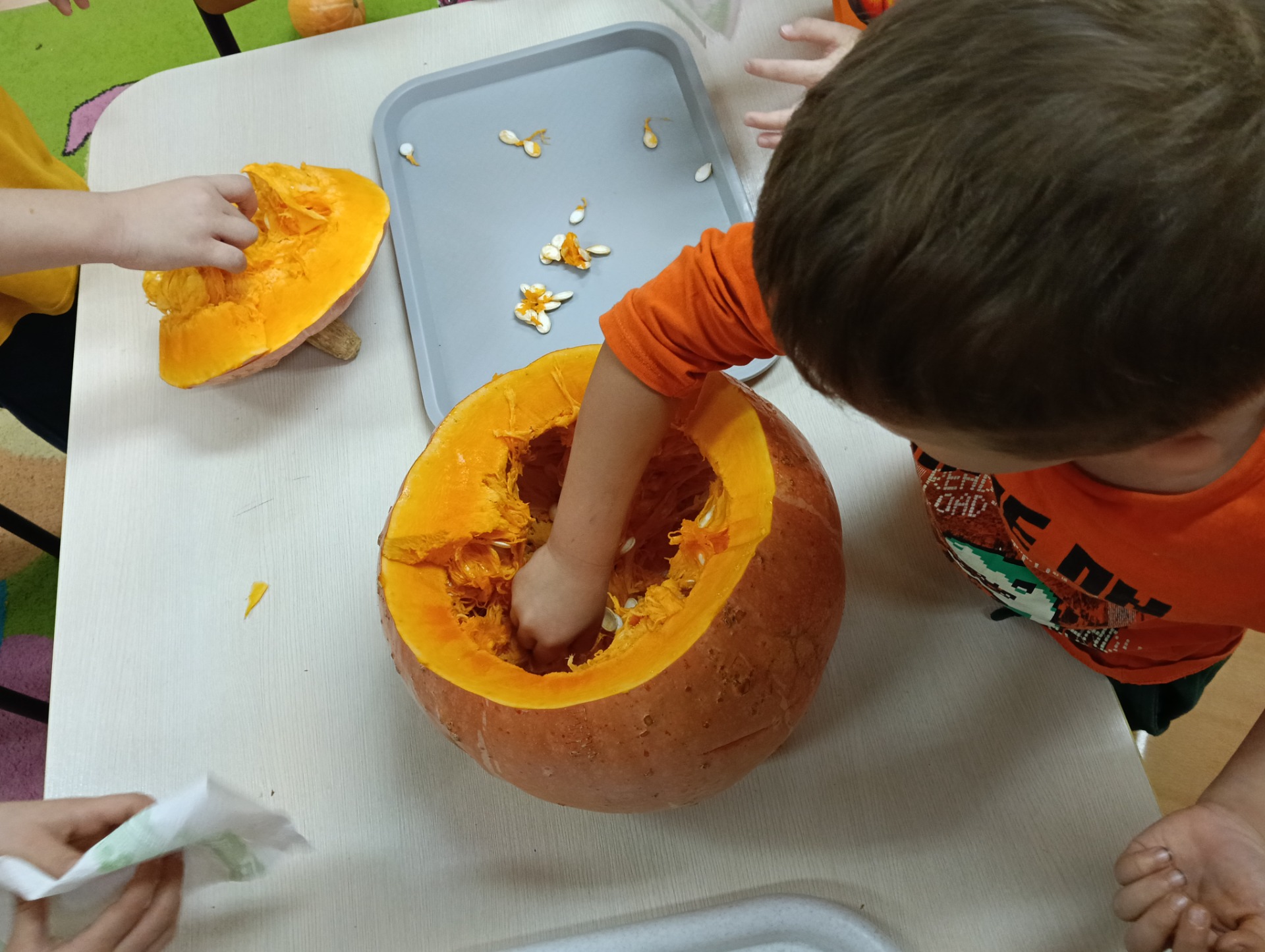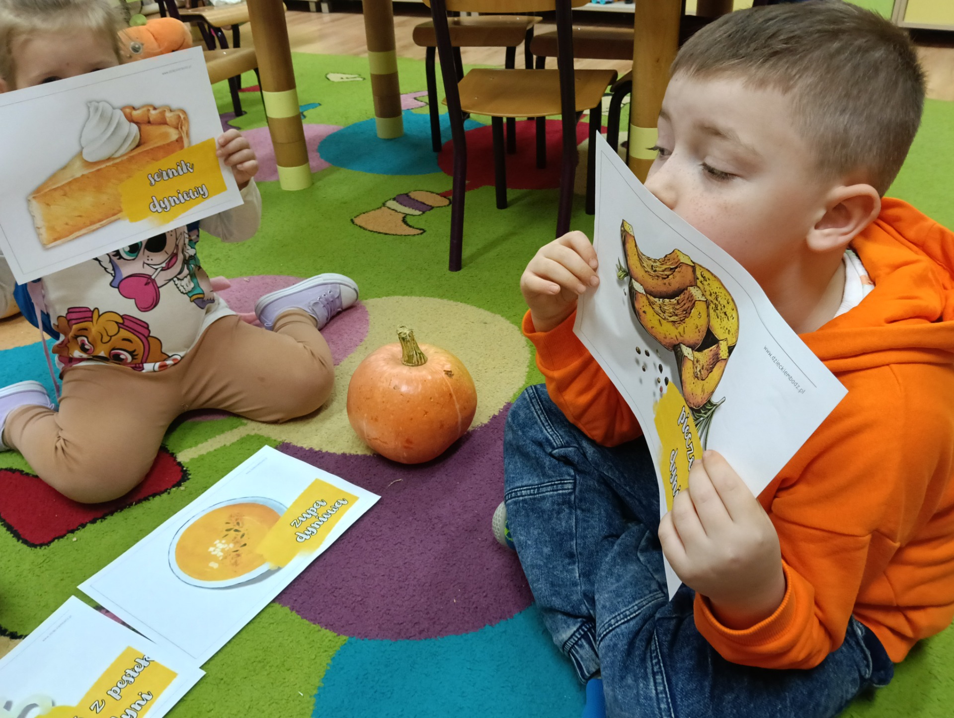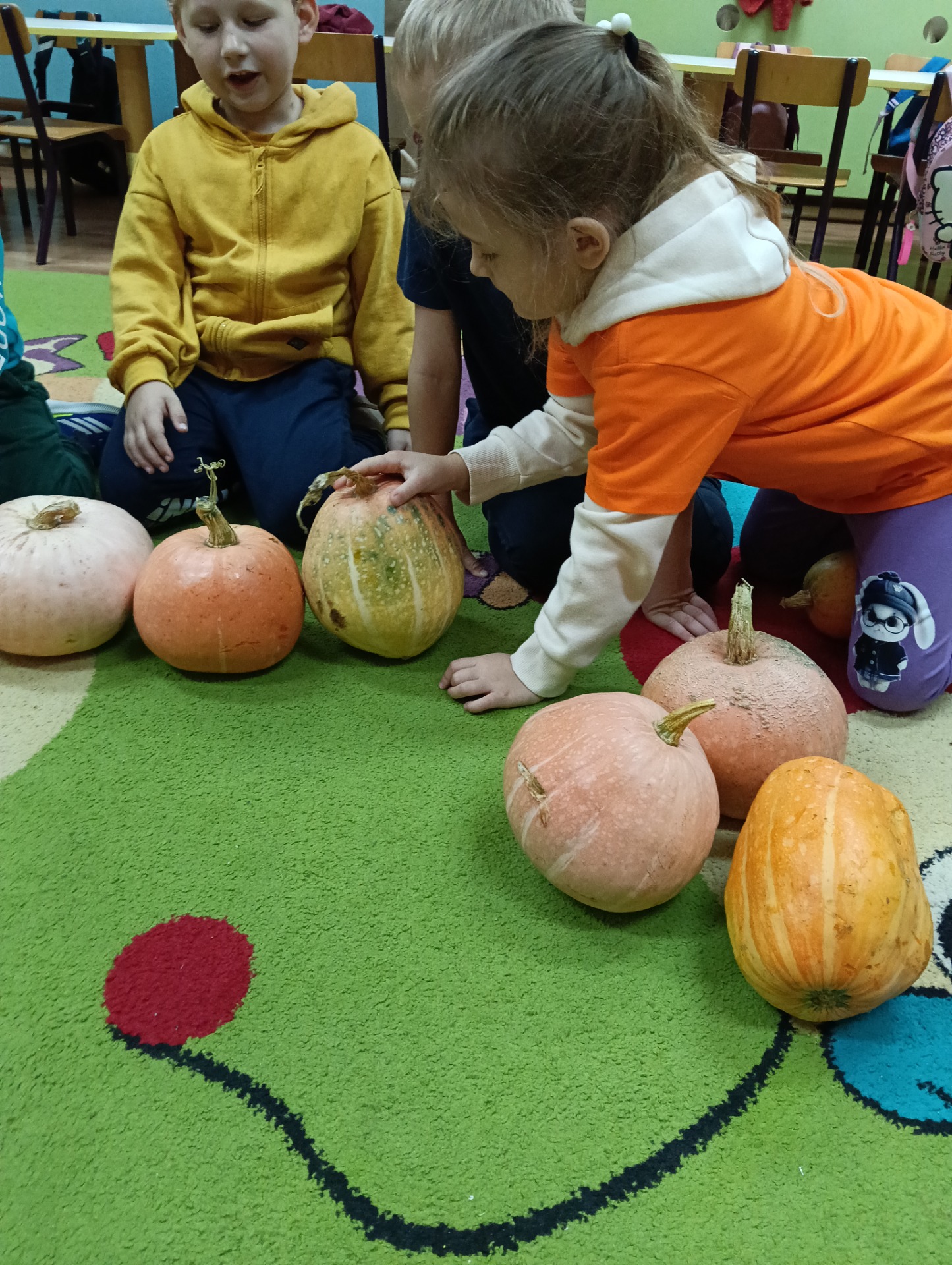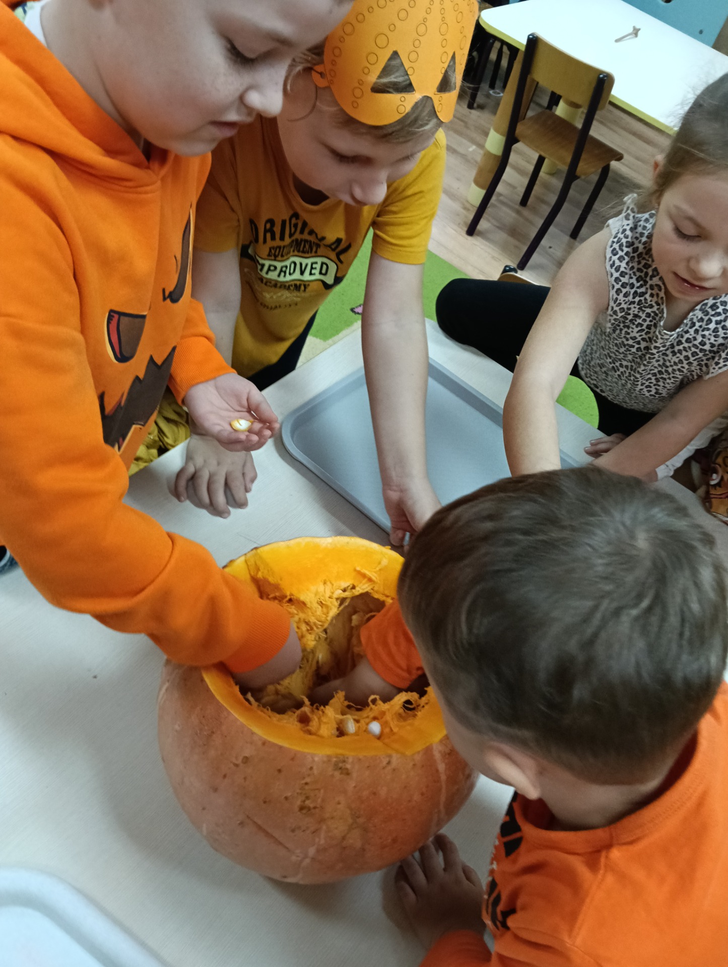 Dnia 3 listopada w naszym oddziale przedszkolnym obchodziliśmy "Dzień Dyni". W tym dniu dominował kolor pomarańczowy. Na zajęciach edukacyjnych przedszkolaki dowiedziały się jak wygląda dynia z zewnątrz i od środka za pomocą zmysłów (węch, dotyk, smak). Przyjrzeliśmy się dokładnie z jakich nasion rośnie oraz jakie potrawy można przygotować z wykorzystaniem dyni. Spróbowaliśmy także nasion z dyni, które okazały się bardzo smaczne. Były również zabawy dyniowe oparte na muzyce i ruchu, m.in.: "Wędrująca dynia", "Co mnie ominie, gdy przegapię dynię" oraz "Dyniowe zawody". Dodatkowo, przedszkolaki rozwijały kompetencje matematyczne poprzez udział w zabawie: "Dyniowe łamigłówki", dzieci kształtowały umiejętność klasyfikowania dyń według wielkości i koloru. Określali ile jest dyń, przeliczali dynie posługując się liczebnikami porządkowymi oraz porównywania dyń w zbiorach (mniej, więcej, tyle samo). Tego dnia dzieci wykonały również prace plastyczne z wykorzystaniem jesiennych barw liści, które stały się ozdobą naszego przedszkola.