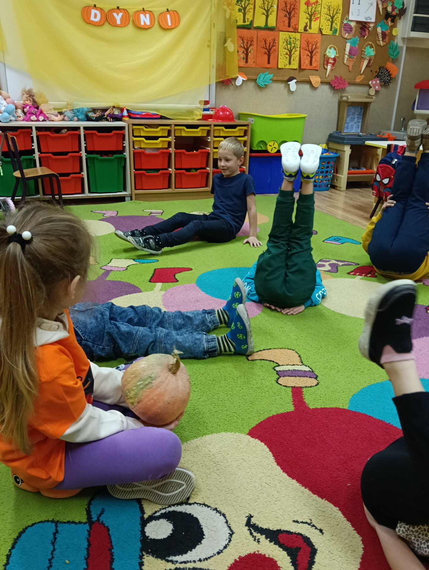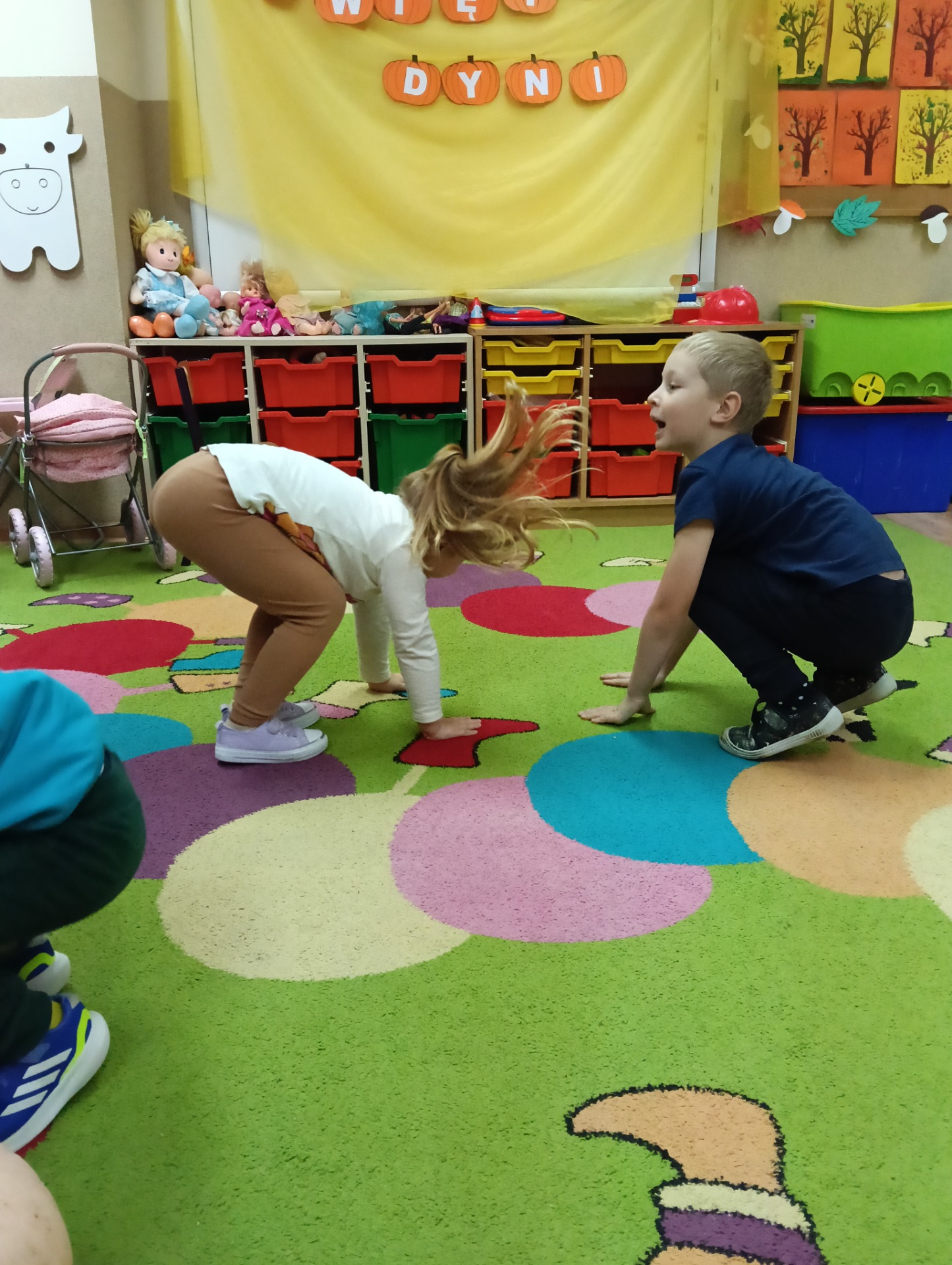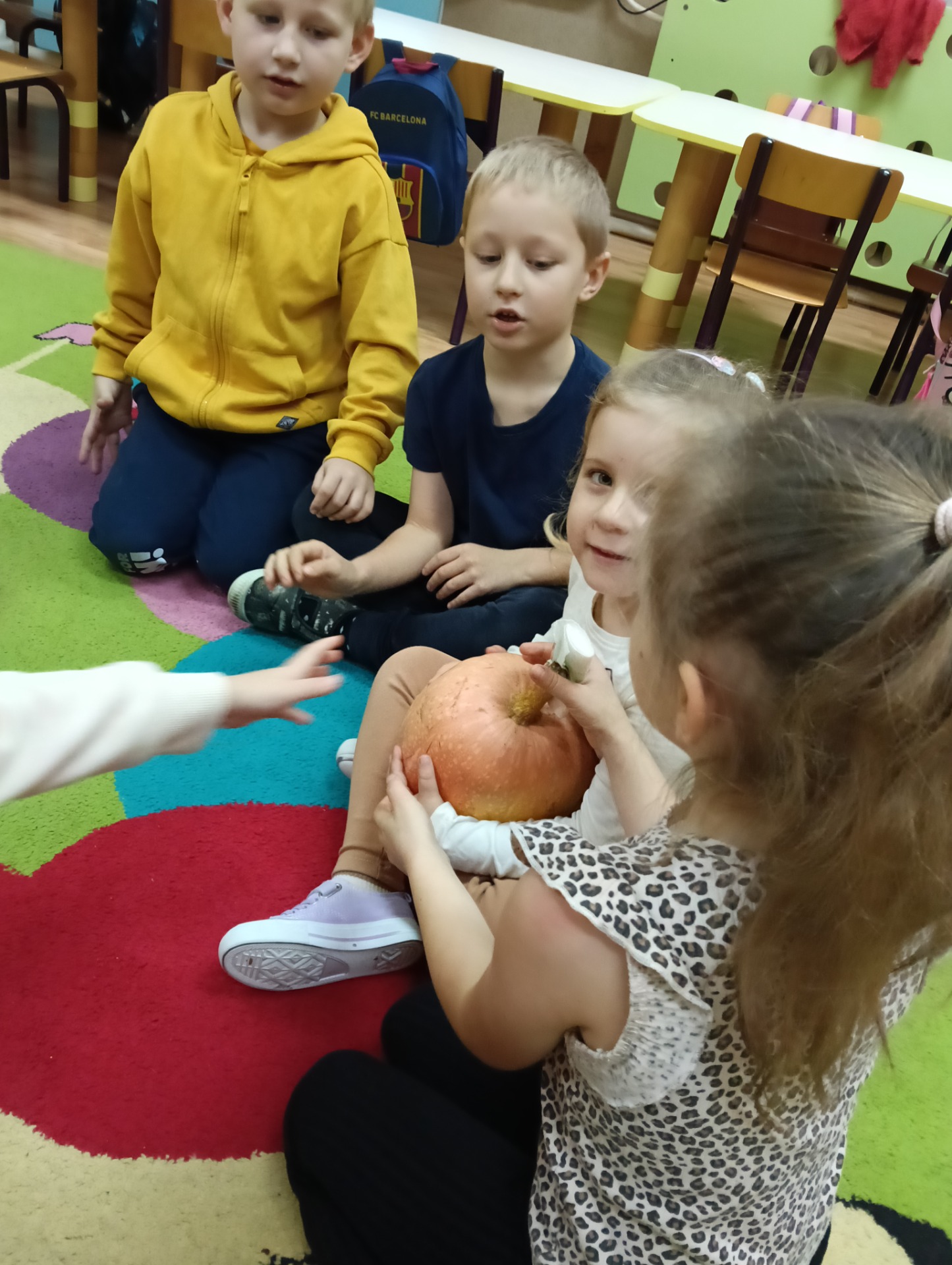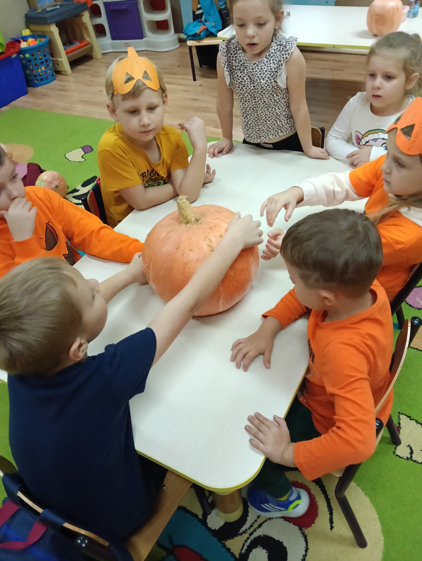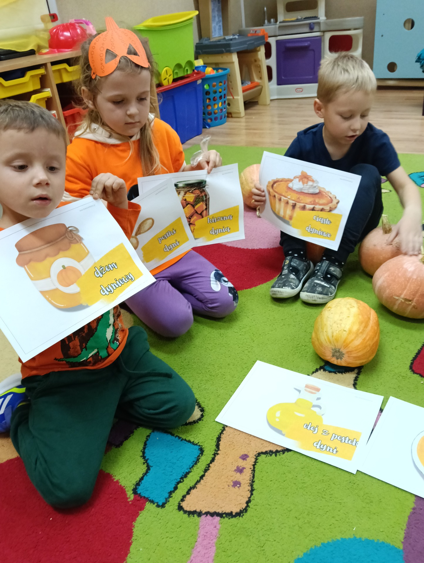 Dnia 3 listopada w naszym oddziale przedszkolnym obchodziliśmy "Dzień Dyni". W tym dniu dominował kolor pomarańczowy. Na zajęciach edukacyjnych przedszkolaki dowiedziały się jak wygląda dynia z zewnątrz i od środka za pomocą zmysłów (węch, dotyk, smak). Przyjrzeliśmy się dokładnie z jakich nasion rośnie oraz jakie potrawy można przygotować z wykorzystaniem dyni. Spróbowaliśmy także nasion z dyni, które okazały się bardzo smaczne. Były również zabawy dyniowe oparte na muzyce i ruchu, m.in.: "Wędrująca dynia", "Co mnie ominie, gdy przegapię dynię" oraz "Dyniowe zawody". Dodatkowo, przedszkolaki rozwijały kompetencje matematyczne poprzez udział w zabawie: "Dyniowe łamigłówki", dzieci kształtowały umiejętność klasyfikowania dyń według wielkości i koloru. Określali ile jest dyń, przeliczali dynie posługując się liczebnikami porządkowymi oraz porównywania dyń w zbiorach (mniej, więcej, tyle samo). Tego dnia dzieci wykonały również prace plastyczne z wykorzystaniem jesiennych barw liści, które stały się ozdobą naszego przedszkola.