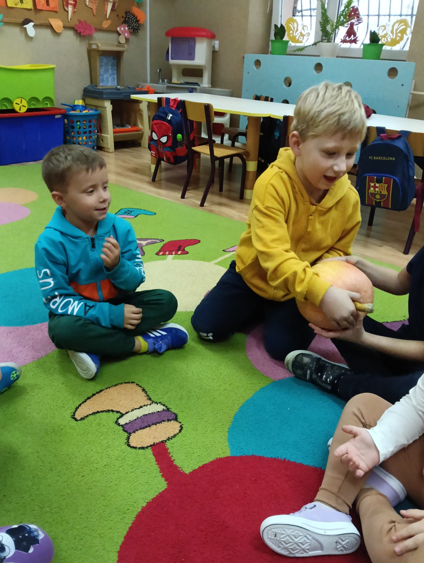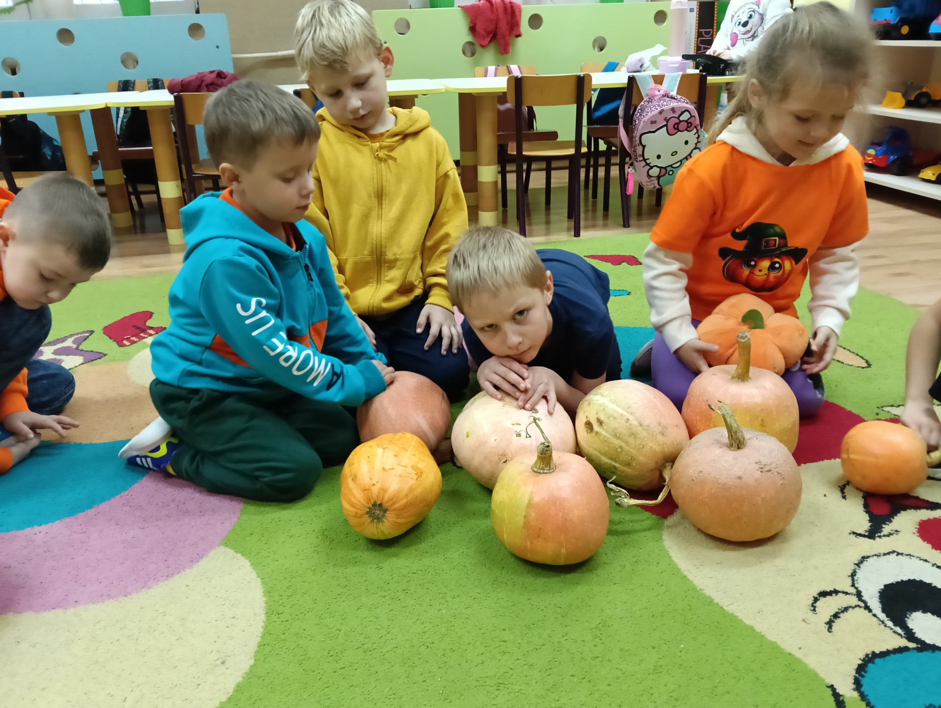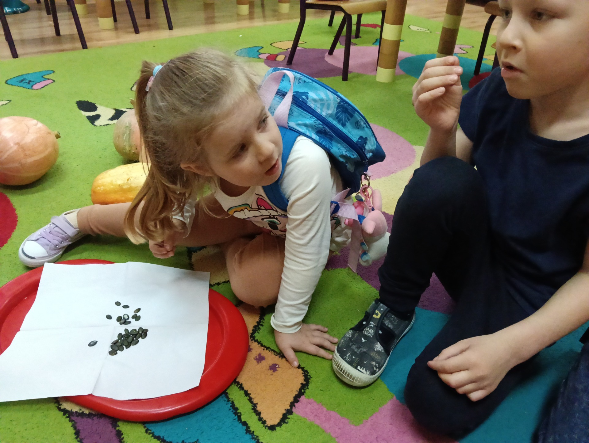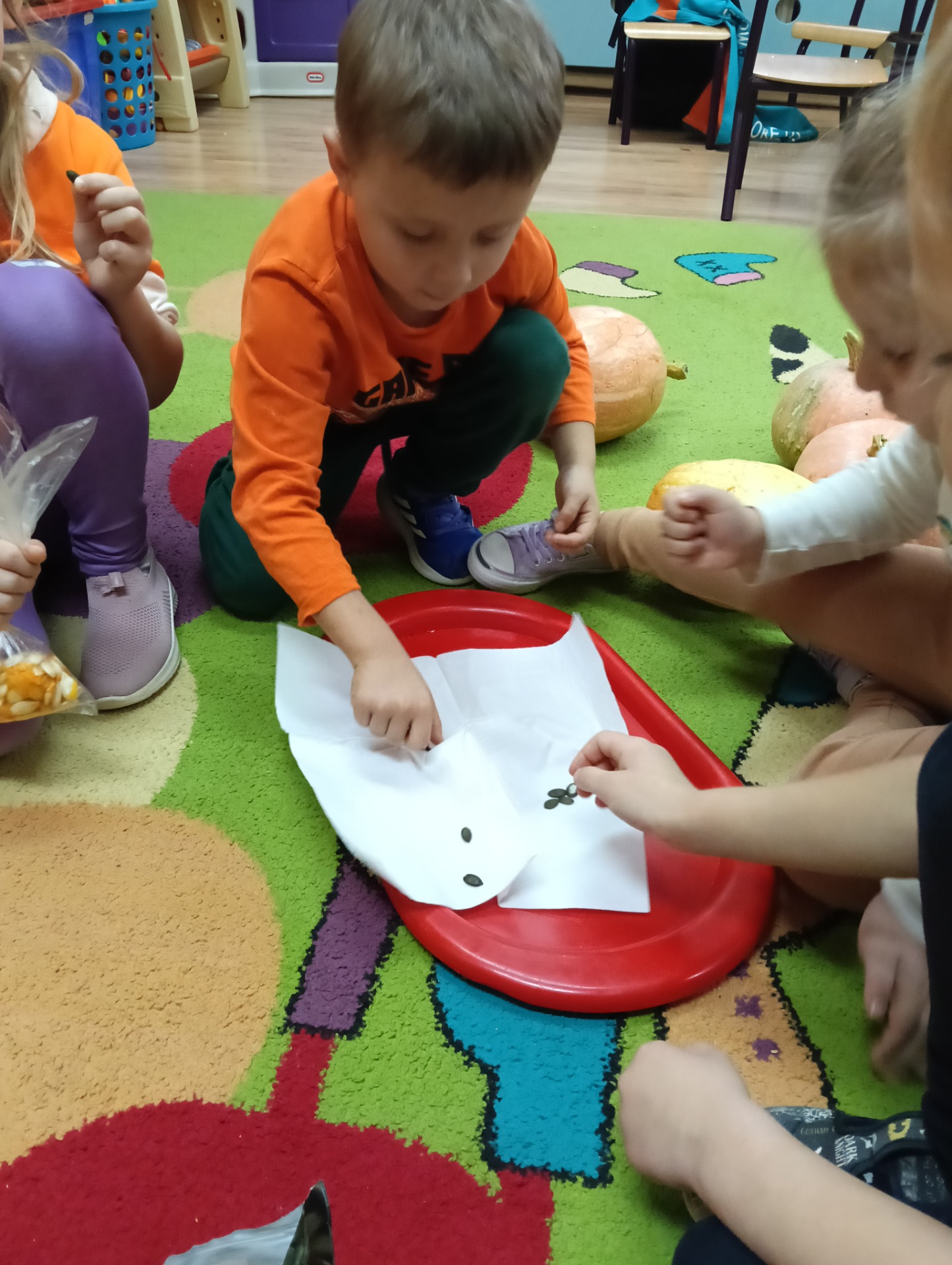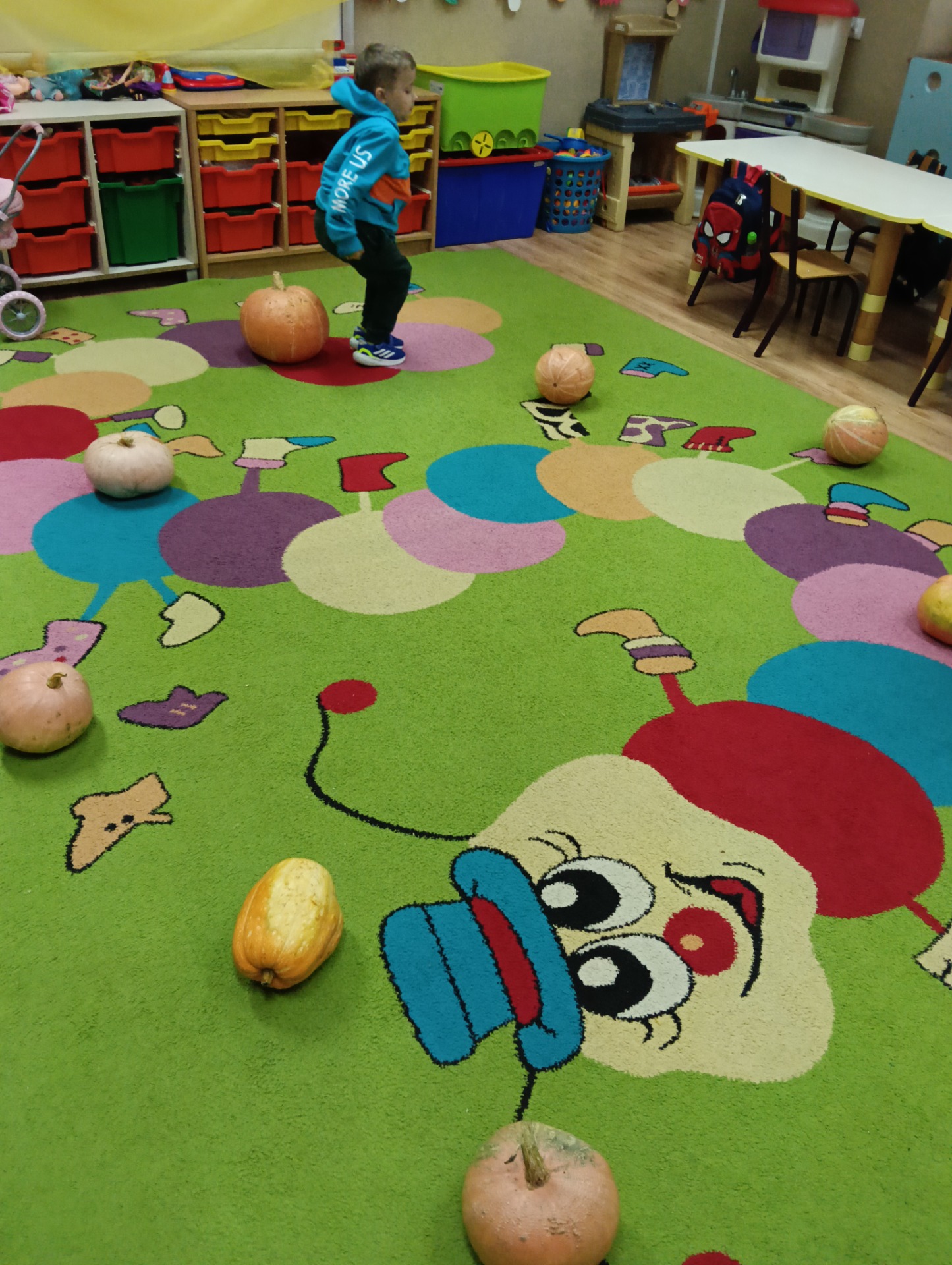 Dnia 3 listopada w naszym oddziale przedszkolnym obchodziliśmy "Dzień Dyni". W tym dniu dominował kolor pomarańczowy. Na zajęciach edukacyjnych przedszkolaki dowiedziały się jak wygląda dynia z zewnątrz i od środka za pomocą zmysłów (węch, dotyk, smak). Przyjrzeliśmy się dokładnie z jakich nasion rośnie oraz jakie potrawy można przygotować z wykorzystaniem dyni. Spróbowaliśmy także nasion z dyni, które okazały się bardzo smaczne. Były również zabawy dyniowe oparte na muzyce i ruchu, m.in.: "Wędrująca dynia", "Co mnie ominie, gdy przegapię dynię" oraz "Dyniowe zawody". Dodatkowo, przedszkolaki rozwijały kompetencje matematyczne poprzez udział w zabawie: "Dyniowe łamigłówki", dzieci kształtowały umiejętność klasyfikowania dyń według wielkości i koloru. Określali ile jest dyń, przeliczali dynie posługując się liczebnikami porządkowymi oraz porównywania dyń w zbiorach (mniej, więcej, tyle samo). Tego dnia dzieci wykonały również prace plastyczne z wykorzystaniem jesiennych barw liści, które stały się ozdobą naszego przedszkola.