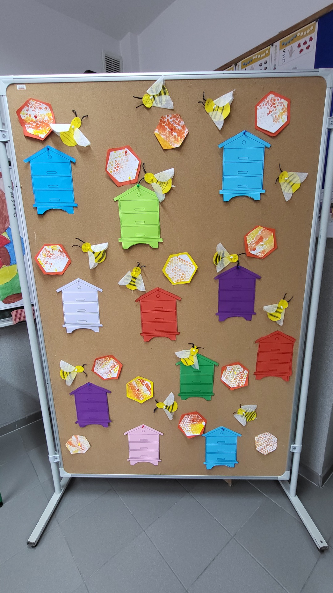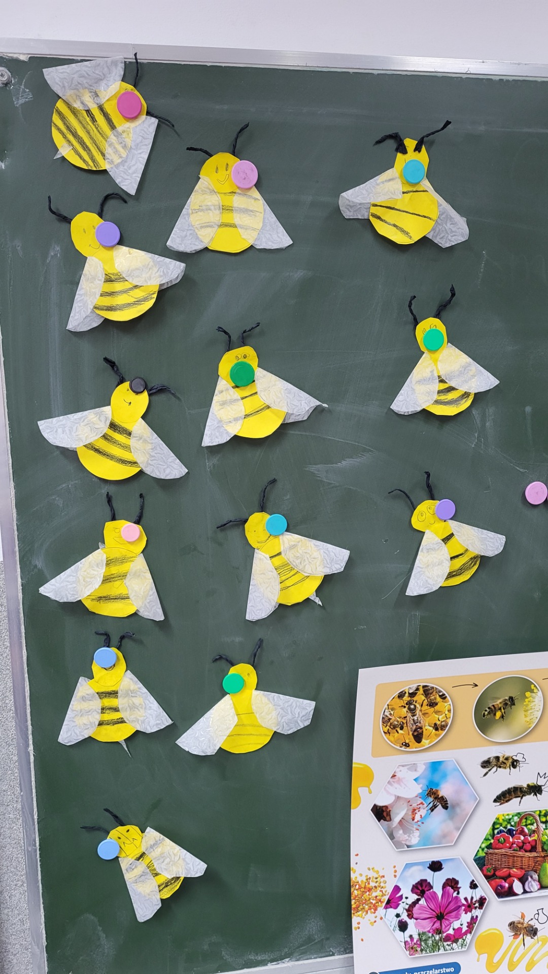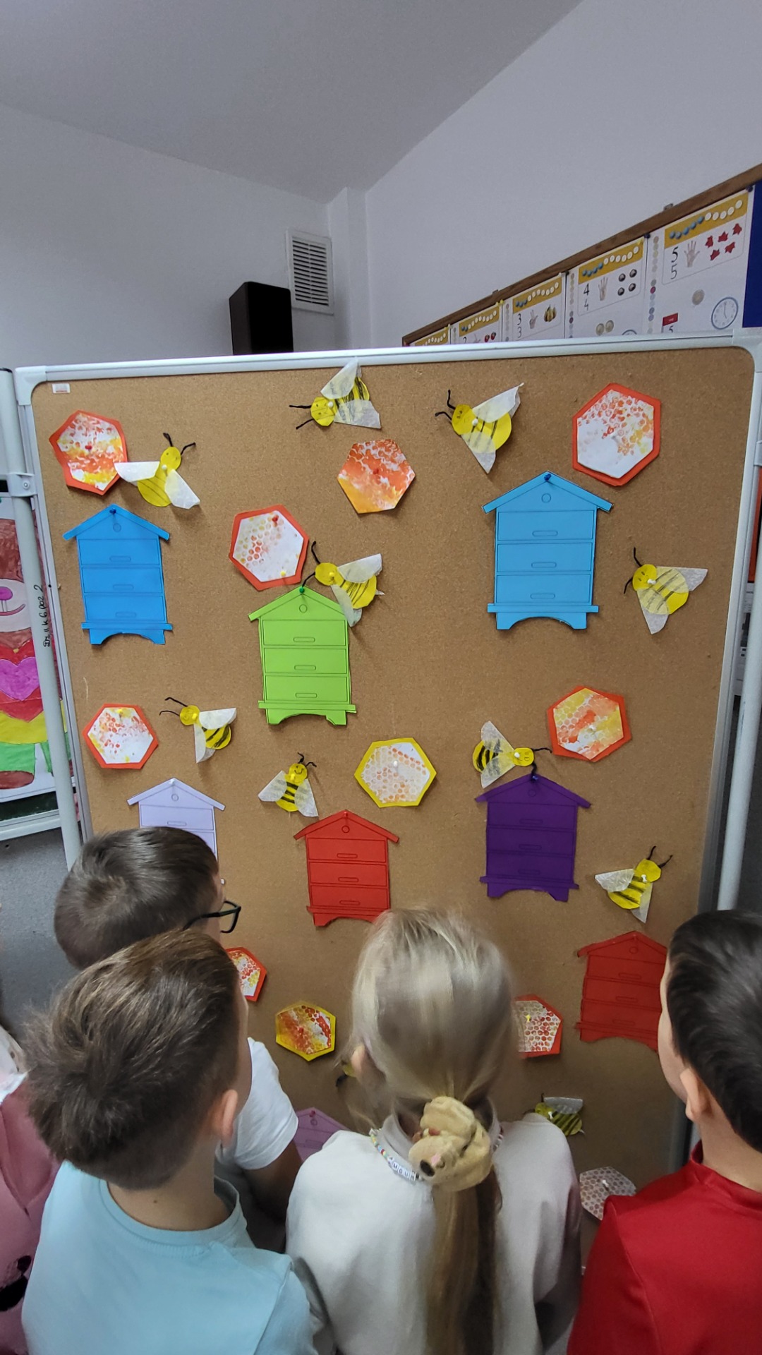 - udział w zajęciach plastyczno-technicznych, podczas których dzieci odbijały strukturę plastra miodu przy użyciu folii bąbelkowej, wykonały pszczółki z papieru oraz doskonaliły motorykę małą wycinając kolorowe ule;